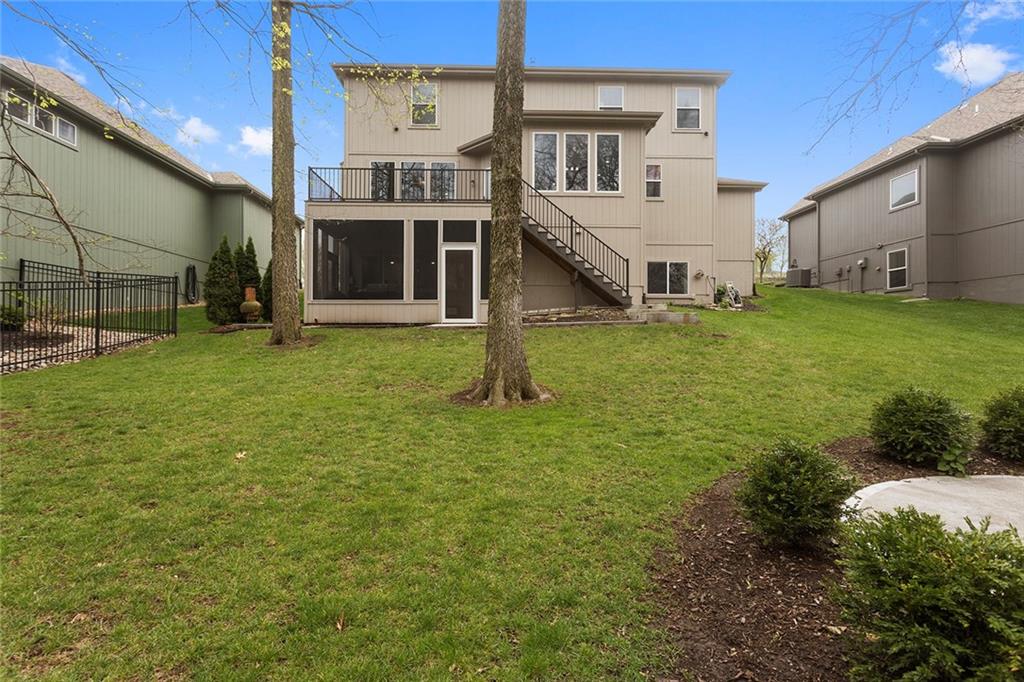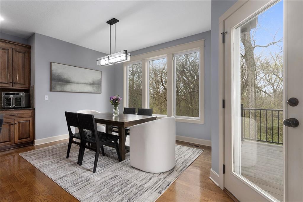 Welcome to this spacious and beautifully appointed two-story home in desirable South Olathe! Offering 5 bedrooms and 3.5 bathrooms, this home combines comfort, functionality, and scenic surroundings. The main level features stunning hard oak wood flooring and an abundance of large windows that fill the space with natural light while showcasing peaceful views of the wooded greenspace behind the home. The inviting living room centers around a cozy fireplace and flows seamlessly into the adjacent kitchen—perfect for both everyday living and entertaining. The kitchen is thoughtfully designed with beautiful cabinetry, granite countertops, and a convenient walk-in pantry. Just off the kitchen, you’ll find a dedicated laundry area for added ease and efficiency. A formal dining room sits at the front of the home, offering a more traditional space for gatherings and special occasions, complete with comfortable carpeting. Upstairs, the bedrooms feature plush carpeting and spacious bathrooms, creating comfortable retreats for family and guests alike. You’re sure to love the finished walkout basement, complete with a 5th bedroom, full bath, and a convenient kitchenette. This space lives like separate quarters—ideal for guests, extended stays, or multi-generational living—and opens directly to the patio, with a composite deck above for even more outdoor enjoyment. Step outside to enjoy the backyard firepit, perfect for relaxing evenings under the stars. Additional upgrades include whole-home sound wiring and programmable exterior holiday lighting for year-round convenience and charm. Don’t miss this opportunity to own a beautiful home on a well-kept lot in a sought-after location!