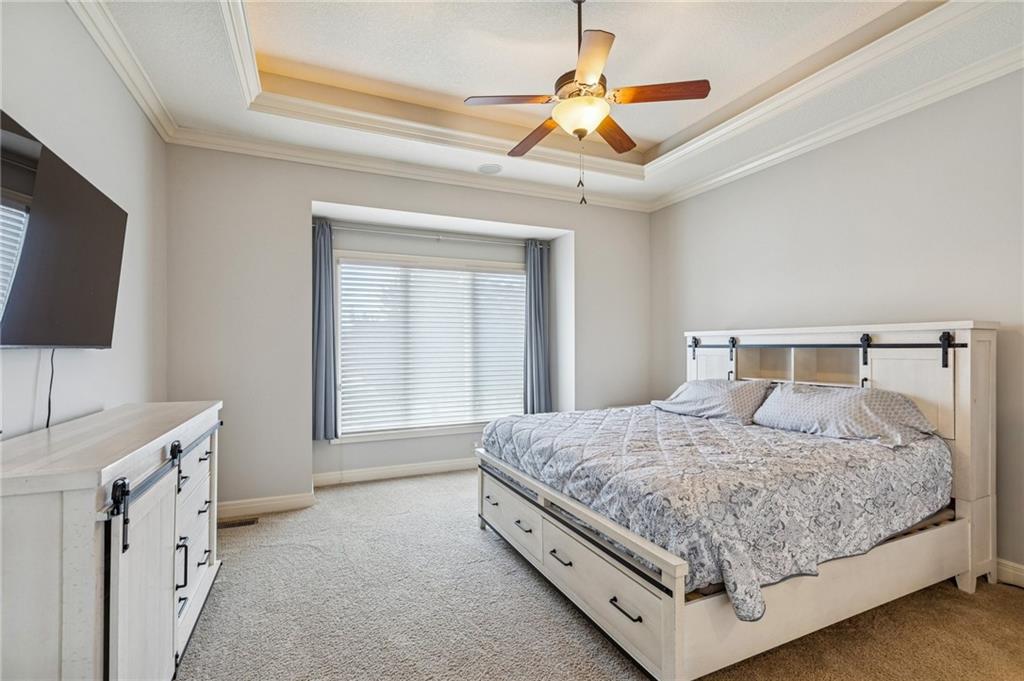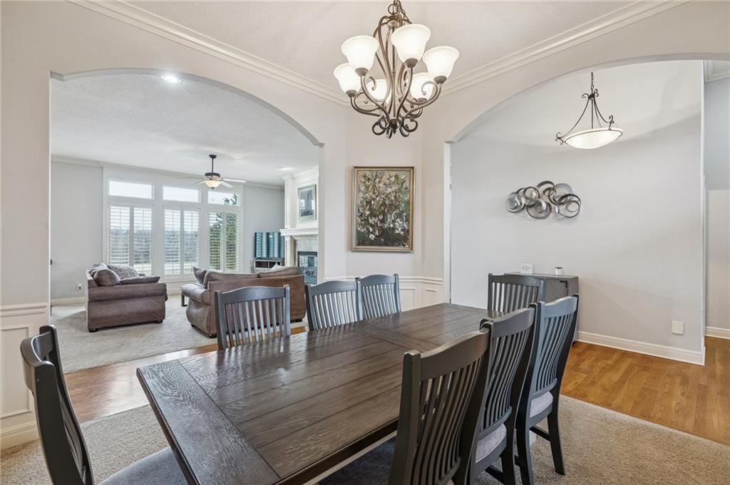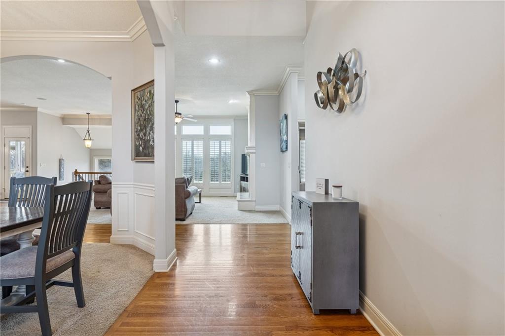 Dreaming of affordable, luxurious living on a private Johnson County golf course? Located in the Estates of Prairie Highlands, this home sits on a premium, fenced golf lot offering the most incredible 11th Fairway and sunset views found within the entire community. This reverse 1 ½ story home offers an open floor plan with spacious rooms throughout. Hardwood flooring in the foyer opens to the large great room appointed with gas fireplace & plantation shutters. The hardwoods continue past the dining room/flex space and into the incredible kitchen with tons of cabinet & counter space plus large (full use) island, and an enormous custom walk-in pantry! The back hall contains a convenient coat closet and laundry room with sink and cabinetry. Off the kitchen's spacious breakfast room is your comfortable screened-in porch overlooking the course and the level, newly fenced backyard--a wonderful spot for a future pool! The primary suite includes a fully tiled walk-in shower, separate jetted tub, double vanities and large walk-in closet. Bedroom #2 and 2nd full bath complete the main level. The lower-level family room offers plenty of space for your Chiefs game day parties featuring a beautiful 2023 Brunswick pool table plus a full walk-behind wet bar and walk-out access to the backyard patio. Two more bedrooms, each with walk-in closets, are connected by a large Jack & Jill bath with dual vanity areas. Recent updates include roof & interior paint (2020), new dishwasher (2022), new toilets (2023), all new primary bath tile (2023), new oven & cooktop (2024), new deck stairs (2025), Kitchen cabinets refinished & freshly painted (2026), New kitchen lighting (2026), Screened porch freshly painted & re-screened (2026), New Exterior Paint coming soon! Epoxy flooring in garage! Open-to-the-Public "Crush Restaurant & Bar" is located in the subdivision clubhouse. Enjoy Golf privileges with membership to club. Prairie Highlands-A Great Value compared to other JOCO golf communities!