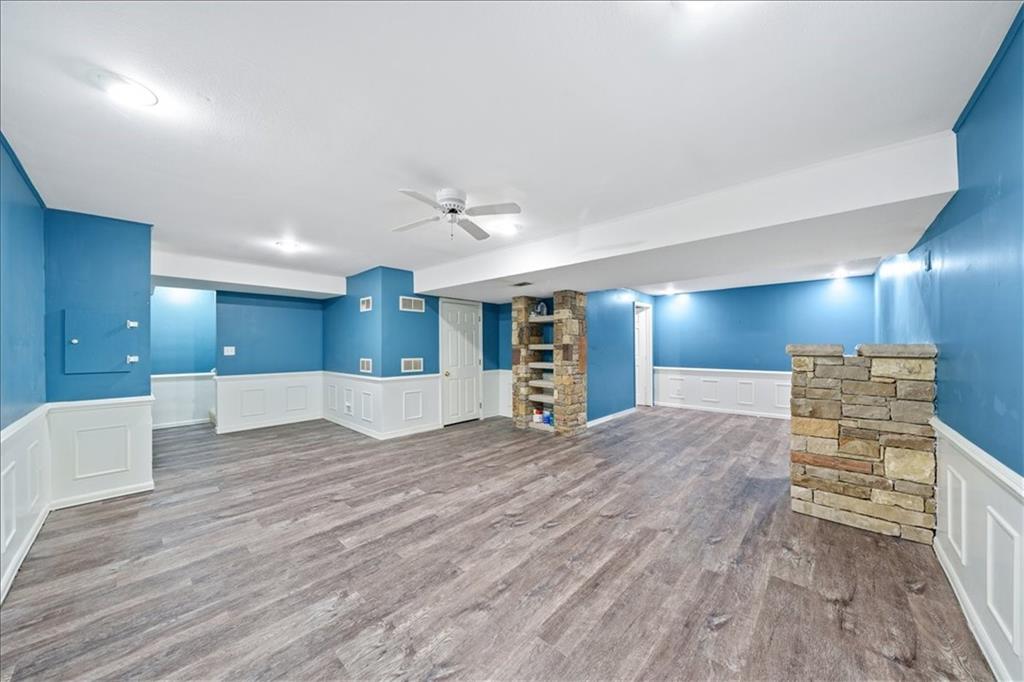 Maintenance-free exterior featuring energy-efficient permanent siding and stacked stone accents. The expansive yard is designed for both relaxation and entertaining, offering a large paver brick patio with arbor, a fully fenced backyard, garden space, and a seasonal screened-in room with Trex flooring—perfect for enjoying time outdoors. Inside, the country-style kitchen is both functional and inviting, highlighted by a large picture window, granite countertops, a closet pantry, built-in desk, stainless steel appliances including a range and separate grill cooktop, and a deep stainless steel sink. Original gleaming hardwood floors and rich wood cabinetry add warmth and character throughout the home, complemented by detailed custom wood trim, pocket doors, and a striking stained glass front entry. The great room impresses with soaring cathedral ceilings, a bay window with stained glass accents, and a stone fireplace flanked by built-in bookshelves. Conveniently located on the main level are the laundry area and a half bath. The finished lower level, approximately 800 square feet, features newer wood plank-style flooring and upgraded designer wainscoting. With a third full bath and an L-shaped layout, this space offers excellent flexibility as a private guest suite, additional living area, or family room. Upstairs, the primary suite includes a spa-like bath with a jetted tub and separate shower. The secondary bathroom features ceramic and marble accents with a shower-over-tub design, ideal for everyday use. This home offers a perfect blend of charm, functionality, and thoughtful updates—ready to welcome its next owner.