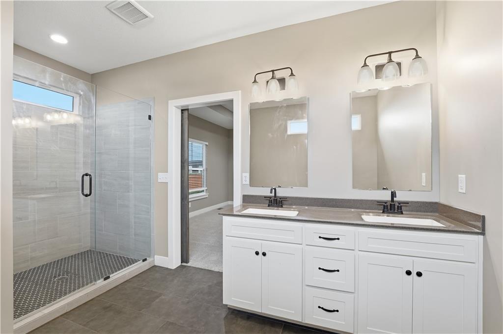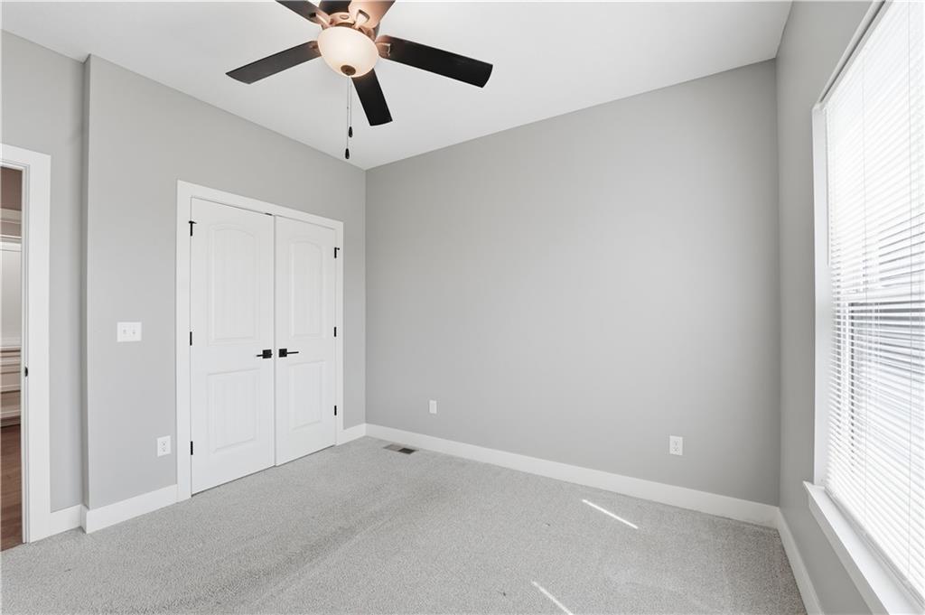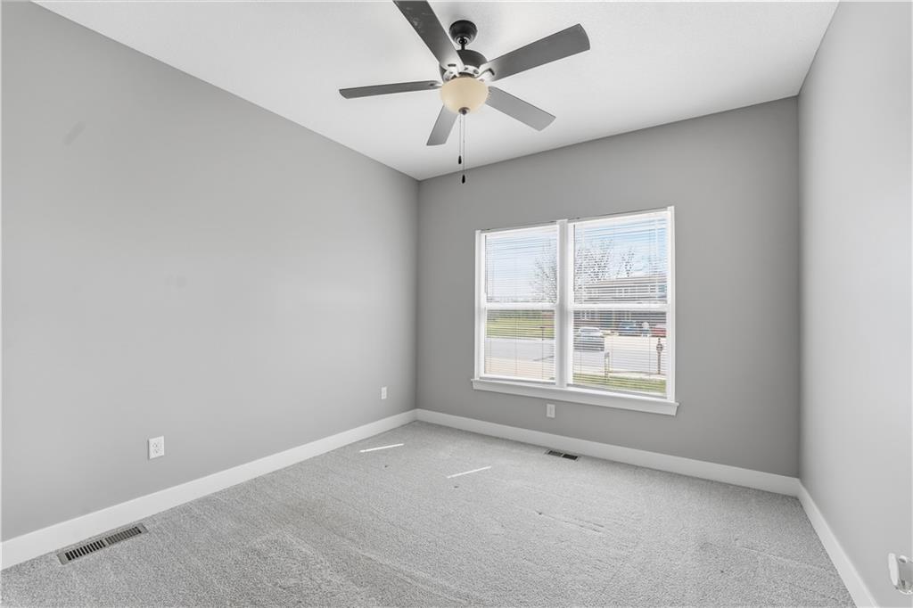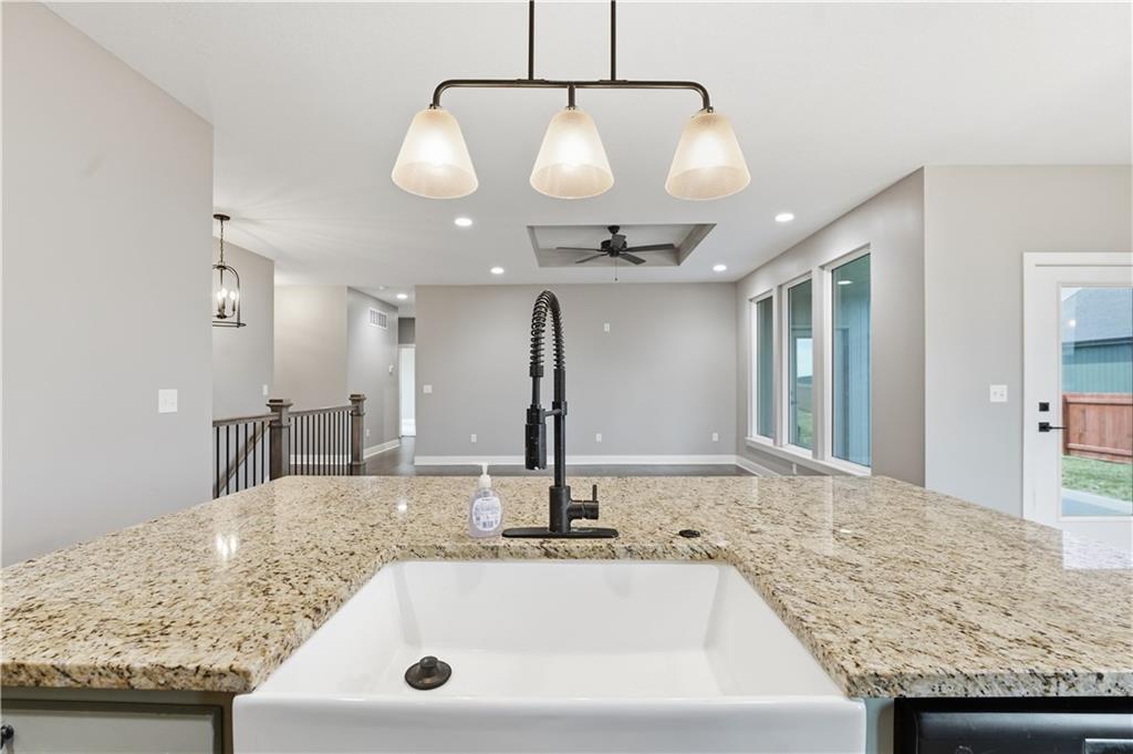 New construction ranch in Harrisonville’s premier neighborhood! This thoughtfully designed floor plan offers a country feel and sits on a large corner lot. Hardwood floors run throughout the kitchen, dining, living, hallways, and laundry room. The kitchen features a built-in oven and microwave, custom vent hood, large island with farmhouse sink, pull-out trash, soft-close cabinets, and bar seating. Walk-in pantry plus built-in shelving by the garage entry with bench, coat hooks, and shoe storage. Dining area includes floor-to-ceiling windows and access to covered patio. Living room offers 10’ ceilings with boxed detail and floor-to-ceiling windows for abundant natural light. Private primary suite features vaulted ceiling and patio access. Primary bathroom includes double vanities, walk-in shower, and large walk-in closet. Two additional bedrooms with ample closet space. Main-level laundry with linen storage. Ceiling fans in all bedrooms and living room. Oversized 3-car garage with openers. High-efficiency furnace and water heater, plus thermal tilt-in windows. Beautiful large yard with sidewalks along front and west side. Subdivision amenities include private lake and walking trails connecting to city park, lake, and golf course. A must see!
