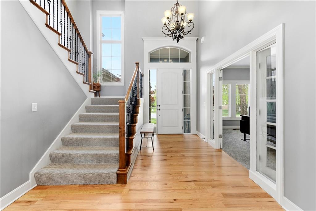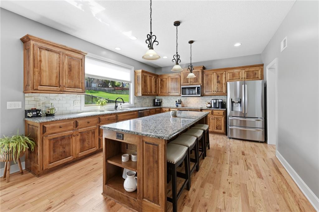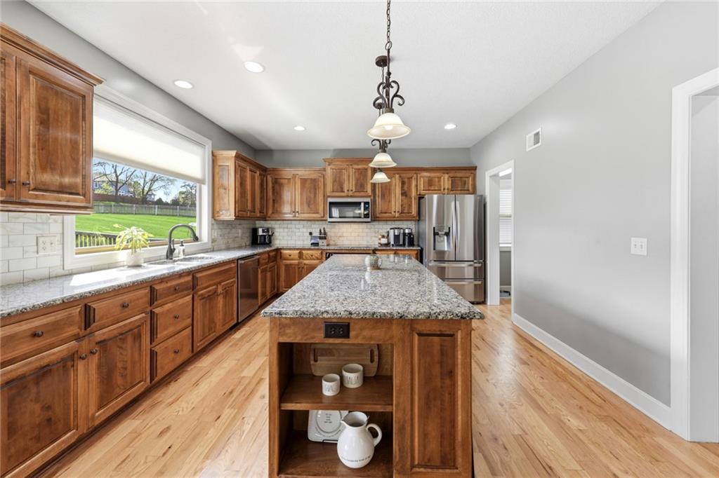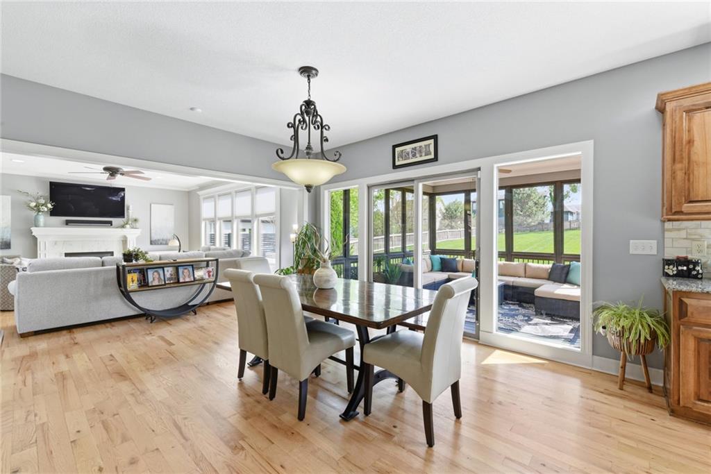 Stunning 5+Bedroom Home in Lee's Summits Premier Lake Community – Raintree! Welcome to your dream home in the highly sought-after Lake community! This beautifully designed 5+bedroom, 4.5-bathroom, 2-story home offers almost 4,000 square feet of luxurious living space and is perfectly situated with views of the pristine Backyard Oasis. Step inside to find rich hardwood floors flowing throughout the main level and an open-concept floorplan filled with natural light. The gourmet kitchen features elegant cabinetry, granite countertops, a spacious island, and a walk-in pantry—ideal for both daily living and entertaining. The expansive lower-level recreation room is the ultimate gathering spot, complete with a stylish wet bar—perfect for game nights or hosting guests. After a long day, relax on the screened-in, covered deck while taking in the peaceful outdoor living area. You can continue to entertain and enjoy a wonderful day or evening in the oasis backyard with a firepit and outdoor kitchen. With 5+ spacious bedrooms, including a luxurious primary suite, and 4 full bathrooms plus a convenient half bath, there’s room for everyone to spread out and feel right at home. Raintree Lake isn't just a neighborhood—it’s a lifestyle. Enjoy access to top-notch amenities including a clubhouse, pool, lake, fitness center, and more. Don’t miss this rare opportunity to own an incredible home in one of Lee's Summits finest communities. Schedule your private showing today!