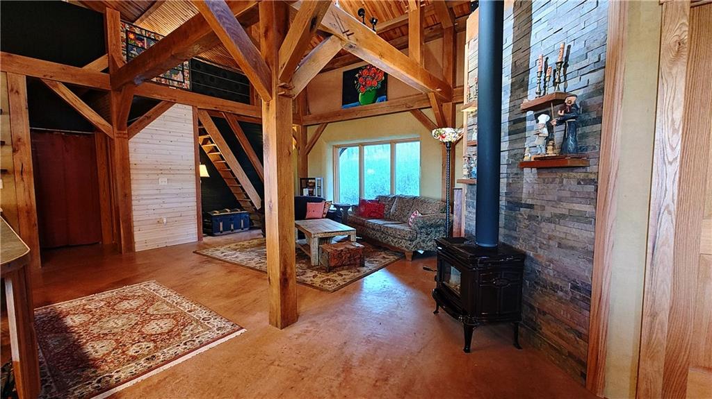 12 year-old Net-Zero Custom-Built Timber Frame Home on 27+ Private Acres with Stocked Pond Energy Independence, Privacy, Woods, Water, and Pasture — 12 miles from Lawrence: timber-frame home sits 500 feet off the road on 27+ acres overlooking the Buck Creek Valley. Designed for efficiency and built with the highest quality materials, it offers a rare combination of sustainability, recreation, and proximity to town. Durability and comfort are hallmarks of this home. You really must experience this home first-hand! 10 acres fenced pasture (high-tensile 4-wire electric fencing) 17 wooded acres with mature oak, hickory, walnut & hedge and over 1 mile of private hiking trails Stocked largemouth bass pond Pond aeration system installed 2025 Home positioned halfway up the hill for protection and views The Home: 1,550 sq ft PLUS 500 sq ft covered porch Traditional timber-frame construction (white oak) 2 bedrooms + flexible loft space (office/guest/yoga/studio) 20’ ceiling peak in open living area Large kitchen with island Zero-entry walk-in shower Straw bale exterior walls (R-40) Structural insulated panel roof (R-40) Andersen casement windows Standing-seam metal roof Mitsubishi mini-split heat pump (new coil 2025) Pacific Energy Alderlea wood stove Complete architectural plans available Natural materials create exceptional indoor air quality and a calm, grounded feel Net-Zero Solar Energy: Installed in 2018 Produces 8,500–9,000 kWh annually, historically exceeds total household usage Inverter replaced March 2024 Water & Infrastructure 8,000-gallon rainwater cistern Pump house/workshop Whole-house filtration system (spin-down, carbon/sediment, UV, optional chlorinator) Outbuildings 11' x 18' workshop / pumphouse 15’ x 45’ pole barn (3 bays) 16’ x 32’ pole barn (2 bays) Converted 15' diam. grain bin with concrete floor, electricity, lighting & exhaust fan 13 mi. to Perry Lake Marina 23 mi. to Clinton Lake Marina