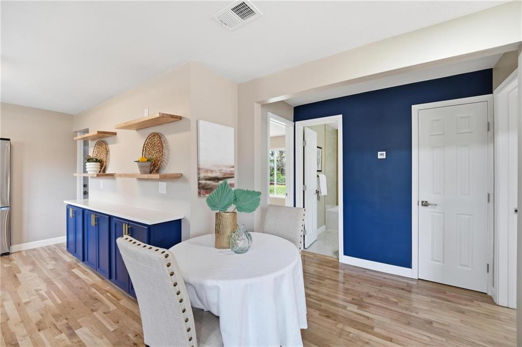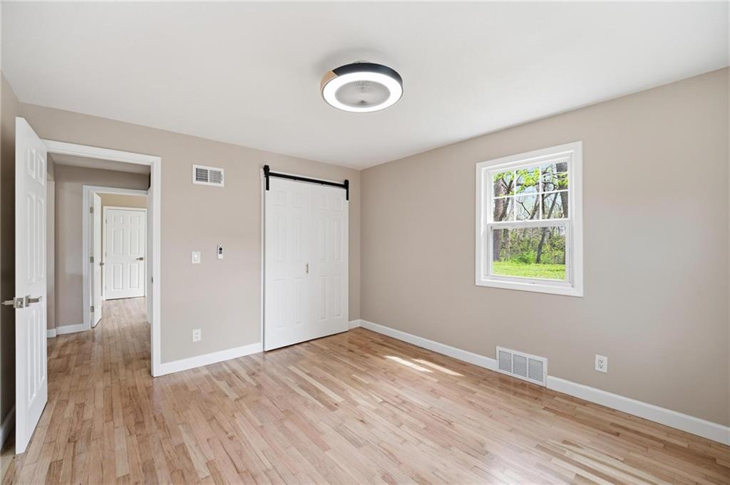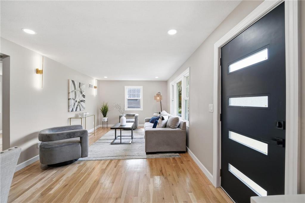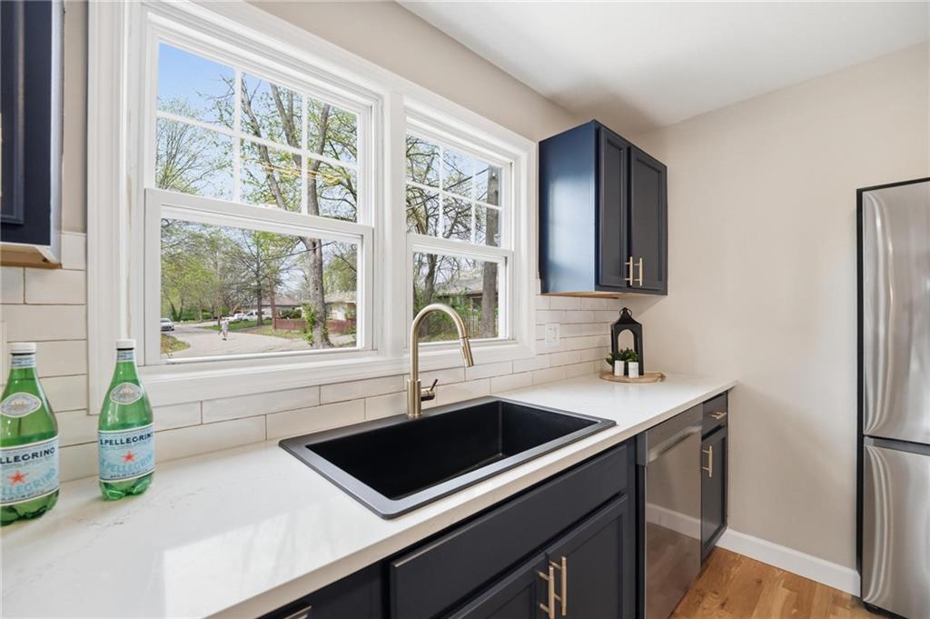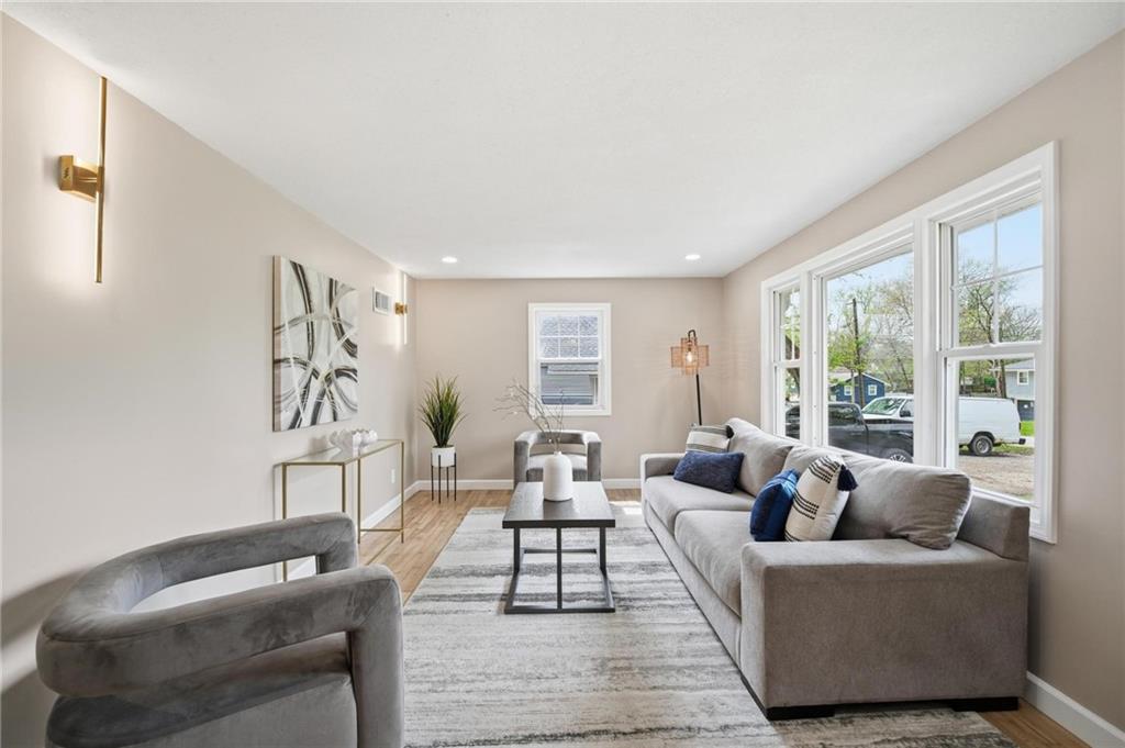 Fully renovated and move-in ready, this 3 bedroom, 2 bathroom home in Kansas City, Kansas delivers modern style and peace of mind on a spacious .30-acre lot. Step inside to an open-concept living area flooded with natural light, featuring refinished hardwood floors, fresh paint, and sleek modern lighting that creates a warm, welcoming feel. The stunning kitchen showcases navy cabinetry, quartz countertops, brushed gold hardware, floating wood shelves, stainless steel appliances, and a large single-basin sink overlooking the front yard. The private primary suite offers a beautifully updated bathroom with custom tile, contemporary fixtures, and a clean designer look. Additional updates include brand new vinyl siding, new gutters, new HVAC, and a new water heater, giving you confidence for years to come. Outside, the oversized two-car garage, expanded driveway, and deep lot provide plenty of parking, storage, and outdoor living potential. All of this is offered at just $275,000—schedule your showing and see how 2849 N 48th Terrace checks every box.