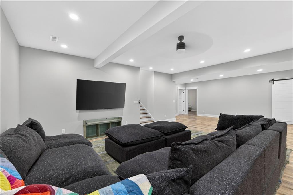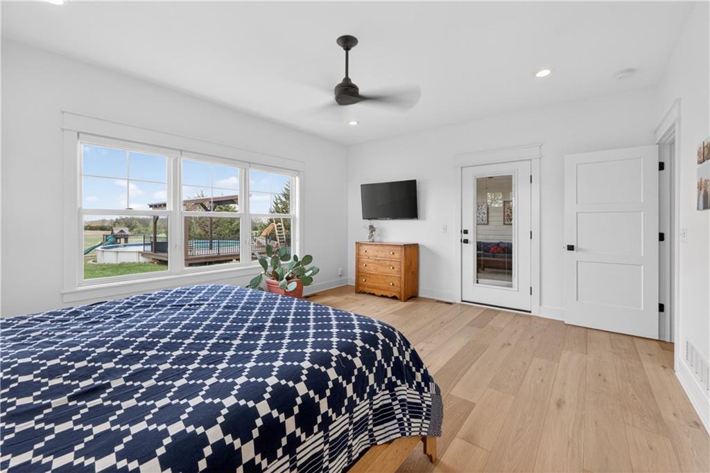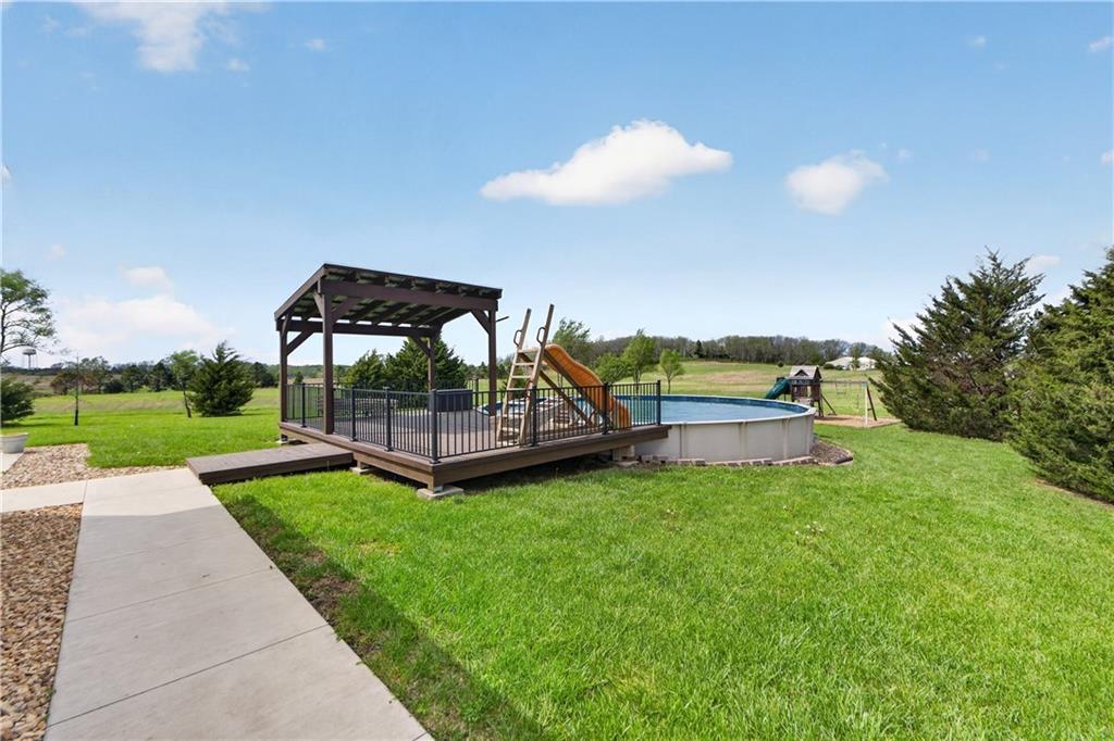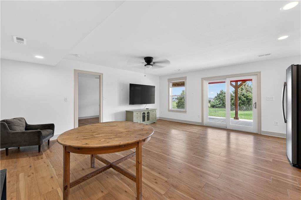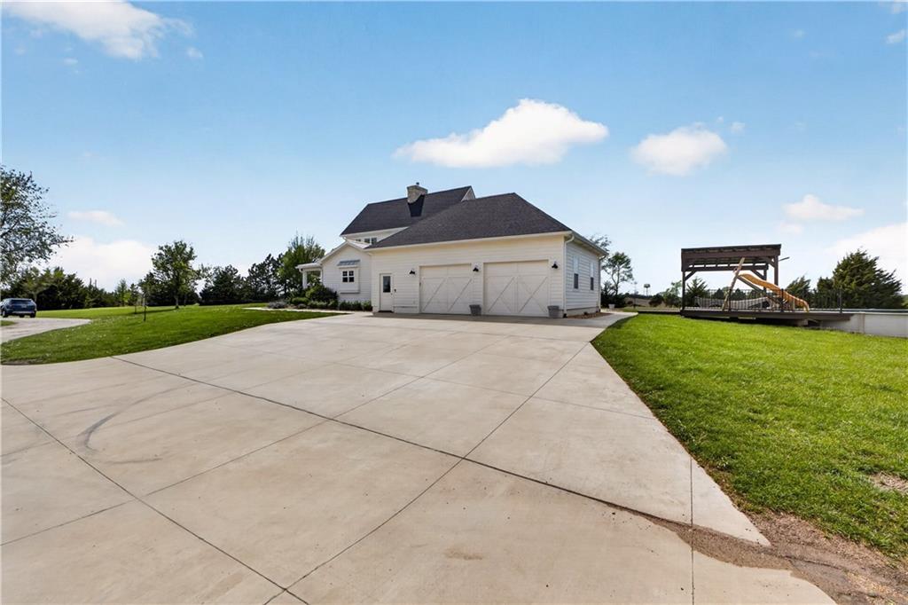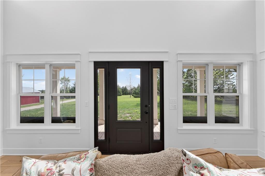 10 acres on blacktop — a rare blend of modern comfort and full-function hobby farm living. Built in 2020 as the sought-after builder’s personal residence, this open-concept home offers 6 bedrooms, 3.5 baths and 4,032 total sqft with thoughtful finishes throughout. Main living features include a dramatic two-story great room with abundant windows, wide-plank white oak engineered floors, a see-through fireplace between the dining room and living room, and a chef-ready kitchen flowing to living and entertaining spaces. The primary suite is conveniently located on the main level and opens to a large screened porch that, together with the dining room, leads out to an expansive concrete patio — ideal for indoor-outdoor living. Two oversized bedrooms upstairs include vanities/sinks plus a full upstairs bath; three additional bedrooms are located below grade. Practical comforts: main-level and basement laundry, an oversized two-car garage, and a large finished six-sided concrete storm shelter. Outdoor and outbuilding amenities are built for hobby farmers, equestrians, and weekend hosts. Approximately 2.5 acres are fenced and improved with a horse barn that has power and water. The back 5 acres serve as productive hay pasture. The 2,400 sqft barn/shop includes a 1,600 sqft insulated, heated & cooled shop space with two overhead doors and a full bath, plus an 800 sqft one-bedroom apartment with kitchen/living area, full bath, W/D hookups and a wraparound covered porch — perfect for rental income, guest quarters, or on-site help. Additional property highlights: chicken coop with power, water and indoor/outdoor access; raised-bed garden area with water run; a 33-ft above-ground pool with deck and awning for summer entertaining; and abundant acreage for riding, gardening, or expansion. Location is exceptional — just one mile from the new elementary school in the award-winning Basehor-Linwood School District.