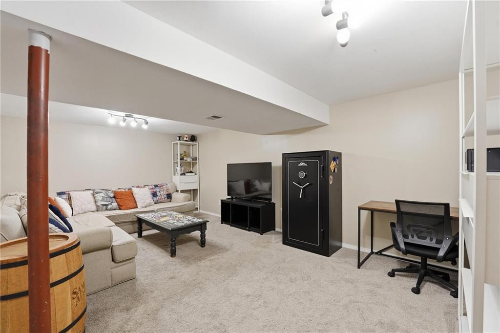 This stunning raised ranch home has been beautifully updated with modern luxury vinyl plank flooring, new carpeting, a new roof, a tiled primary bathroom shower, and fresh paint throughout. Upon entering, you'll notice the high ceilings and wooden beam accents that create a spacious atmosphere, warmly complemented by a charming stone fireplace. The layout seamlessly flows into a dining room featuring a back door that leads to the deck. The kitchen is equipped with ample cabinetry and smart counter space for all your culinary needs. Down the hallway, you will find a coat closet, linen closet, a full bathroom with a large vanity and a shower over the tub, and three cozy bedrooms at the end of the hall, each adorned with plush carpeting. The primary bedroom offers generous space and a stunning ensuite, complete with a new tiled shower, vanity, and mirror. The finished basement includes a recreation room and a laundry room with fantastic storage, including storage shelves that stay. The two car garage provides access to the basement, featuring space for a coat rack and additional storage behind the shutter doors in the recreation room. The back deck, accessible from the dining room via the back door, overlooks a fenced backyard that backs up to trees, creating a serene retreat. This home is situated in a quiet cul-de-sac within the North Kansas City School District, with Staley High School as the designated attendance school.