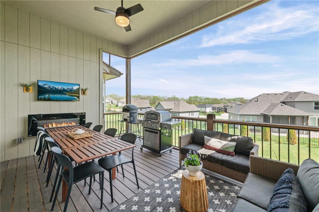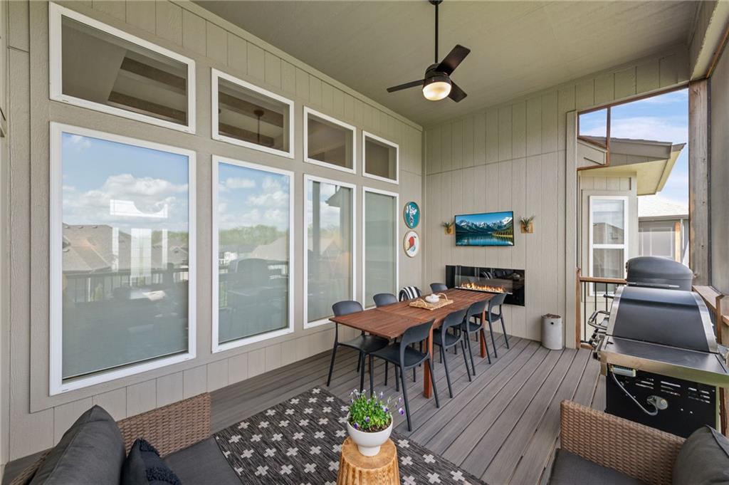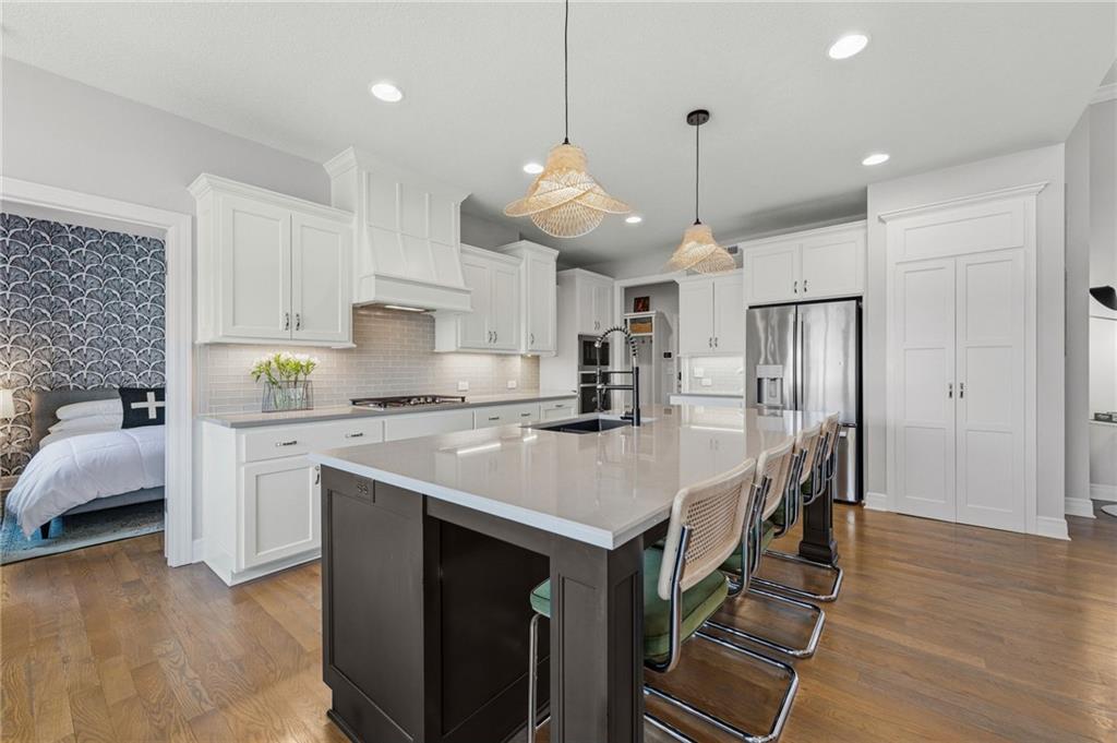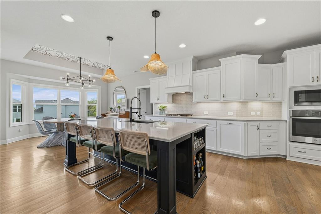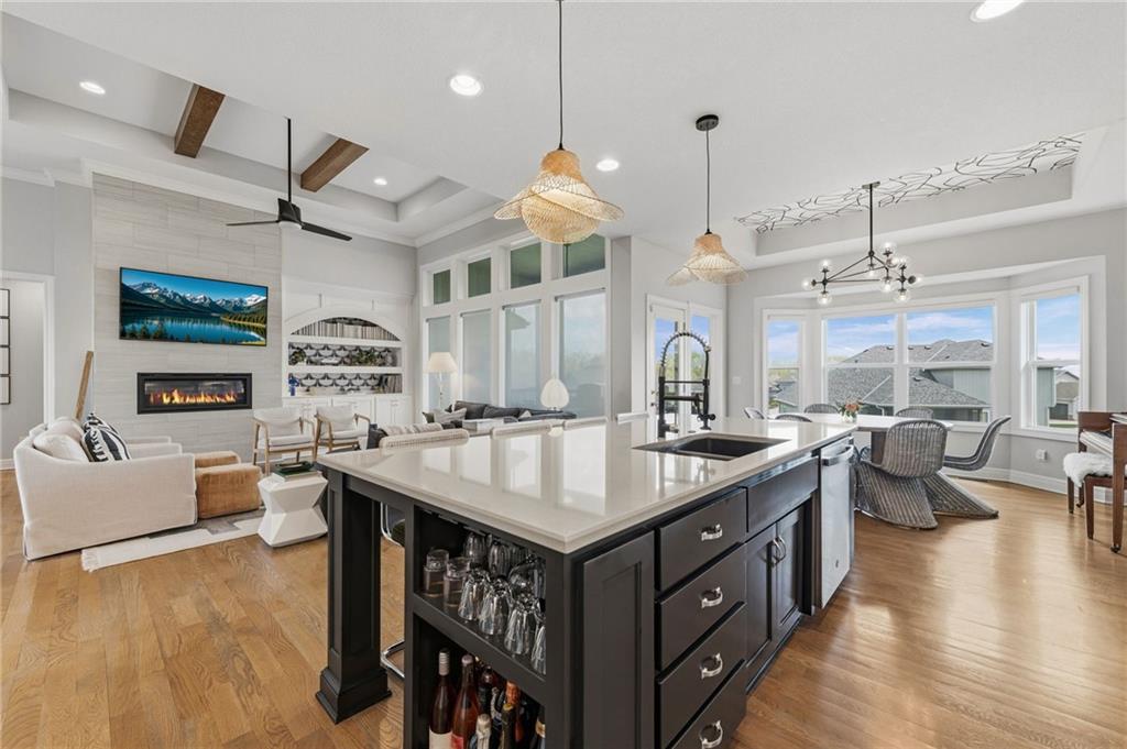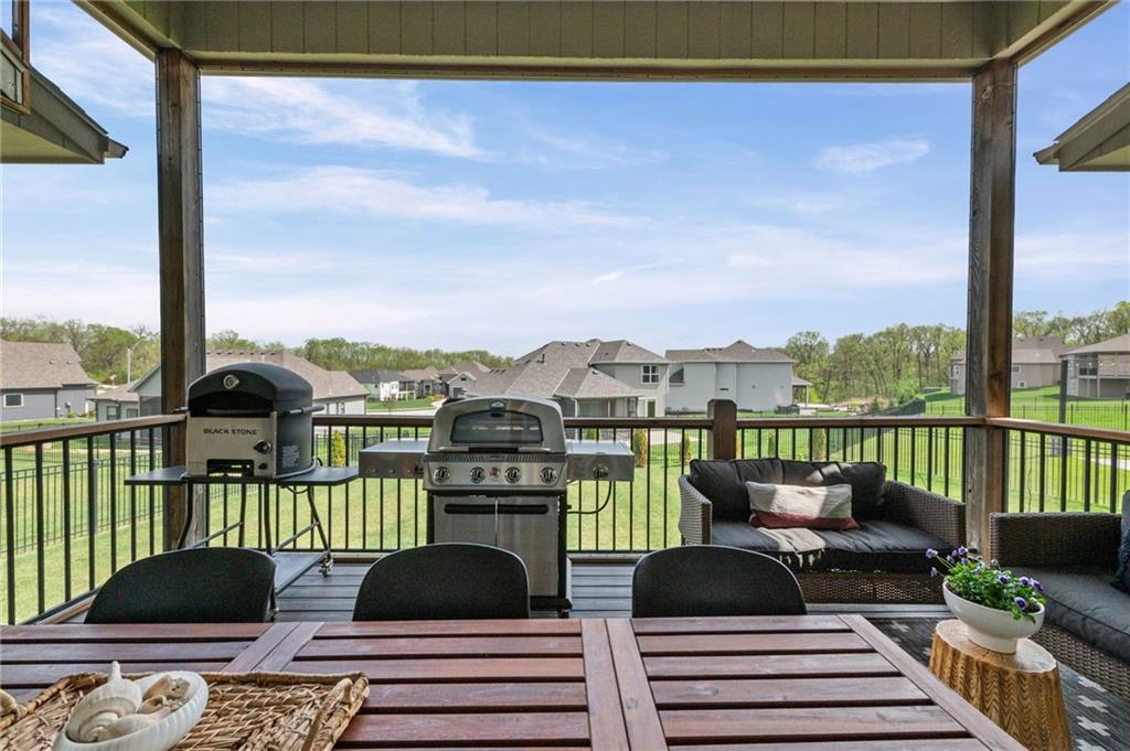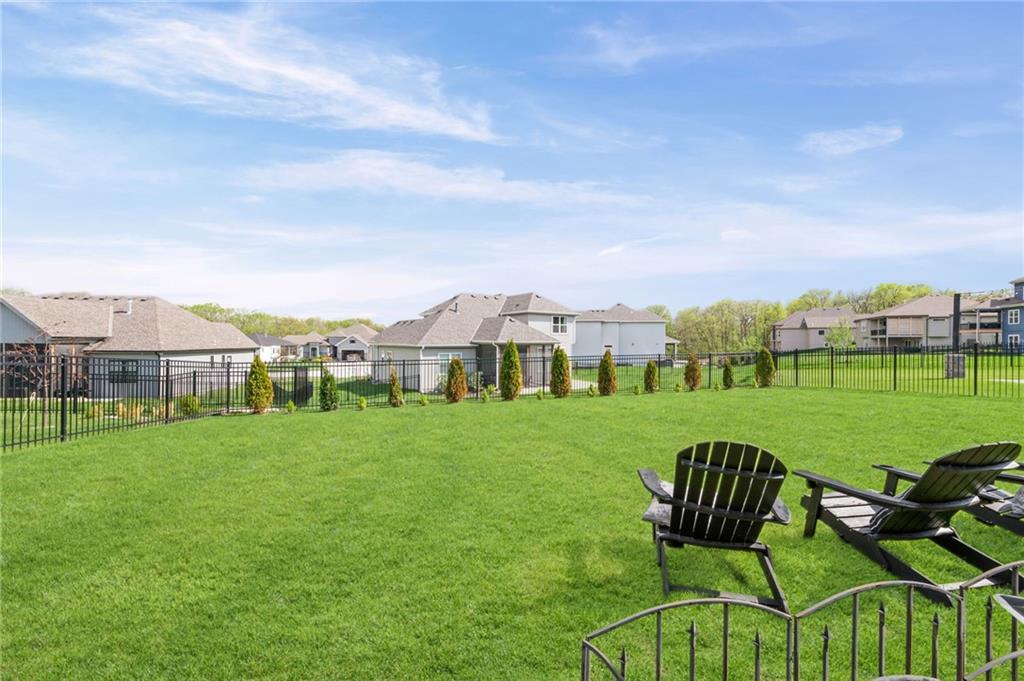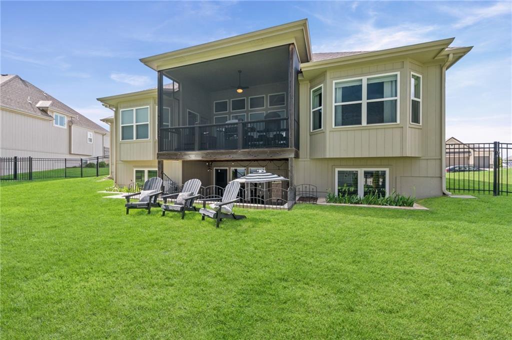 DESIGNER'S DREAM !!! The Morgan by New Mark Homes situated in Cider Mill, south of The National in Parkville Missouri ! 5 bedrooms / 3 baths / 3 car garage ! ***NEW ROOF, GUTTERS AND DOWNSPOUTS*** Roof completed by 4/17!!! This a TRUE SHOW HOME w/ countless upgrades to lighting & decor by these owners! Designer Wallpaper abounds adding accent walls & tasteful design! Custom window coverings in every room. Owners have added ADT Security System, Screened in Deck, Front Landscape & Hardscape, Fenced Backyard, Patio Lighting, Deck Fireplace (electric), there is so much more! The Open floor plan with Great Room Fireplace & beamed ceilings open up to the white cabinets & oversized island w/ quartz countertops & designer backsplash. The drop space from the garage is perfectly situated. Primary master suite has double vanity, tub & walk in shower w/ glass door. Closet is spacious and opens up into the laundry room. 2nd bedroom on main level is right off the kitchen w/ a 3/4 bath. Lower level has wet bar w/ lots of entertaining space for ping pong & watching movies! Closet and storage space is amazing .... the walk out walk up feature allows natural light! There is a separate sump pump for the LL patio. This is an amazing home and definite pride of ownership ! This area has a nice community pool, close proximity to Downtown Parkville, Creekside, Graden Elementary, Lakeview Middle School, 435, KCI, I-29 and so much more!