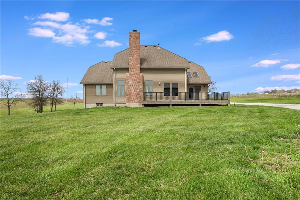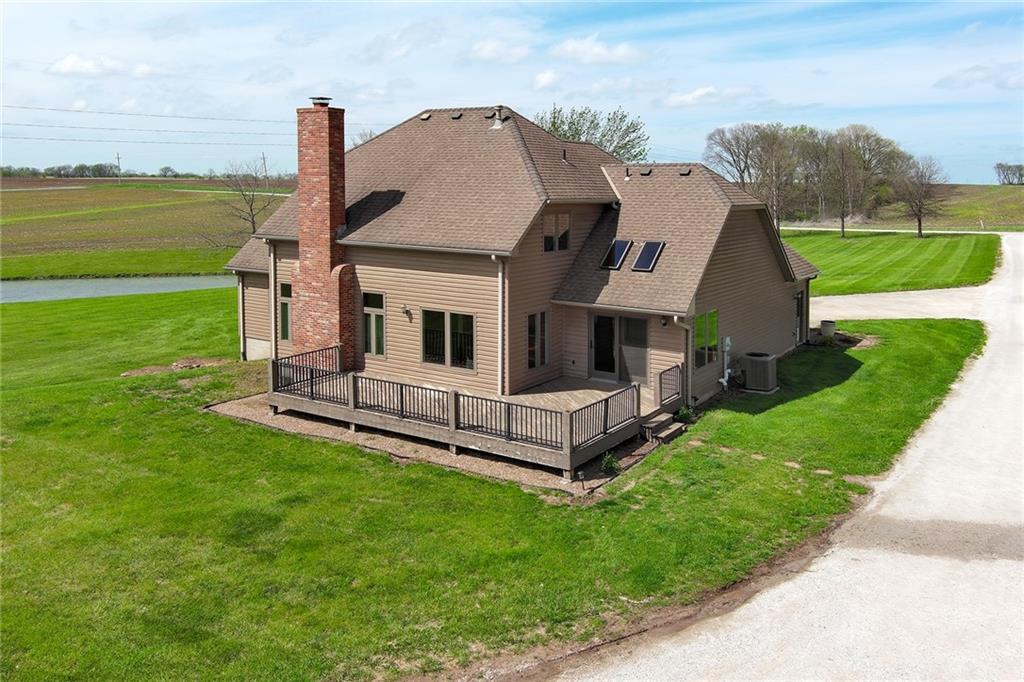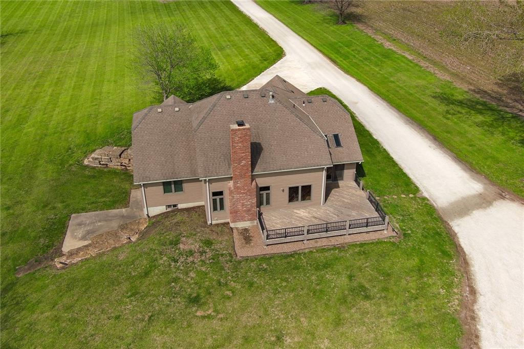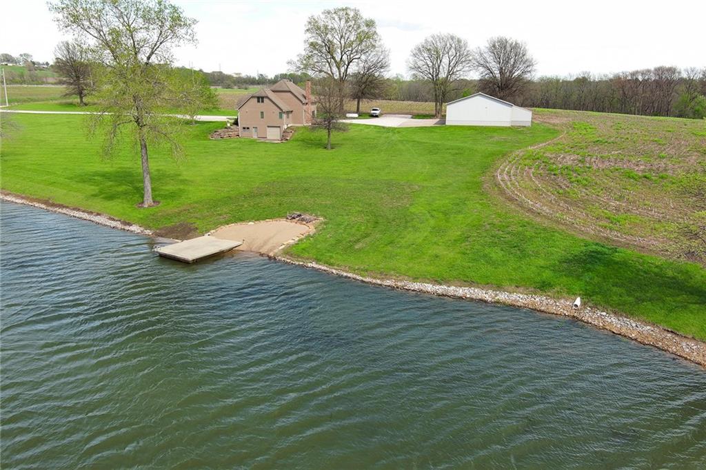 Escape to the peace of the countryside in this custom built home on 24 acres. A fully stocked pond with Bass, Crappies, Perch, Bluegill, and Catfish provides the perfect place to relax while watching the sun set. The entry opens to a large great room with heat circulating wood burning fireplace and 13' ceilings with beautiful crown moulding. There are two dining areas (one is currently being used as an office). The kitchen has many cabinets, pantry, island with cooktop, Granite countertops, tile backsplash, and wood floor. The primary suite is large and includes the following amenities - a double vanity, shower, whirlpool tub, linen closet, and walk-in closet. The two upstairs bedrooms are generous size with a shared bathroom. There is an office that could be converted into another bedroom/play area/craft room - the options are endless. There is a storage area above the garage off one of the bedrooms. The finished walk-out lower level has so much to offer with large family room, gym/exercise room (could be converted into a bedroom), full bath (with walk-in closet for guests), storage area (16.11x11.6), and 3rd car garage (14.3x11.2). The home was remodeled in 2008 with new vinyl siding, windows, roof, granite countertops, & refinished hardwood floors. The 60x40 outbuilding includes 100amp electrical service, insulated interior, concrete floor, water, radiant heat, pegboard/workbench, large overhead door for RV, & BONUS - 9,000 lb vehicle lift. There is a lean-to (40x12.6) on the back of the outbuilding. Located just a little under 10 minutes from I-70, this property offers the perfect balance of rural privacy and convenient access to town and Kansas City. Inspections welcome but selling "AS IS". The two gas tanks on the East side of the outbuilding are not staying.