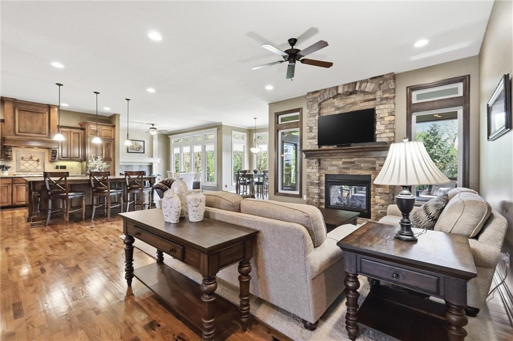 Don’t miss this beautifully maintained home designed for both everyday living and exceptional entertaining. Every bedroom features its own full bathroom, offering comfort and privacy for family and guests alike. The heart of the home is the stunning kitchen, complete with stained wood cabinetry, stone countertops, stainless steel appliances, a large island, and a walk-in pantry. The open layout flows seamlessly to the screened-in deck, where you’ll find a see-through fireplace with space for a TV—perfect for cozy evenings or hosting friends. The main level also offers a versatile second bedroom or office, along with an oversized laundry room for added convenience. The spacious primary suite is a true retreat, featuring a tray ceiling, private deck access, a large walk-in closet, and a luxurious en-suite bathroom with a soaking tub, separate shower, and double vanity with ample storage. Downstairs, the finished walkout basement is built for entertaining, complete with a fireplace, game room area, and a wet bar with stained cabinetry, sink, and dishwasher. Two additional bedrooms and two full bathrooms provide even more living space. Step outside to enjoy the extended patio, thoughtfully designed with an outdoor kitchen area, fire pit, and beautifully finished ceiling detail over the covered patio. The backyard also features professional landscaping and a tranquil water feature. The home is even prepped for a hot tub hookup. Car enthusiasts and hobbyists will appreciate the oversized three-car garage with a staircase leading directly to the basement. This home has been exceptionally cared for and is truly move-in ready—an incredible opportunity for its next owner.