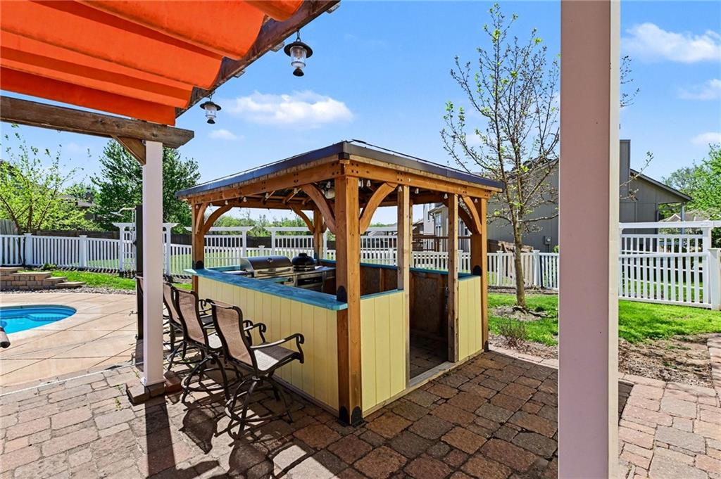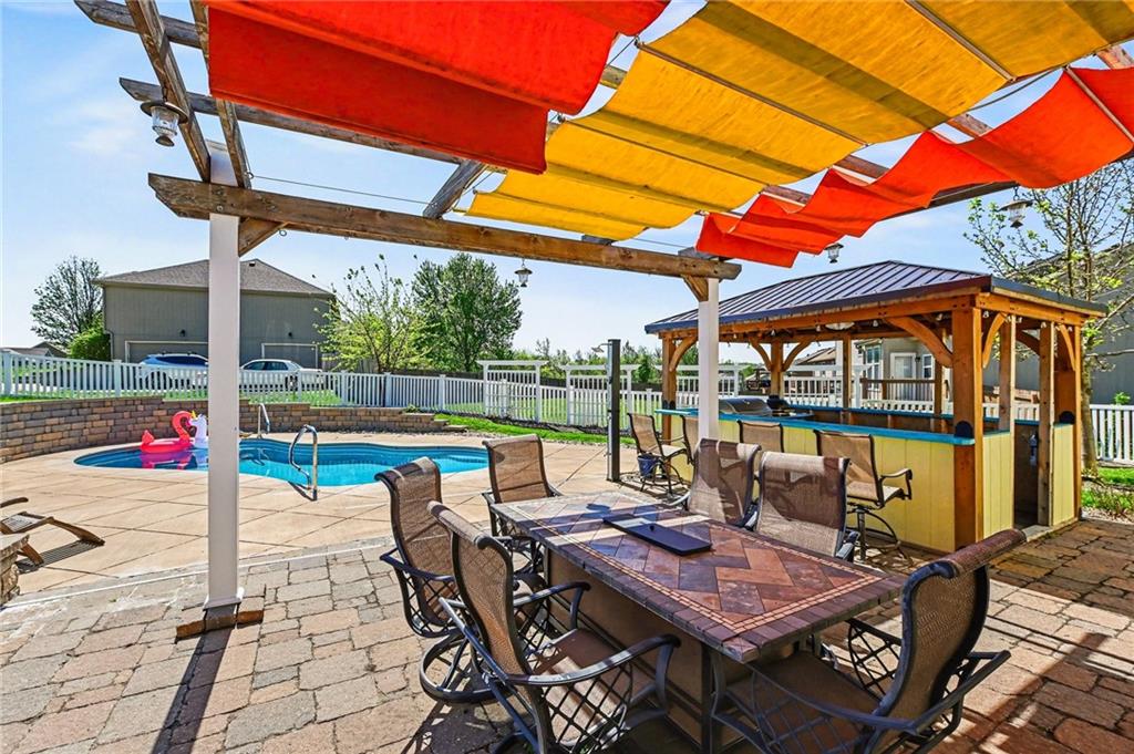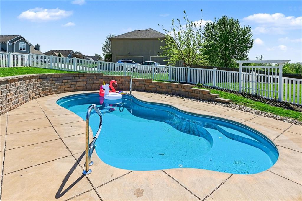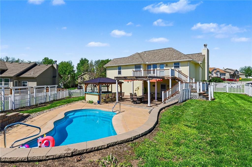 Welcome to your private outdoor entertainment retreat just minutes from Smithville Lake: every day feels like a vacation. Designed for year-round enjoyment, the backyard is the showstopper. Dive into the 30-foot heated saltwater pool, unwind on the spacious paver stone patio, or host unforgettable gatherings at the 14x10 gazebo, fully transformed into a Tiki bar. Relax under the pergola with retractable misting shades beside a fire pit table that comfortably seats six. The fully fenced yard, featuring maintenance-free white vinyl fencing: also includes an outdoor shower for added convenience. Inside, the living room features hardwood floors, a vaulted ceiling, and a cozy fireplace, creating a warm and inviting atmosphere. The kitchen & dining area flow seamlessly to a large deck with stairs leading directly to the pool. The kitchen is equipped with a pantry, refreshed white cabinetry, generous counter space, stainless steel appliances. The primary suite offers a vaulted ceiling, two walk-in closets, and a private ensuite bath complete with double vanities, a whirlpool tub, & a separate shower. Secondary bedrooms each include walk-in closets & ceiling fans. The finished lower level expands your living space with a versatile rec room featuring a second fireplace, built-in bookshelves, a half bath, & walkout access to the backyard. Updates include newer garage doors & openers, a sprinkler system, & refreshed pool landscaping. The HVAC system is just 3 years old, providing added comfort & peace of mind. The 3-car side-entry garage offers ample parking & storage. Enjoy neighborhood amenities including walking trails, a community pool, & a scenic fishing lake. Located near Smithville Lake, with over 175 miles of shoreline, you’ll have access to marinas, campgrounds, picnic shelters, golf courses, & endless outdoor recreation: boating, fishing, sailing, swimming, water skiing, plus hiking, biking, and equestrian trails. This isn’t just a home: it’s a lifestyle.