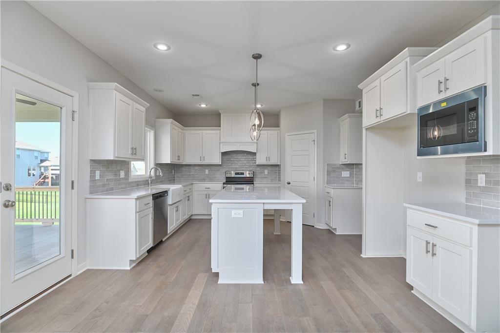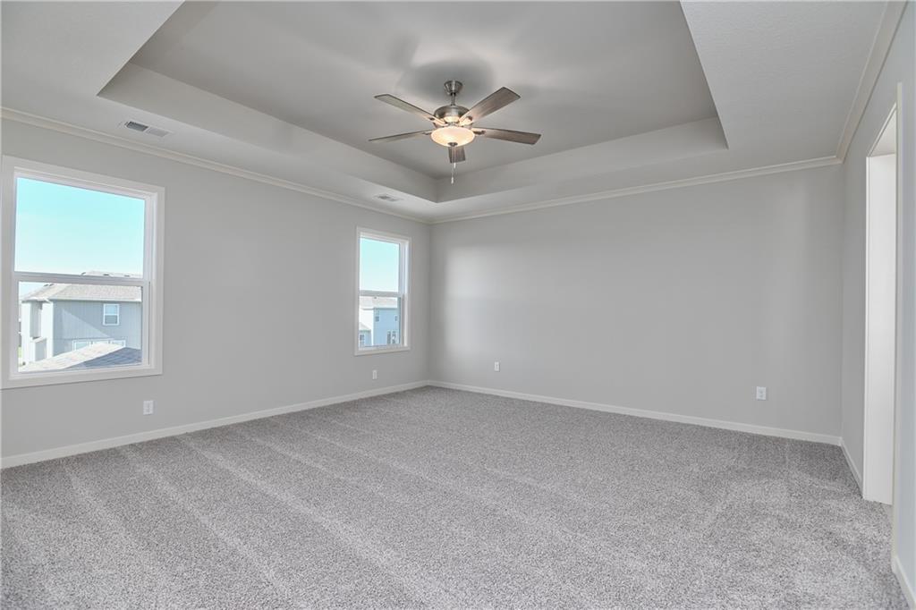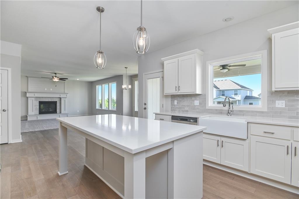 Popular Harlow 5 | 5 Bedrooms | 4 Baths | 3-Car Garage | Prairie Farms This stunning 2-story Harlow 5 home offers 5 bedrooms, 4 baths, and a spacious 3-car garage in the highly sought-after Prairie Farms community. From the moment you enter, you’ll be impressed by the beautiful turned staircase and gleaming hardwood floors. The formal dining room features built-in cabinetry on both sides and flows seamlessly into a bright, open great room with a cozy fireplace and abundant natural light. The adjacent dining area and chef’s kitchen are an entertainer’s dream—highlighted by hardwood floors, granite countertops, a large center island, apron-front sink, painted custom cabinets with soft-close doors and drawers, upgraded hardware, stainless steel appliances, built-in microwave, and a generous walk-in pantry. A main-level bedroom with a closet offers flexibility as a guest suite, office, playroom, craft space, or more. Upstairs, the luxurious owner’s suite boasts a spa-like bathroom with double granite vanities, tile floors, a free-standing soaking tub, and a walk-in tiled shower. A spacious walk-in closet connects directly to the conveniently located laundry room. Two secondary bedrooms share a Jack & Jill bath, each with its own private vanity. A fourth upstairs bedroom features its own private bath and walk-in closet. Additional highlights include a huge unfinished basement with abundant storage potential, an in-ground sprinkler system, and more. Community amenities include a large swimming pool, cabana, playground, and walking trails. Plus, Prairie Farms is adjacent to the newly renovated Lake Olathe, offering paddleboarding, fishing, hiking, and more—making this a perfect place to call home! Photos are of actual home.
