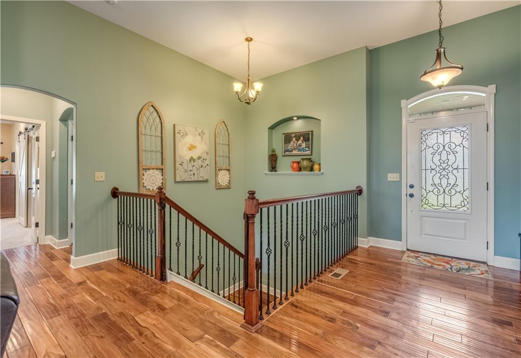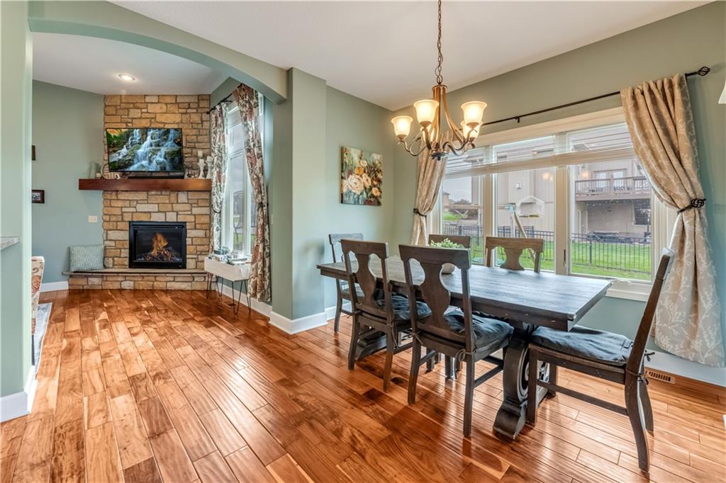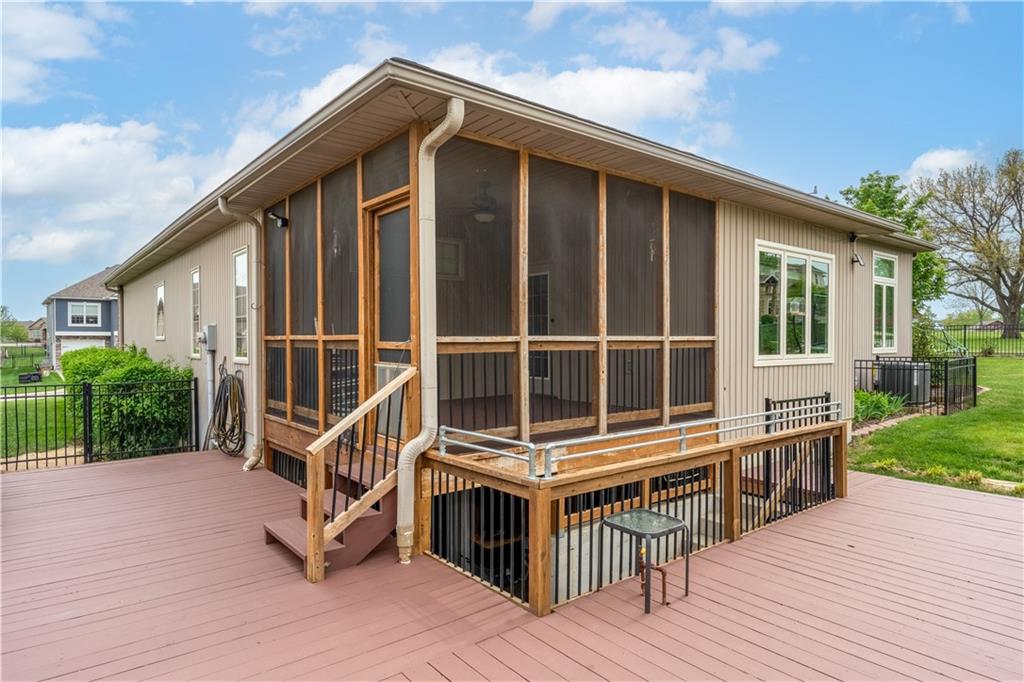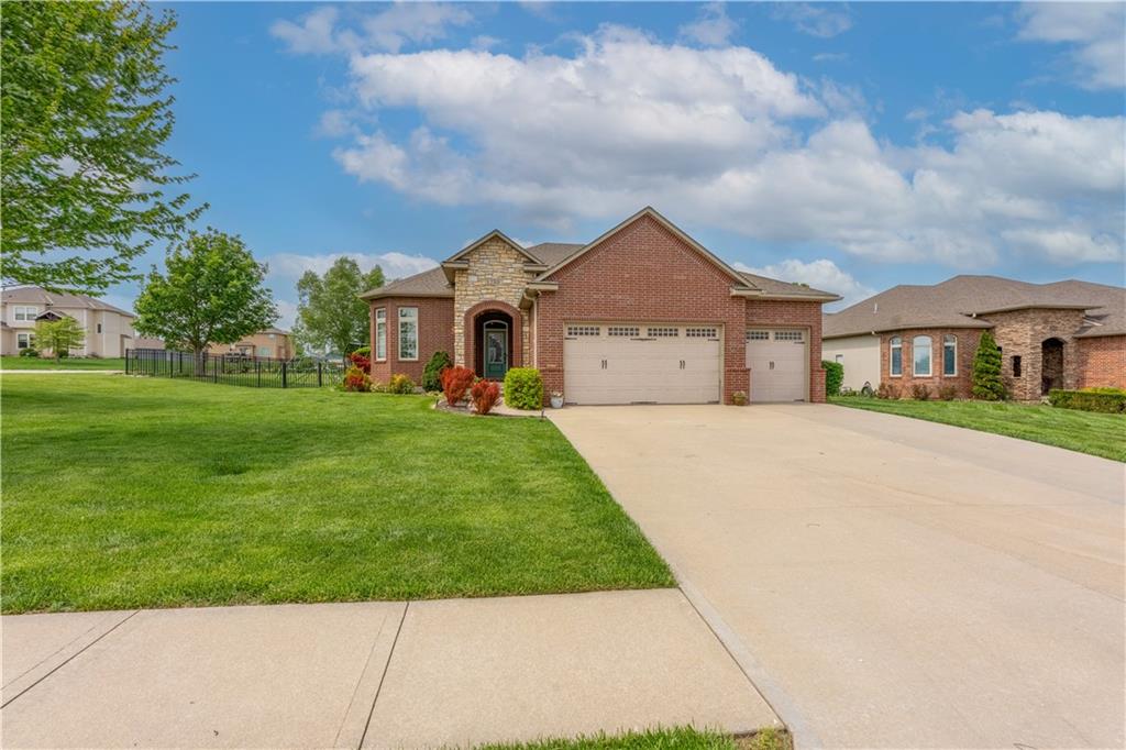 Your beautiful home is ready for you in the desirable Cayhill subdivision, known for holiday events, walkability, and commuting convenience to Whiteman AFB! This immaculate reverse ranch sits on a large corner lot with subdivision lake privileges, just minutes to shopping and restaurants in town. The welcoming front porch ushers you into warm hardwood hand-scraped floors and an open concept great room with tall ceilings. Enjoy the warmth of the gas fireplace with stone surround and still have connection to the Kitchen/Dining Room activities. Sellers have increased energy efficiency with window replacement in LR, DR, back secondary Bedroom, and hall Bathroom June 2025. Your large Kitchen has an abundance of custom wood cabinetry, granite counters, stainless steel appliances that all stay (Fridge, double oven, and dishwasher less than a year old!) and a dedicated pantry directly off the Kitchen. Main floor laundry is also nearby. The generous Primary Bedroom showcases a walk-in closet, newer carpet, and a beautifully updated on-suite Bathroom with new floor tile, newly tiled shower, new glass door, double vanity, and jetted tub. The two secondary Bedrooms have larger closets with storage systems and newer carpet with the hall Bathroom between. The lower level includes a full bar (drink fridge will stay) and service area off of the spacious Family Room, the 4th true Bedroom with a walk-in closet, another nonconforming room for many uses, and a 3rd full Bathroom. The 300 SF storage area includes a utility sink, storm shelter, NEW AC and furnace in 2025! Head out the patio door upstairs to the screened-in deck for relaxation without bugs! The basement patio leads up to the wide, newly stained back deck with a dedicated gas line for a firepit or grill. Play options abound with a swing-set and more in the fenced yard with in-ground sprinkler system. Come make new memories here!