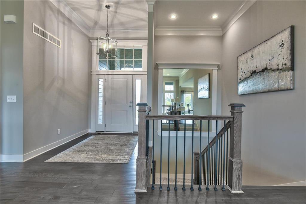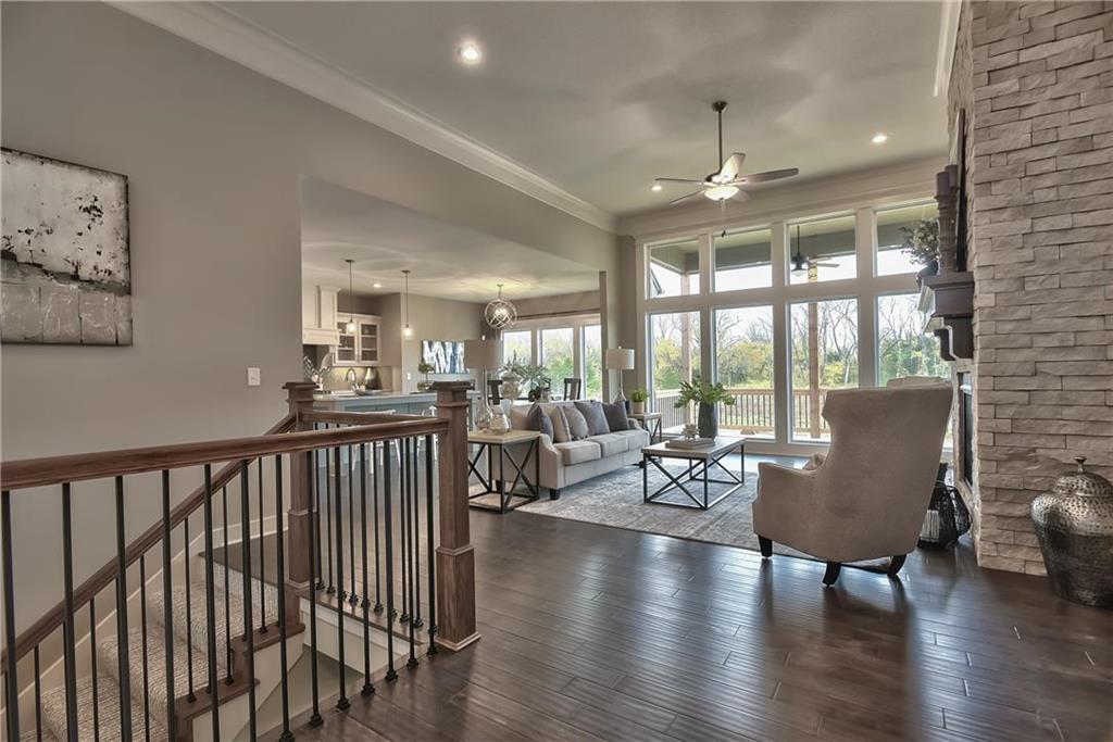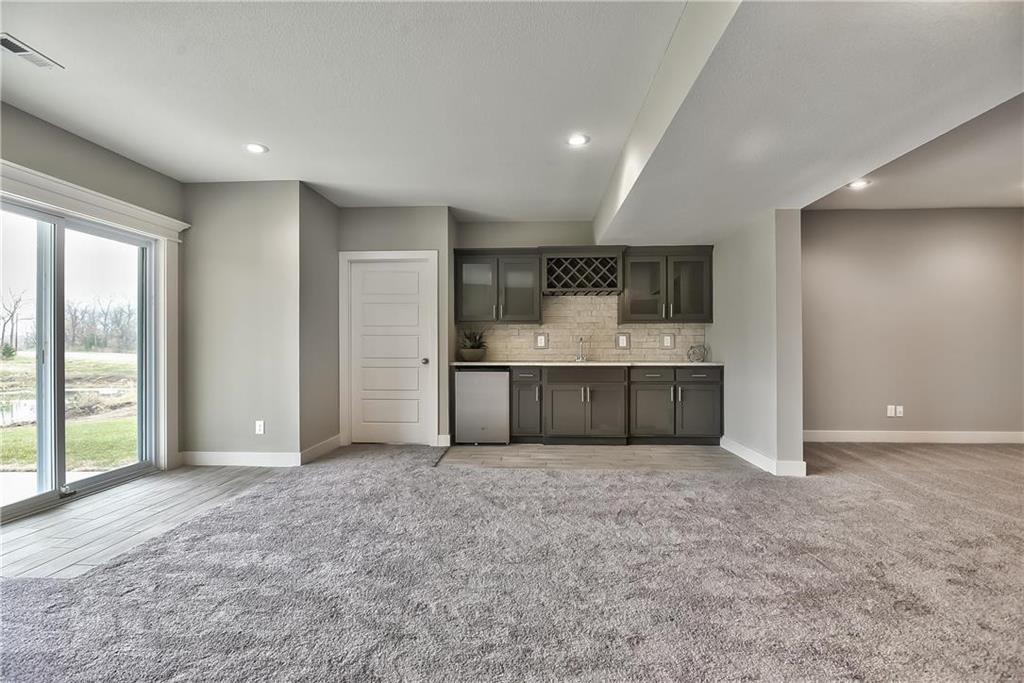 Want some privacy? This Dakota reverse sits on a beautiful walk out lot backing to trees. Nice hardwood floors run throughout the entry, great room, dining area, kitchen and mud room. The great room includes a stunning fireplace and wall of windows giving you lots of natural light. Walk out from the dining area to a wonderful covered deck with a peaceful view of the treed backyard and greenspace. Center island kitchen with granite countertops is a cook's delight featuring an apron sink, custom cabinets with cabinet hood, upgraded cabinet hardware with soft closing drawers & doors, built in microwave, undercabinet lighting, stainless appliances and a large walk in pantry. The owner's suite with its vaulted ceiling and wall of windows leads into a lovely bath with separate granite vanities, walk in tiled shower, separate tub and walk in closet. Laundry room is connected to the master bath for your convenience. The second bedroom on the main floor is a great multipurpose room for a guest room, craft room, office, etc. ice sized mud room with large boot bench,, coat closet and a 3/4 bath just off the back hallway. Follow the U-shaped staircase down to the rec room with wet bar and plenty of room for a home theater plus a game table. Walk out from the rec room to enjoy the private backyard. Two more bedrooms and bath complete the finished lower level. Lots of storage in the unfinished basement. Storm room included for your safety in case of a storm. Three car garage and sprinkler system. Prairie Farms has a great community pool, play area and walking trails. It's a great place to call home.