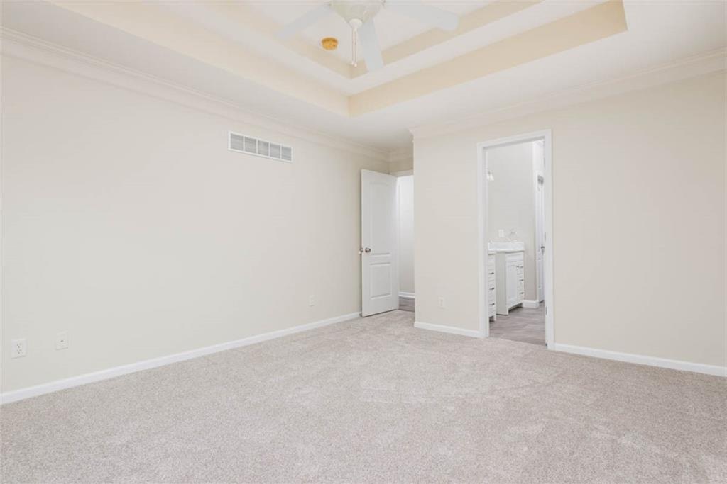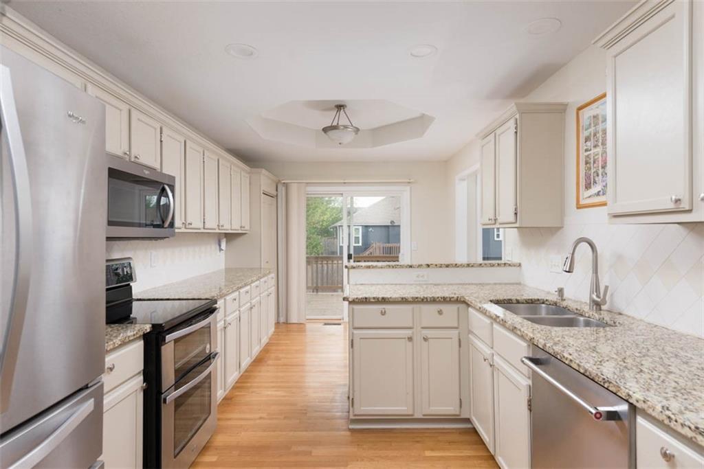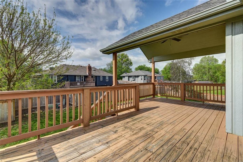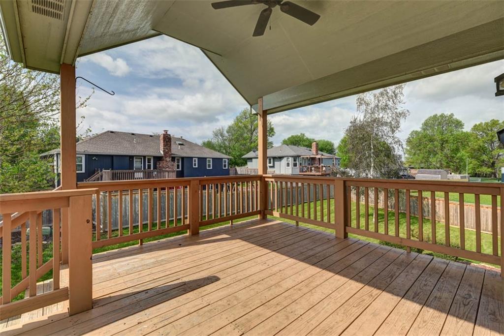 This beautiful house is rested, refreshed, and ready for its new owners!! Spacious and welcoming with great light, the living room greets you with soaring vaulted ceiling and a gas fireplace. The eat-in kitchen features wood floors, granite counters, and stainless appliances, with a walk-out door to your *covered* back deck and flat, *fenced* yard! If you need extra space for company, there's also a full dining room with a wood floor too! Primary bedroom is at one end of the hall for privacy, with NEW carpet and NEW paint - this room has a nicely updated en suite bathroom with tile floor, big tub and walk-in shower, granite double vanity, and a BIG walk-in closet. At the other end of the hall, you'll find two more bedrooms, each with ceiling fans, plus new carpet and paint! Downstairs, an easy care tiled family room walks out to patio/yard and has another gas fireplace. The basement also has that rare TRUE fourth bedroom! Big three car garage PLUS extra storage space here too for all your stuff. This house is conveniently located, with highly-rated schools, great walking nearby, easy access to shopping, dining and everything the community of Kearney has to offer!