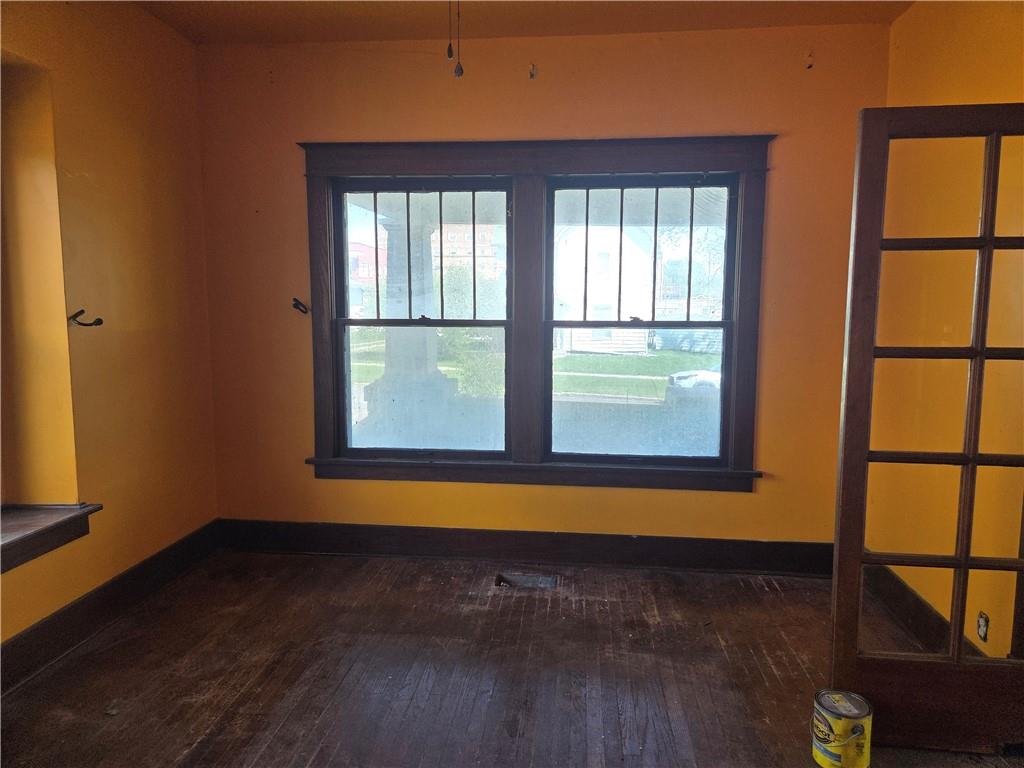 Room featuring wood-finish flooring, a two-pane window with dark wood trim and security bars, and a multi-pane glass-inset door
