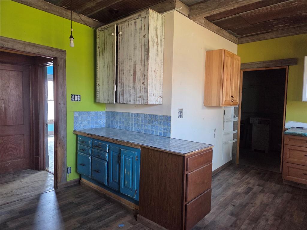 Kitchen area featuring tiled countertops, a blue tiled backsplash, and wood-finish flooring