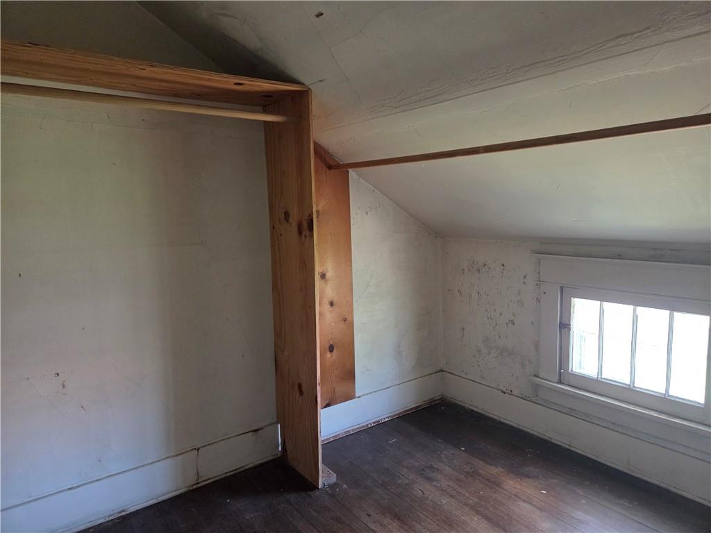 Room featuring sloped ceilings, a built-in wood-finish closet with hanging rod, and wood-finish flooring