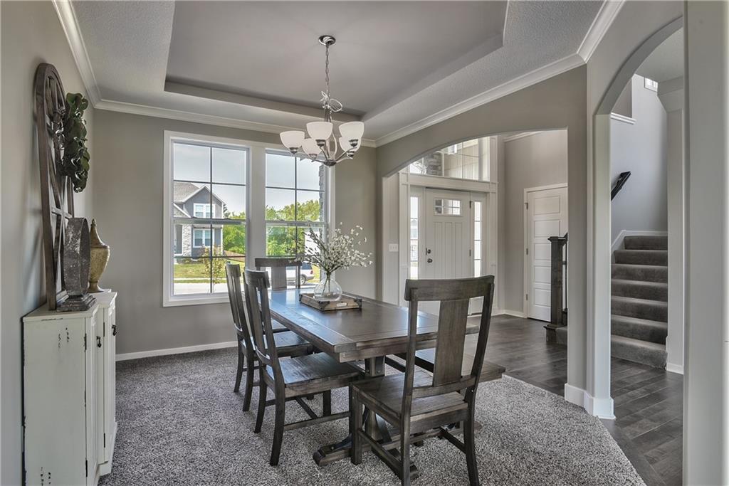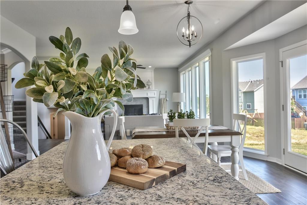 Welcome to the Paxton III by Prieb Homes. This 2 story plan begins with a wonderful front porch leading you into this open floorplan. Nice entry with U-shaped staircase is open to the formal dining room with trayed ceiling. Great room with gas fireplace enjoys the natural light streaming through the windows. The center island kitchen is sure to please, featuring granite countertops, apron sink, custom cabinets with soft close drawers & doors, upgraded cabinet hardware, cabinet hood & built in microwave, stainless appliances and a large walk in pantry. Beautiful hardwood floors run throughout the entry, kitchen, breakfast room and mud room. Walk out of the breakfast room onto the covered patio to enjoy the outdoors. Large first floor guest room with closet can be used as an office, playroom, sewing/craft room, etc. Convenient 3/4 bath is adjacent to the guest room and mud room with boot bench and entry closet. Upstairs you will find three more bedrooms, one with its own private bath. The other two bedrooms share a Jack & Jill bathroom with a large vanity & double sinks. All bedrooms have vaulted ceilings. The owner's suite is a spacious room with double doors & vaulted ceiling. The lovely bath is a quiet retreat with a tiled walk-in shower, separate tub, two separate vanities, linen closet and tile floors. Attached is a large walk-in closet leading into the laundry room which is also accessible from the hallway with built-in bookshelves. Incredible unfinished basement with tons of storage and 3/4 bath stub. Three car garage and sprinkler system. Prairie Farms is adjacent to the newly renovated Lake Olathe offering tons of outdoor activities. Large community pool, cabana, play area and walking trails. Conveniently located close to schools, shopping, grocery stores, restaurants and highways. Photos are of previous homes and may show some optional features.