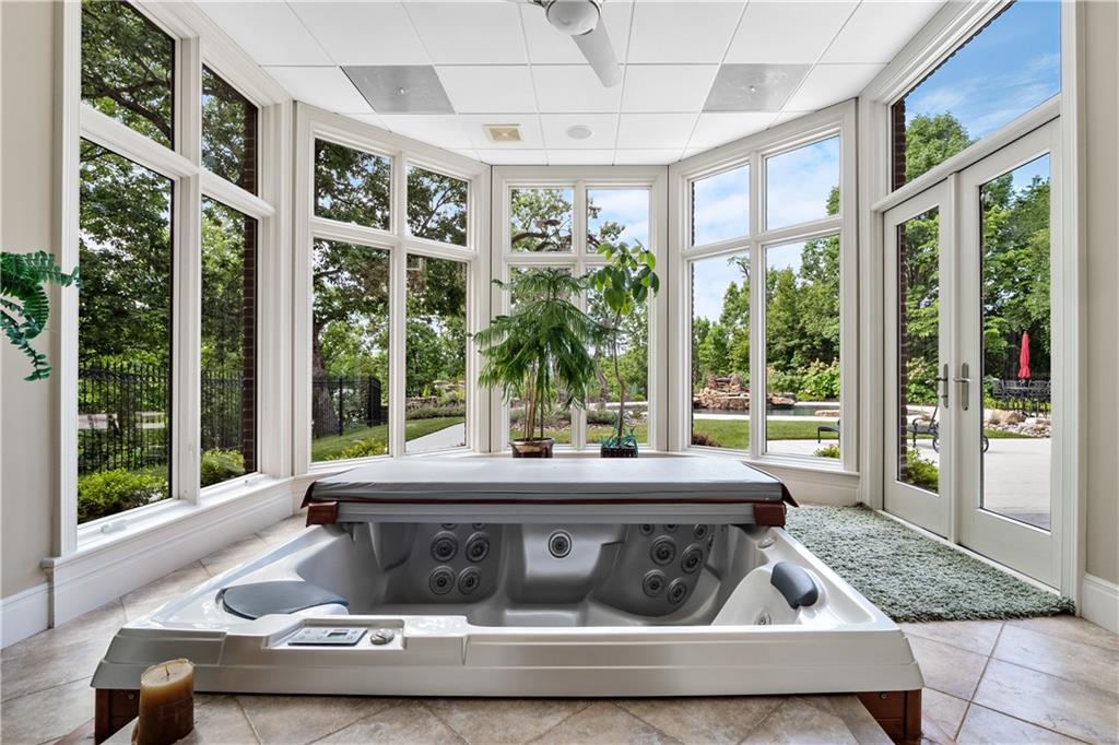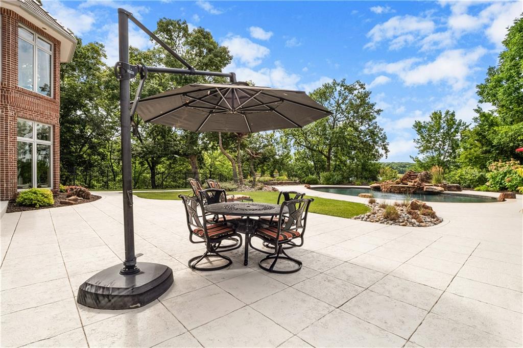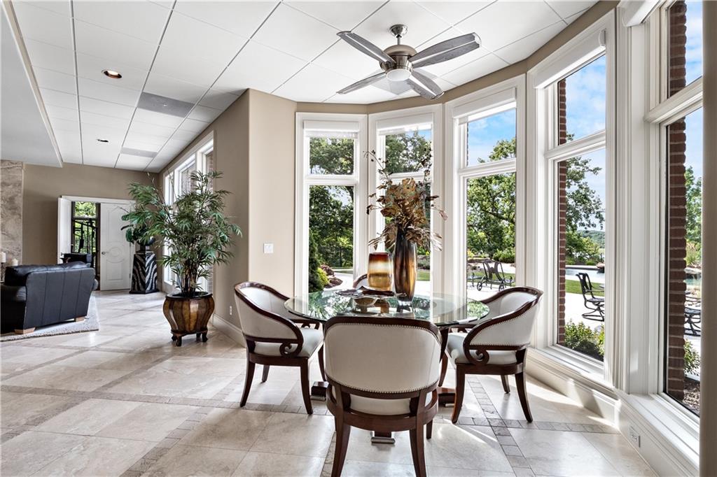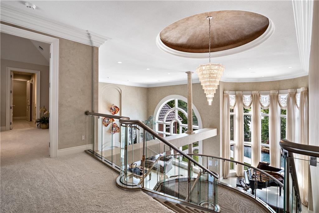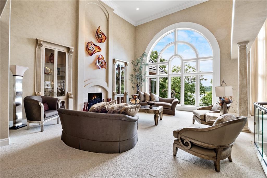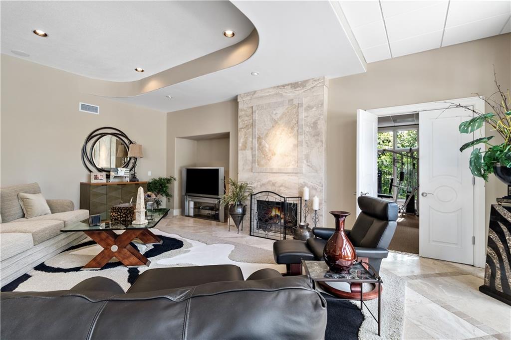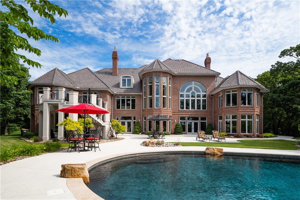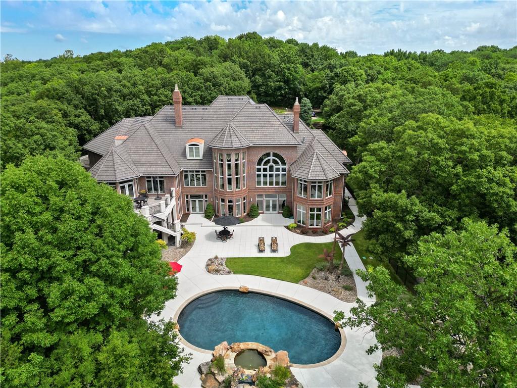 Situated on a private point in the West Shore of Riss Lake, this elegant lakefront residence spans 11,700 sq. ft. on 1.22 acres of beautifully maintained wooded landscape. Nestled within a private gated community, you'll be immediately impressed by the stunning exterior, impeccable circular drive, and custom glass entry. Inside, this meticulously designed home impresses at every turn. From the incredible custom stainless steel and glass staircase to the expansive entertainment area, this home is truly one-of-a-kind. Flooded with natural light, it boasts soaring ceilings and walls of windows. On the main level, you'll find a formal living and dining room, a large office, a separate den, a cozy hearth room, a designer kitchen with Viking and Sub Zero appliances, and a beautiful sunroom with incredible views. The Owner's suite is a retreat filled with special details such as custom ceiling features, a lovely sitting room, expansive closets, a whirlpool tub, and more. The upstairs features a large loft area and three spacious bedrooms, each with private baths and walk-in closets. This home also includes a large gym, a playroom, and a fabulous home theater. For hosting, there’s a full bar and a second kitchen, making entertaining guests an effortless yet elevated experience. Step outside to your own resort-like oasis, featuring a beautiful lagoon-style pool, an outdoor kitchen, and an expansive deck area to entertain or relax and enjoy the lake views. Just off the pool area is an indoor spa room with an attached bathroom and steam shower. The property includes a five-car garage ideal for car enthusiasts, plus a dedicated shop area. Don't miss this rare opportunity to own this masterpiece of craftsmanship located just minutes from MCI Airport, Charles B. Wheeler Airport, downtown KC, and the Plaza. Privacy, luxury, and location at their finest! Taxes and square footage are estimated and should be verified by Buyer's agent.