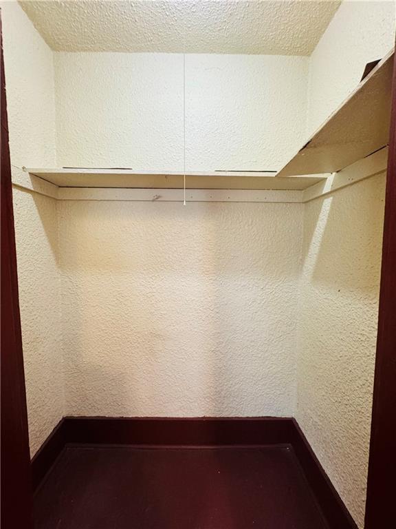 Empty room featuring a textured ceiling and dark hardwood / wood-style flooring