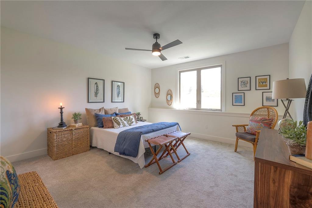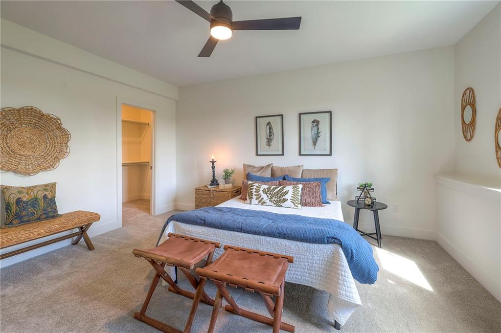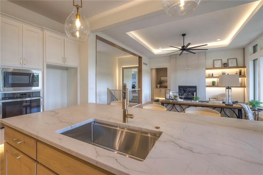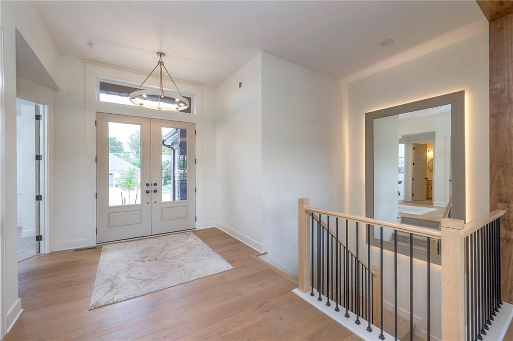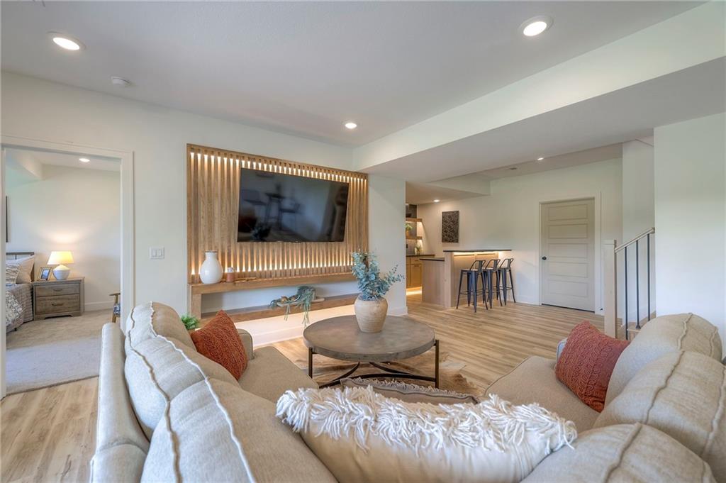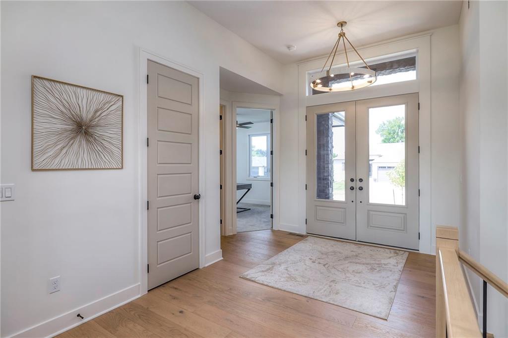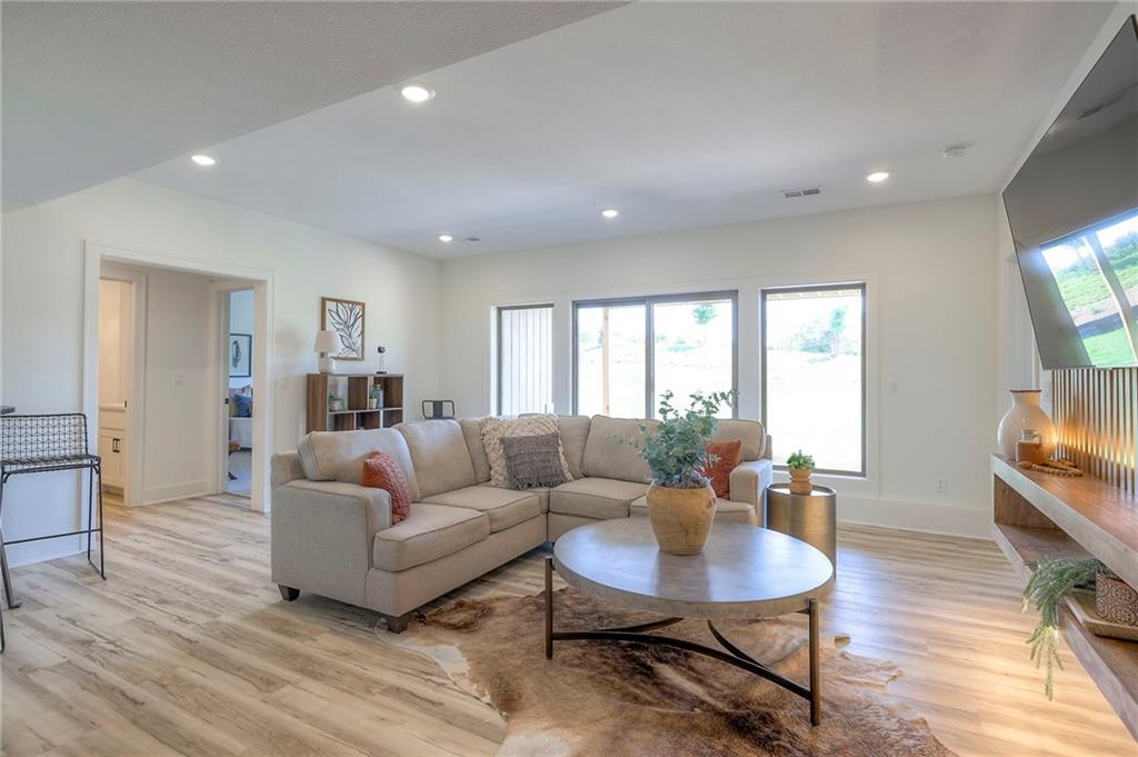 Stunning and spacious Lyle Reverse plan by Bryant Ratliff with 4 Bedroom and 4 Full Baths. Large entry greats you into this open and spacious floor plan. Great room has hardwood floors, soaring ceiling and floor to ceiling stone fireplace. Kitchen features custom cabinetry, oversized island, stainless appliances, walk-in pantry, & access to huge covered deck. Large master suite with custom tiled large shower and sizable walk-in closet with access into the laundry. 2nd bedroom and full bath on main floor. Lower level features family room w/custom tv wall, bar area and 2 additional bedrooms each w/their own baths. Walk out to a patio with large yard backing to bermed greenspace. Home is located on an estate lot and includes lawn irrigation. Home is located in Woodland Trails, an outdoor lifestyle community featuring miles and miles of paved walking trails, resort style pool, playground, sports field and fishing ponds.