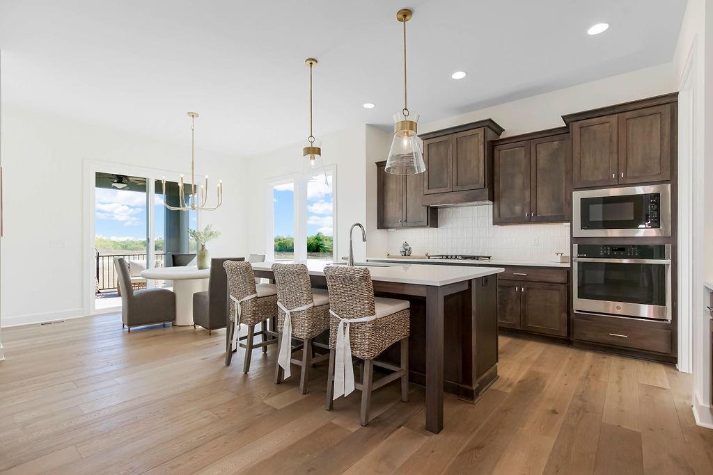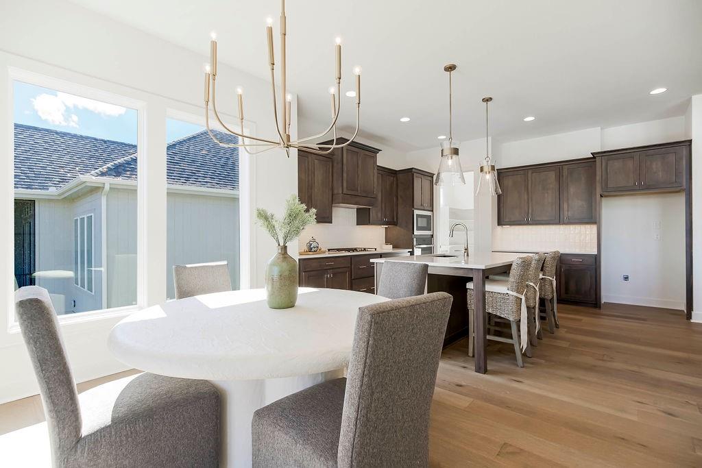 Beautiful Hudson Plan by Rodrock Homes. This home features the Primary Suite and a second bedroom on the main level plus 2 bedrooms in the lower level. Although this plan has spacious rooms, it has a cozy feel with plenty of room for dining and entertaining. The kitchen features beautiful cabinets, a large walk-in pantry, island with quartz countertops and the range hood is vented to the exterior. The primary and main floor baths have quartz/granite countertops. The lower level adds light and versatility to the recreation room and bedrooms. Taxes and square footage are estimated. The neighborhood features a large swimming pool with fountain, play area, 3.8 acre lake stocked for fishing with recreational trails around the lake. Convenient highway access to all points in Kansas City.