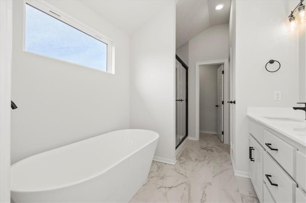 Popular Front to Back Split in Eagles Creek of Blue Springs! Close to completion - come and see the massive quartz island and well designed kitchen! Amazing master suite and large open spaces. Main floor laundry. Huge 3 car garage!