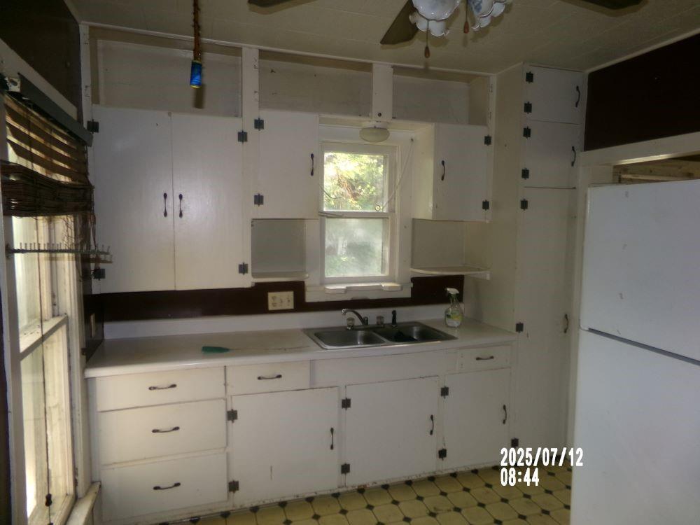 Kitchen featuring freestanding refrigerator, light countertops, white cabinets, ceiling fan, and light floors