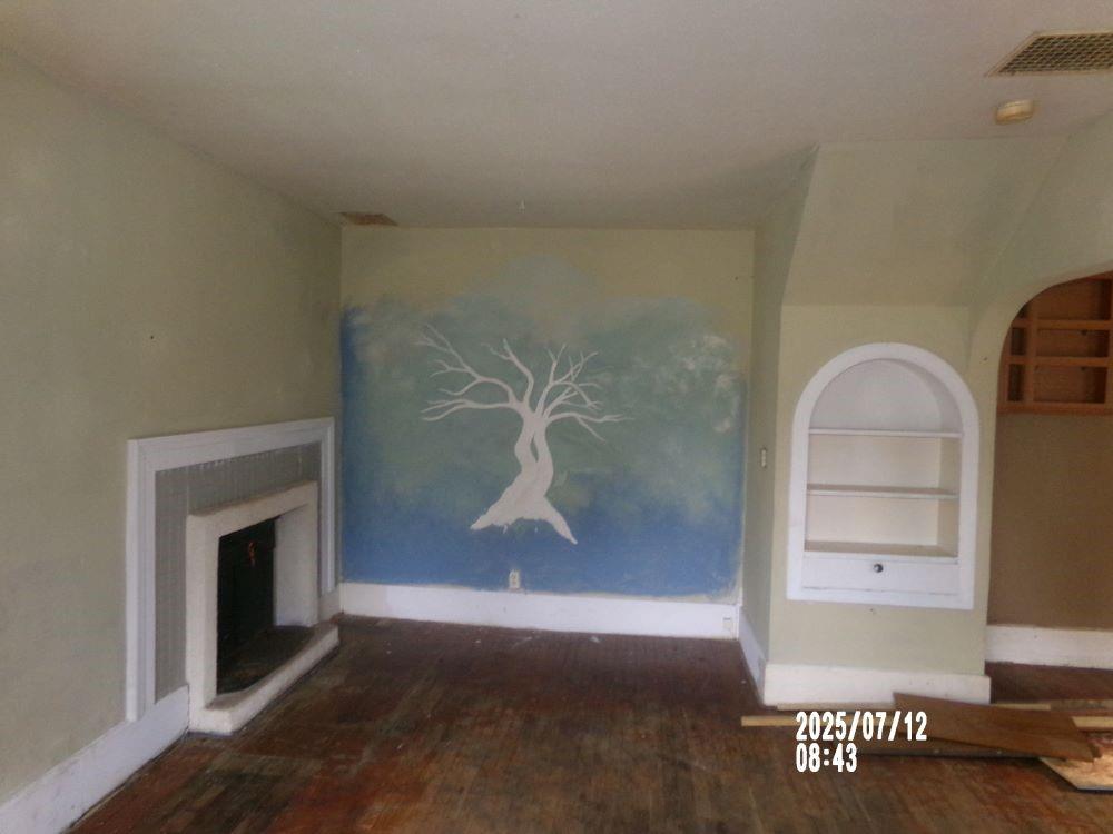 Unfurnished living room featuring hardwood / wood-style flooring, built in features, and a fireplace