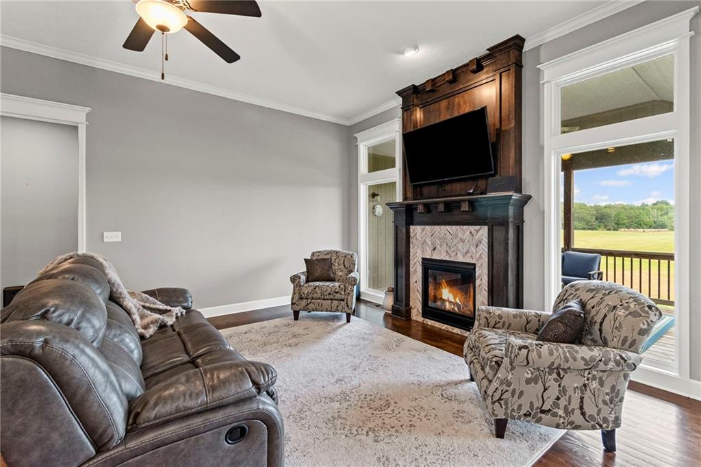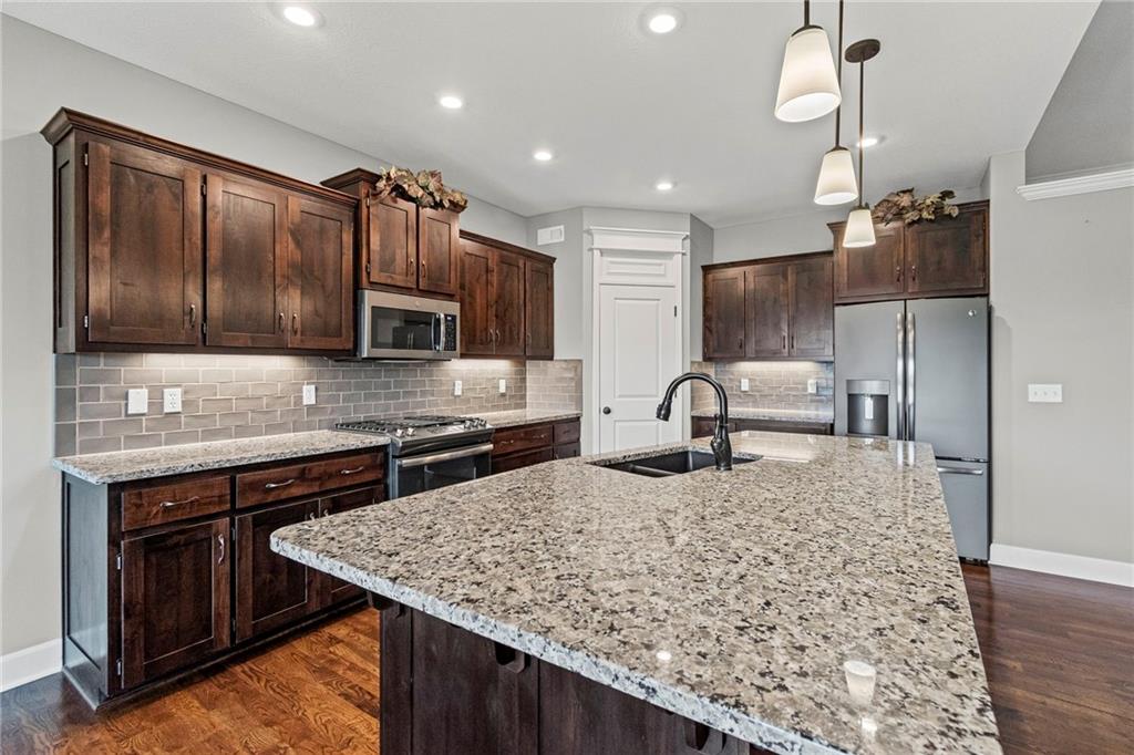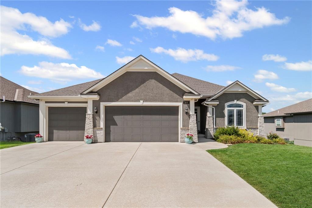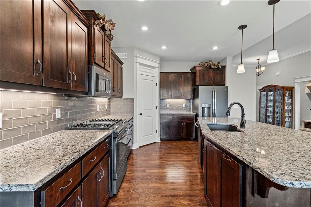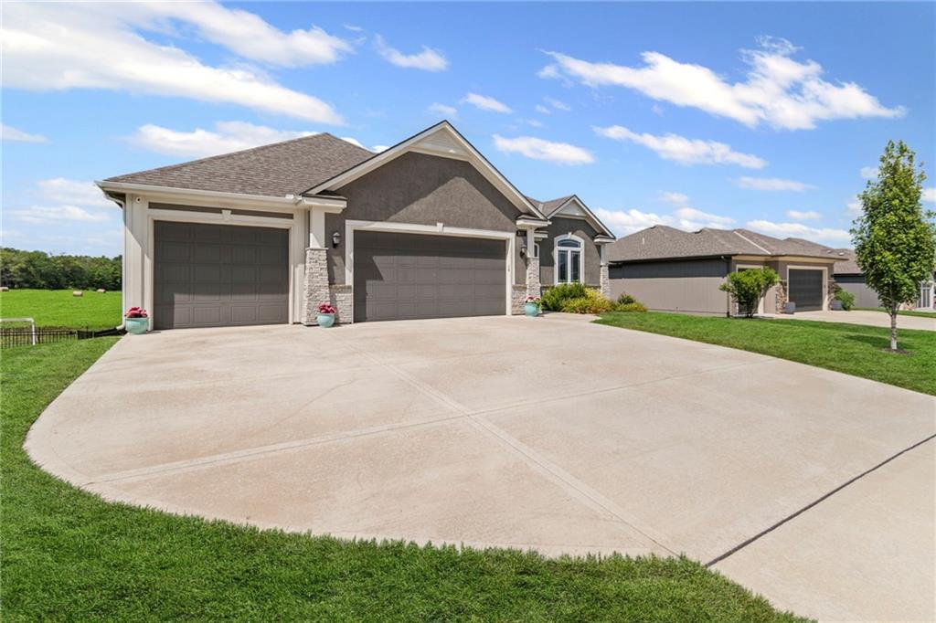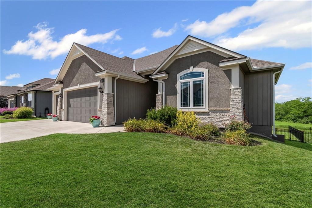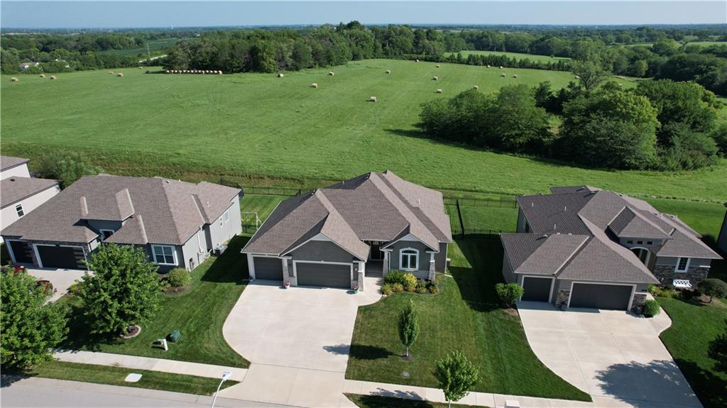 This home is located in the quiet Staley Hills Subdivision which is in the Staley High School zone, New Mark Middle School, and Bell Prairie Elementary. Not many homes are this meticulously maintained. The home has an open concept for everyday living and entertainment and features 4 bedrooms (all with walk-in closets-master closet is amazing in size), 3 full bathrooms, wet bar, extra large laundry room, plentiful unfinished storage, fenced yard (irrigated), walkout lower level. The kitchen has an oversized island, granite countertops, walk-in pantry and stainless steel appliances (appliances stay with the property). The dining area is spacious and will fit a large dining table with plenty of seating. The dining area features large windows overlooking the greenway and open field behind the home where you will be able to view deer, turkeys, an occasional eagle and other wildlife. Outside is a covered deck where you can enjoy peaceful moments and pristine views. Back inside is the great room with gas fireplace and plenty of room for a sectional or multiple seating pieces. The owner's suite (bedroom, closet and bath) are large and spacious; with dual vanities, jetted tub oversized walk-in shower, separate toilet area, and super large walk-in master closet. The owner's bath is directly connected to one of the largest laundry rooms in this price point! The 3 car garage has an extension on the 3rd stall for extra storage or a workbench area. Directly inside the garage entrance is a mudroom/drop zone. In the lower walkout level you will be the "Life of the Party" with entertainment space for billiards, a wet bar and plenty of room for large gatherings. There is also an unfinished area, perfect for storage or future expansion and includes a storm shelter. This home is close to the airport, major highways and interstate (I435, I29, I35, HWY 152,and HWY 169). When someone says: Location-Location-Location, look no further this home has it all.