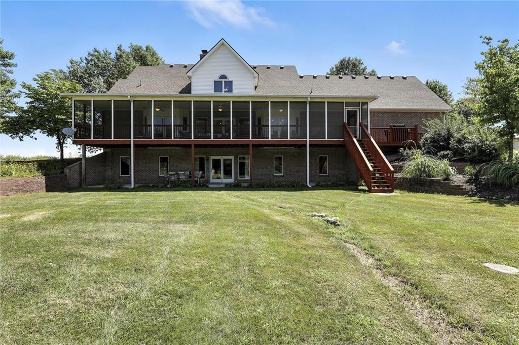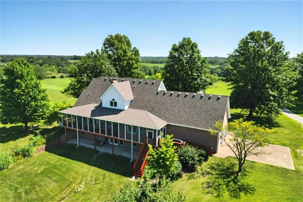 Stunning All-Brick Home on 87 Acres! Welcome to this extraordinary 6-bedroom, 4.5-bath home, nestled on 87 acres of beautiful land. Perfectly designed for both comfort and functionality, this property offers a spacious layout with quality details. Step inside to discover a great room with a striking two-story brick fireplace and rich hardwood floors throughout. The chef’s kitchen is equipped with newer stainless steel appliances, a double oven, two large pantries, and everything you need to create culinary masterpieces - and perfect for family gatherings. The main floor also features a convenient laundry room. Enjoy the expansive bonus room over the garage, ideal for a home office, gym, or media room. Three sets of French doors open up to a screened-in porch and deck, providing an idyllic spot to relax while watching breathtaking sunsets. The finished walkout basement features a full kitchen, perfect for entertaining or additional living space. The home boasts a central vacuum system and 6" wall construction for added durability and comfort. A geo-thermal heating and cooling system ensures energy efficiency year-round. Outside, you’ll find two impressive outbuildings. The first, a 40x60 barn, comes with two 50-amp RV hookups and a frost-free hydrant, while the second 30x40 barn features a 50-AMP RV hookup. Three ponds on the property enhance the already beautiful views. Approximately 50 acres are planted with soybeans under a sharecrop agreement, adding an agricultural benefit to this expansive estate. Located just 10 minutes from Smithville Lake, this property offers the perfect balance of privacy and convenience. Don't miss your chance to own this remarkable home and acreage!