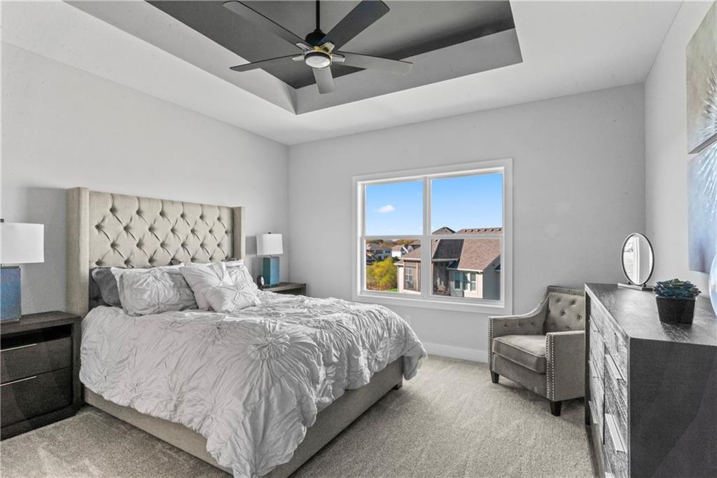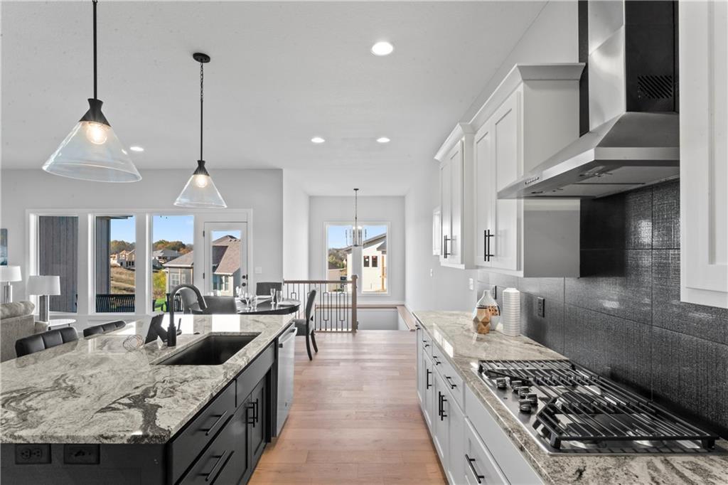 Stonebridge Villas, New Construction. The Grayson by New Mark Homes. 0.8 mi to Heritage Park • Open reverse 1.5-story • 4 months to completion. The Grayson by New Mark Homes offers open-concept main-level living with 4 bedrooms, 3 baths, and a 3-car garage. Great room features fireplace with built-ins and large windows for natural light. Kitchen includes island seating, walk-in pantry, gas cooktop, and double wall ovens. Dining area opens to covered patio for outdoor dining. Primary suite with dual vanities, tiled shower, and spacious walk-in closet connects to laundry and mudroom. Lower level includes daylight family room, bedroom, full bath, and unfinished storage. East-facing backyard with covered patio and level lawn. Located near Heritage Park, Olathe Lake, shopping, and highway access. Includes photos of a similar model—actual home under construction. Estimated completion in approx. 4 months.