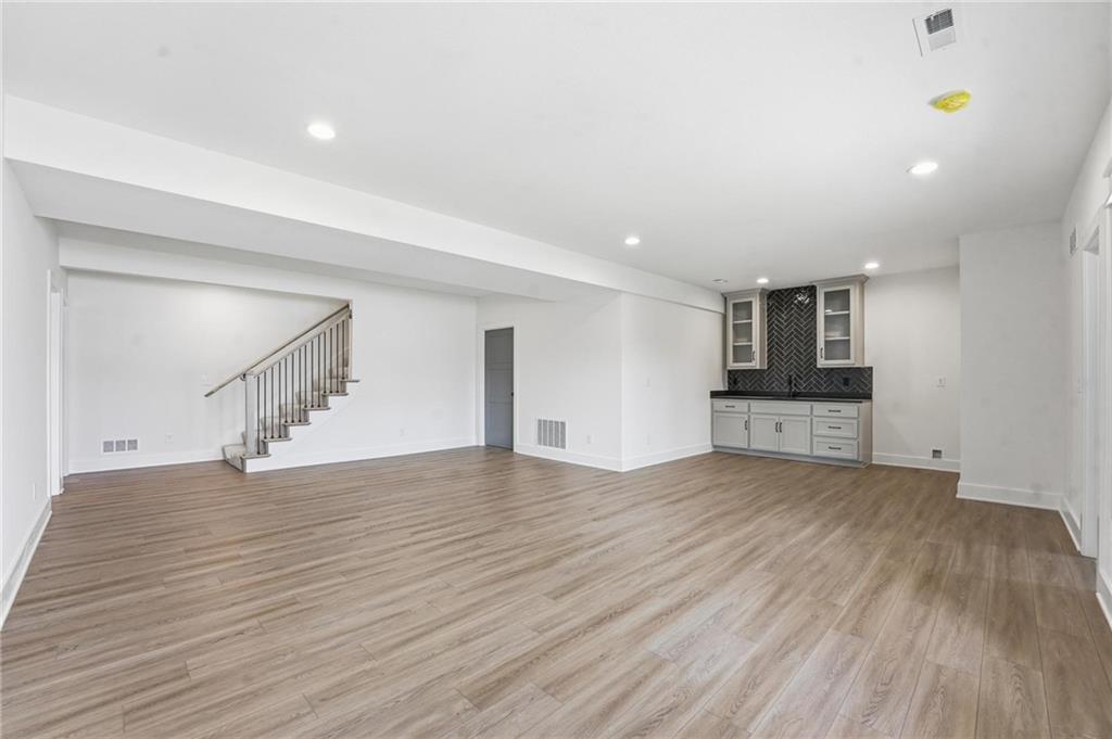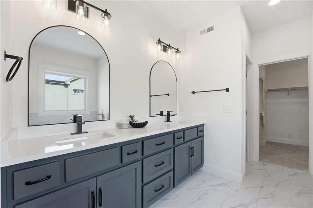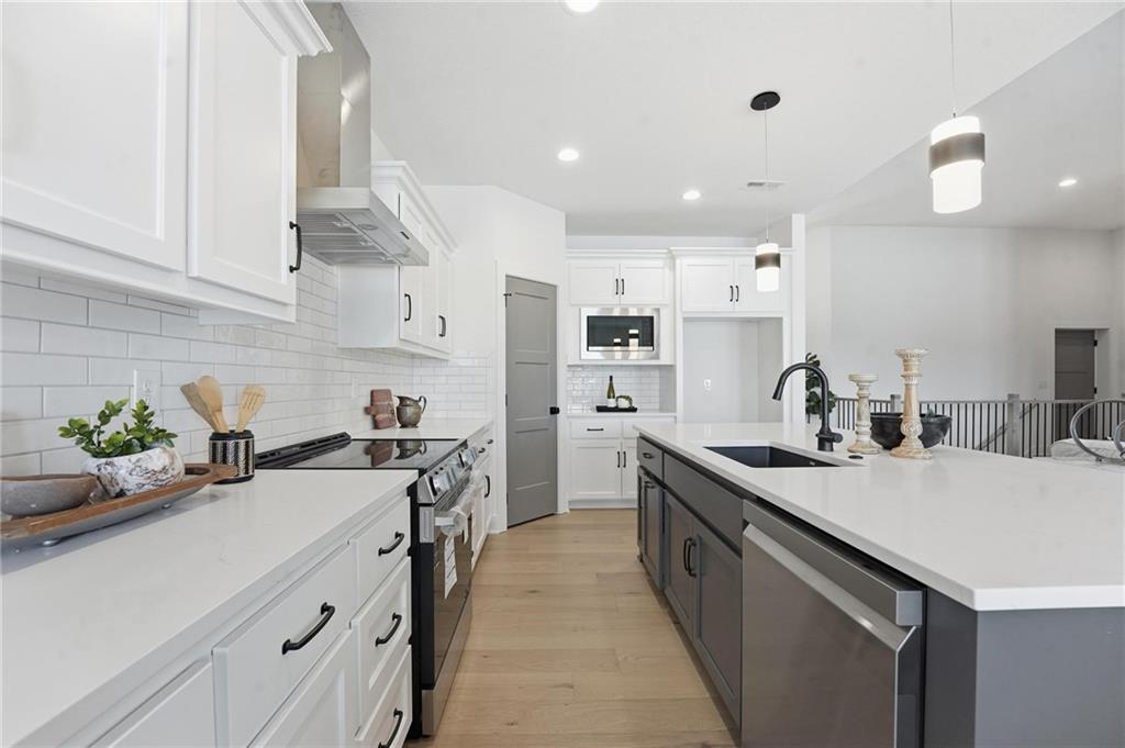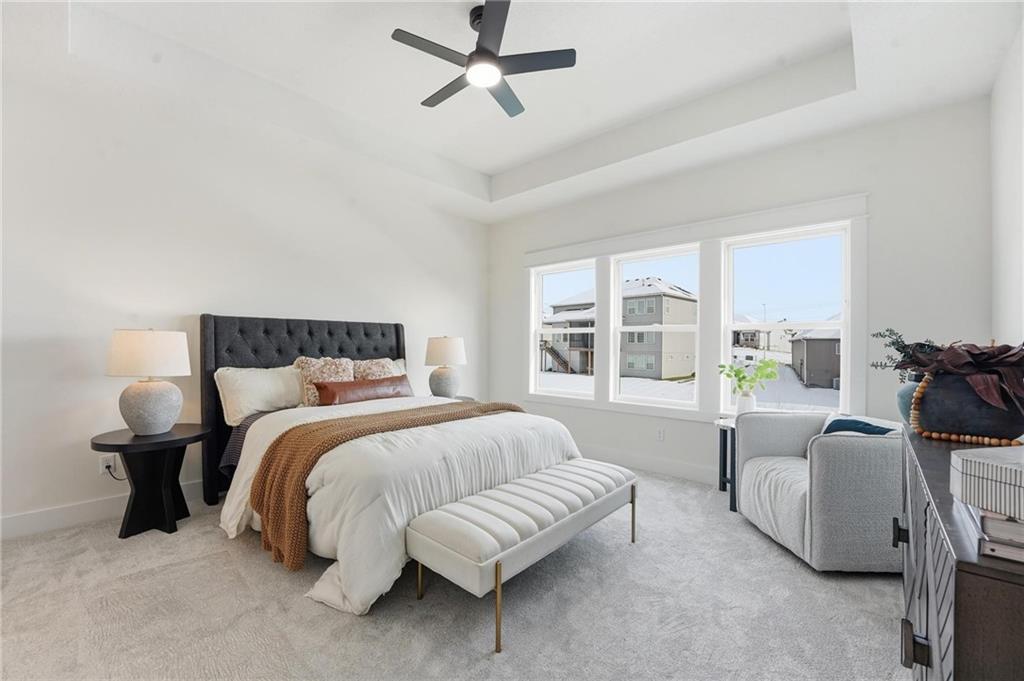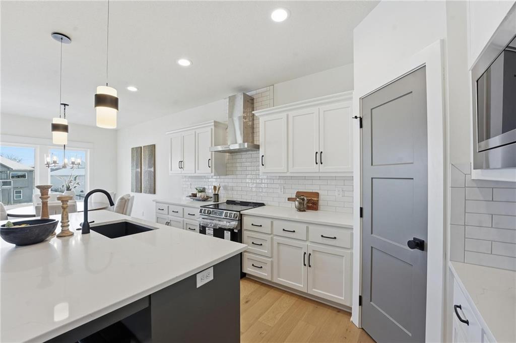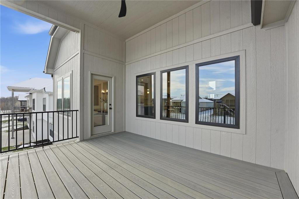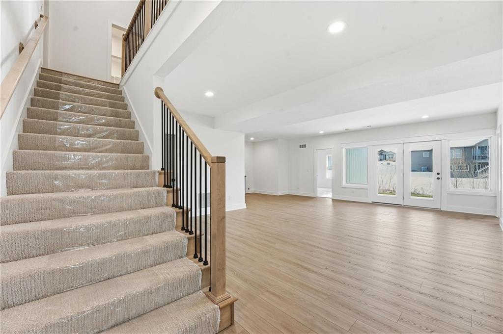 Come explore this recently finished reverse 1.5-story in Riverstone, perfectly situated to back to tranquil common space. With 3,028 sq ft, this home offers 5 bedrooms, 3 full baths, and a 3-car garage—a spacious design that blends comfort and style. Main Level Living: The primary suite and a versatile guest bedroom (currently staged as an office) anchor the main floor. Expansive windows line the back of the home, filling the great room and kitchen with natural light. Step out onto the covered deck to enjoy peaceful views. Lower-Level Retreat: A recreation room with wet bar, three additional bedrooms, and a full bath provide plenty of space for media, gaming, or entertaining. Exterior & Efficiency: Smart siding with stone accents enhances curb appeal, while the builder’s attention to energy efficiency ensures lasting value. This home combines modern design with functional living, offering room for guests, and gatherings. Don’t miss the opportunity to own a property that balances design, efficiency, and community living in one of Kansas City’s most desirable neighborhoods. Taxes, measurements, and square footage are estimated.