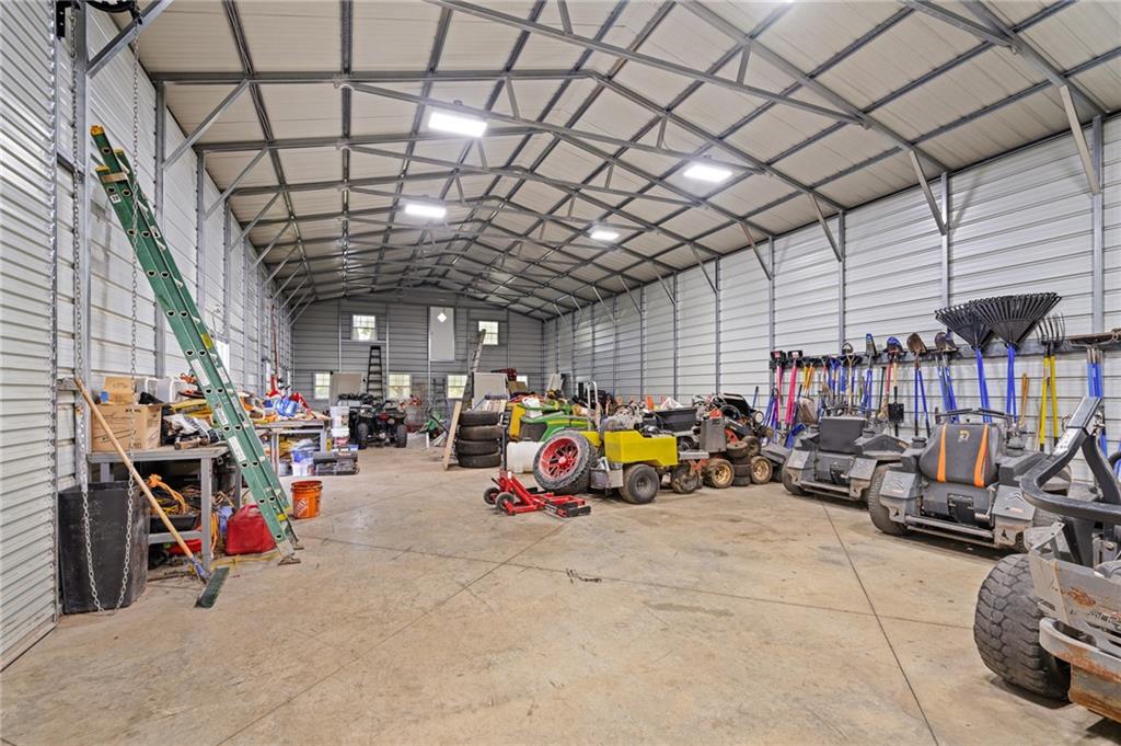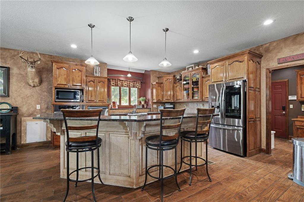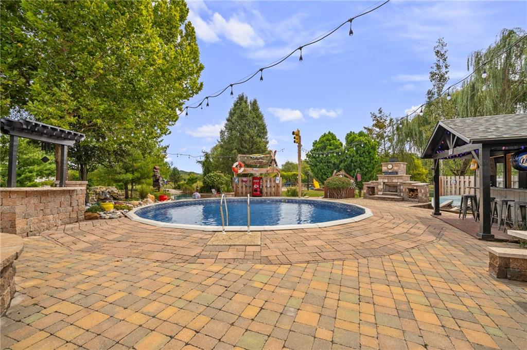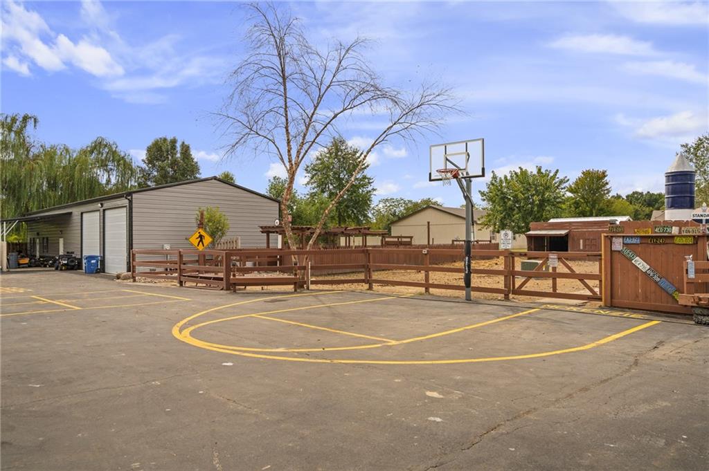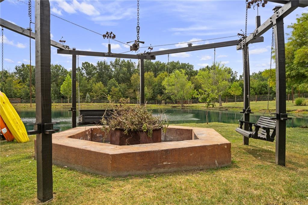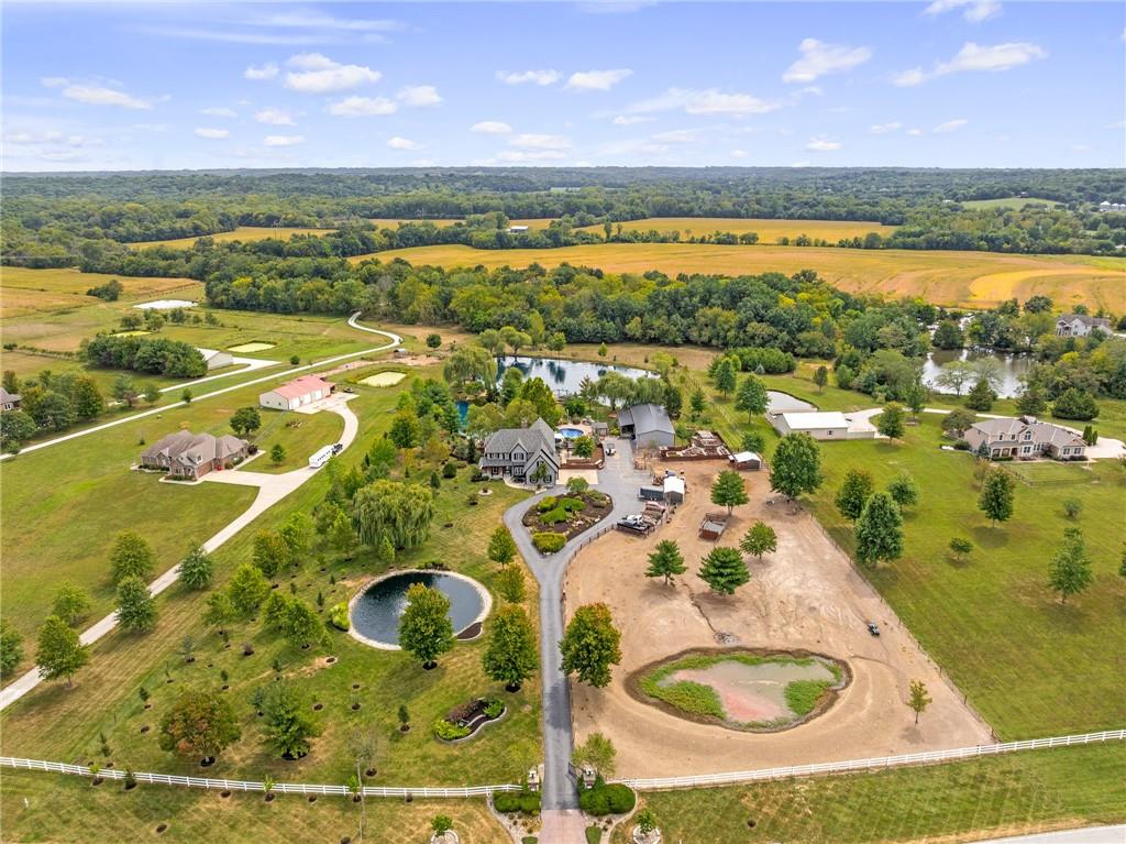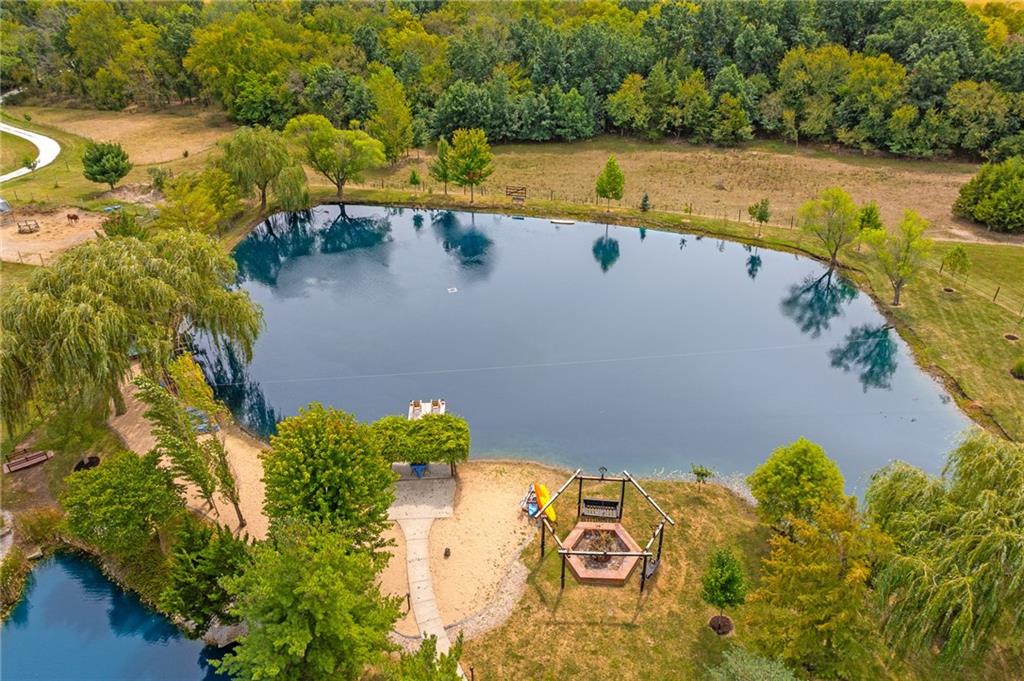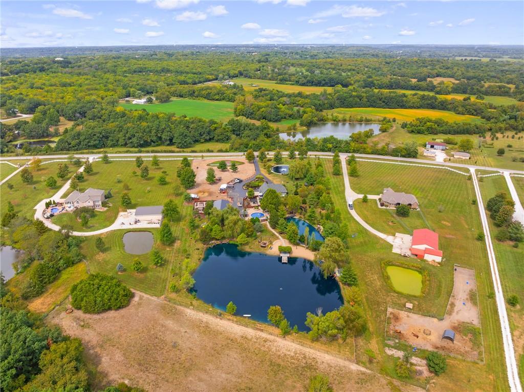 Live, work, and play like never before on this fully fenced, gated 5-acre estate on blacktop in Lone Jack—designed for entertaining, outdoor living, and enjoying the land your way. Whether you're into fishing, paddleboarding, raising chickens, gardening, hosting parties, or running a business from home, this unique property makes it possible. Three scenic ponds set the stage—one with sandy beach, dock, playhouse with hurricane deck, and zip line; another with a 12-foot stone waterfall framed by weeping willows. Outdoor living includes a pool, festive bar, outdoor shower, firepits, fountains, basketball court, and striped parking for nine. A vintage merry-go-round, playground, and wisteria-draped pergola add whimsy, while mature landscaping and unique trees create a lush, park-like setting. Grow and raise what you love: a fenced livestock area with shelters and duck pond supports chickens, goats, or a horse. A large raised garden with drip irrigation and auto-watering is ready for your green thumb. Built in 2006, the two-story home offers comfort and space with hard-surface flooring on the main level, five fireplaces, formal dining, home office, and hearth room kitchen with island seating and Viking six-burner cooktop. French doors open to a fenced dog yard with pergola and hibachi grill—perfect for pets and casual cookouts. Upstairs, four bedrooms each have private baths. The oversized primary suite includes a fireplace, sitting area, walk-in closet, and private covered balcony with mini split—your retreat above it all. The walkout lower level is built for fun and function, featuring a theater, arcade, full bar, non-conforming fifth bedroom, full bath, and access to a saloon-style patio with hot tub and firepit. A newly built outbuilding adds flexibility—with concrete floor, two oversized overhead doors, built-in compressor, and plumbing for future living quarters. Ideal for equipment, hobbies, or home-based business use.
