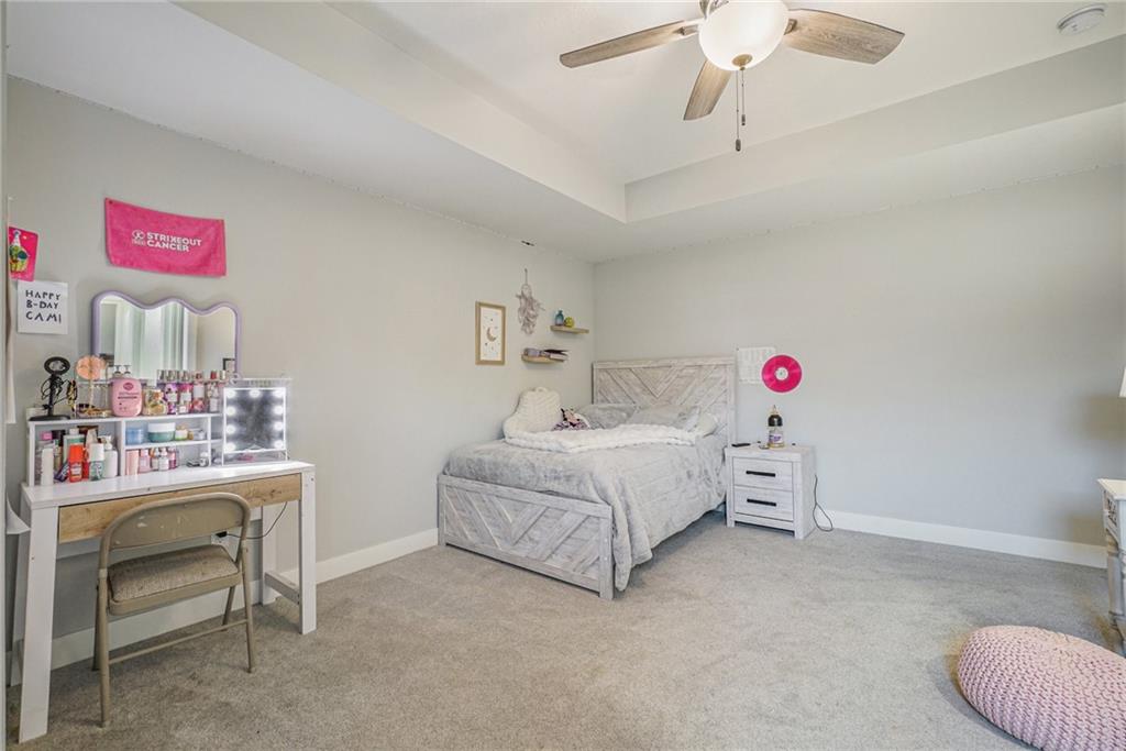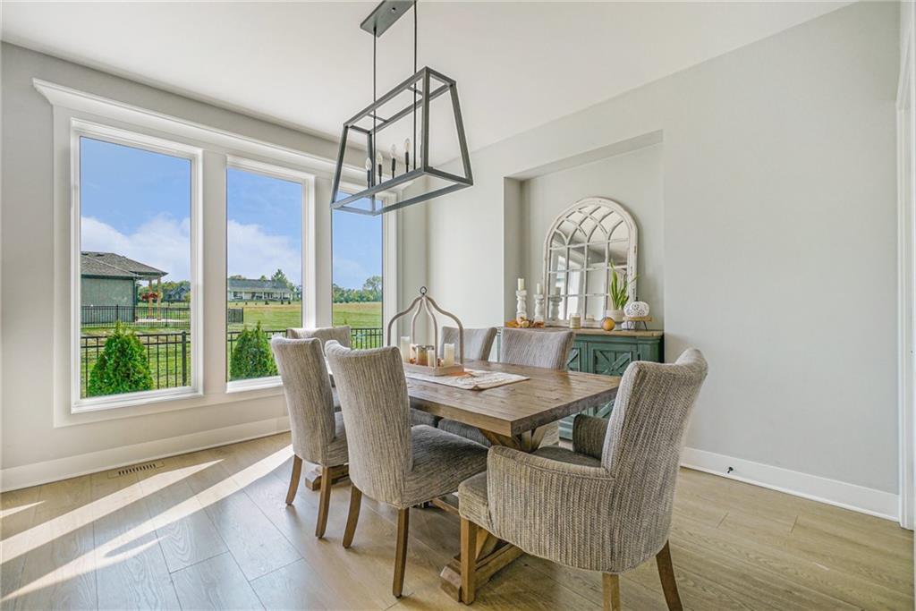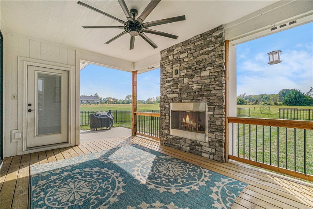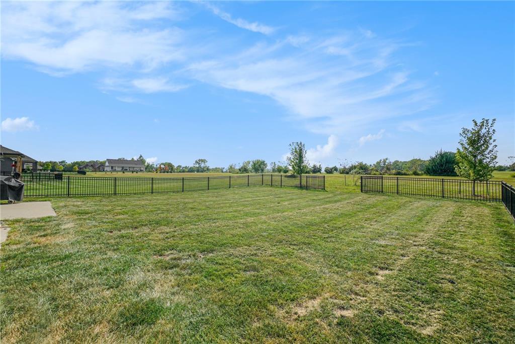Beautiful 5-bedroom, 4.5-bath reverse 1.5-story home in the popular Shadow Glen of Peculiar. Sitting on 1 acre & backing to open farmland, this tastefully modern home, framed in 2x6 construction, features a fenced portion perfect for kids, pets, or a pool. The oversized 3-car garage with high ceilings includes a tandem bay for storage, a workshop, or even a golf simulator, plus a 40+ ft pad with a 50-amp connection for an RV or trailer. Inside, light, modern tones leading to a spacious open living, kitchen, & dining area. Living room showcases a stacked stone fireplace with custom shelving & cabinets. Chef’s kitchen boasts a grand island, custom cabinetry, gas cooktop, double ovens, farm sink, & a large pantry with beverage fridge. Step outside to a covered deck with a stone fireplace & an expanded patio that connects to the garage & driveway. Main-level primary suite offers a spa-like bath with double vanity, tiled walk-in shower, & laundry access through the walk-in closet. Laundry room equipped with sink, cabinets & counters. A secondary bedroom with private ensuite bath & a convenient half bath complete the main level. Downstairs, enjoy a versatile flex space with a bar and space for a fridge, opening to a large media/theater room. Three generously sized bedrooms with walk-in closets & two full baths complete the lower level. Shadow Glen continues to be a perfect place to escape the city or raise a family; providing a great blend of residents. Large lots allow for privacy but still holds the feeling of community. Quick access to I49/71HWY & desirable Ray-Pec Schools.