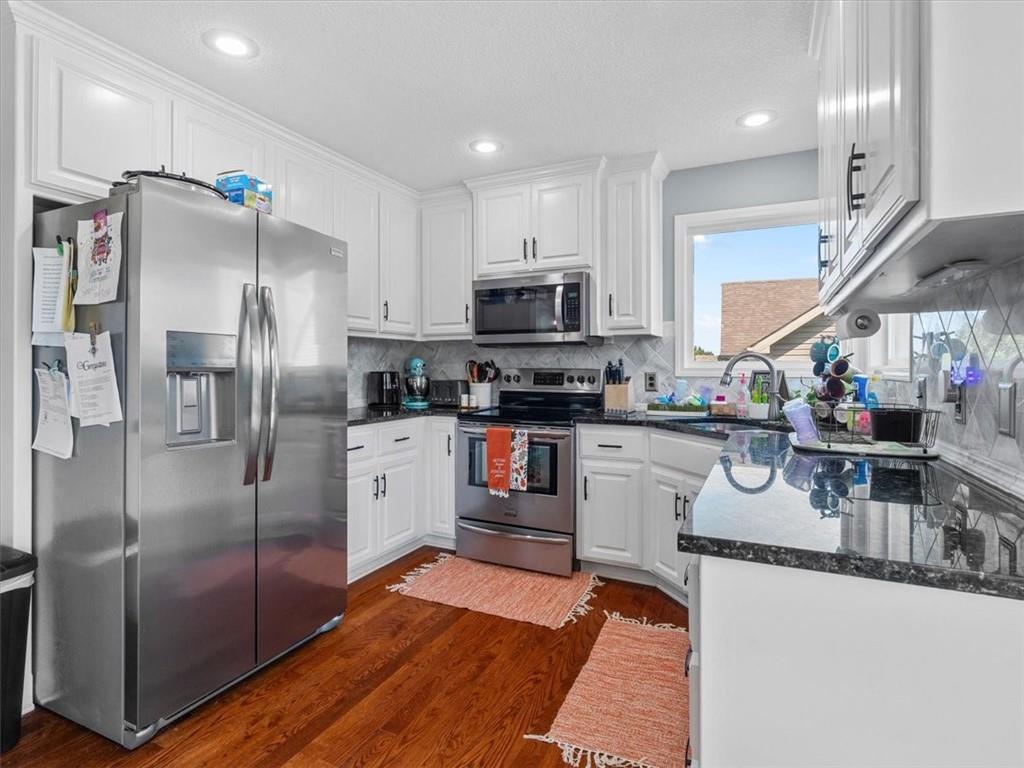 This 3-bedroom, 3-bath home sits on a peaceful cul-de-sac, just minutes from shopping, dining, and highways. The main floor offers a bright family room with fireplace, an updated kitchen with white cabinets, under-cabinet lighting, and beautiful counters, plus the convenience of main floor laundry. Two bedrooms share a full bath, while the spacious primary suite includes its own bath and walk-in closet. The finished lower level adds a second family room, full bath, and walk-out access to the oversized two car garage. Perfect for entertaining, home office space, or movie nights. Enjoy the outdoors with a newer deck, patio, fenced backyard, and fresh landscaping. Recent updates include a new heat pump, interior paint, storm door, updated lighting, hardwood floors, carpet, and a hot water heater tune-up.