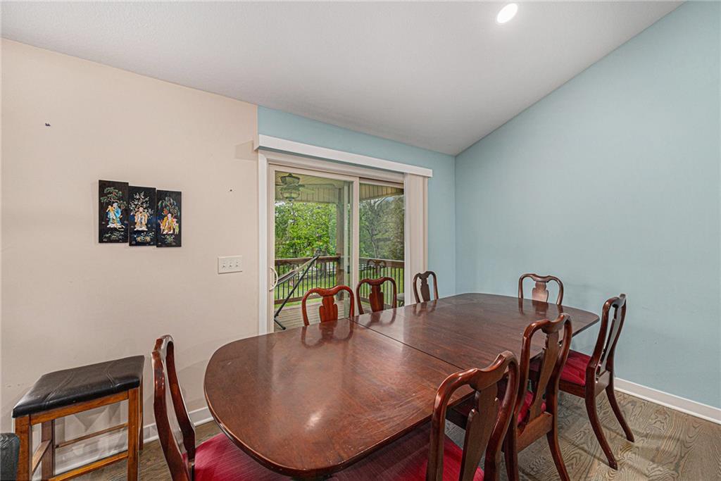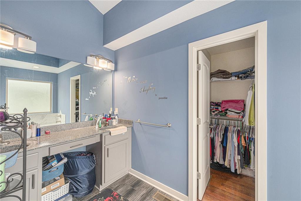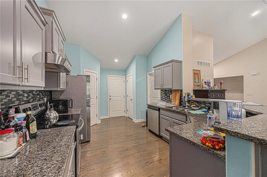Welcome to this impressive four-year-old ranch home, perfectly situated for easy access to North Kansas City, shopping, the airport, and downtown. Featuring a three-car garage with an extra driveway on the third car side, this property combines convenience and modern living. Step inside to discover an open floor plan that seamlessly integrates the spacious family room, highlighted by a cozy corner fireplace, with the dining area and gourmet kitchen. The kitchen boasts elegant granite countertops and stainless steel appliances, making it an ideal space for both cooking and entertaining. Beautiful hardwood floors flow throughout the main level, welcoming ample natural light through multiple windows. The main level includes a serene primary bedroom complete with a private en-suite bathroom featuring a soaking tub, separate shower, and walk-in closet. A second bedroom and additional bathroom are conveniently located in the hallway. The lower level, accessible via carpeted stairs, offers a versatile third bedroom or a fantastic rec room, along with a large finished bathroom. A massive unfinished storage area is also available, equipped with double door access for easy accommodation of yard equipment. Enjoy the outdoors in the completely fenced backyard, featuring a gently sloping yard, an oversized deck (half-covered with a ceiling fan), and an open deck for sunbathing. Steps lead down to a concrete patio below, perfect for summer gatherings. The additional small deck off the third car garage enhances outdoor living options.