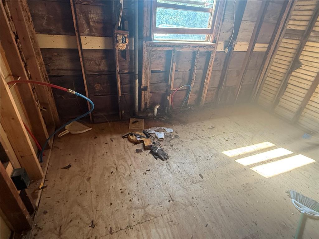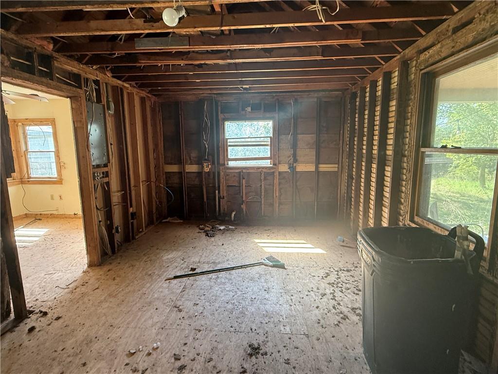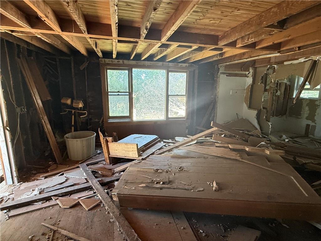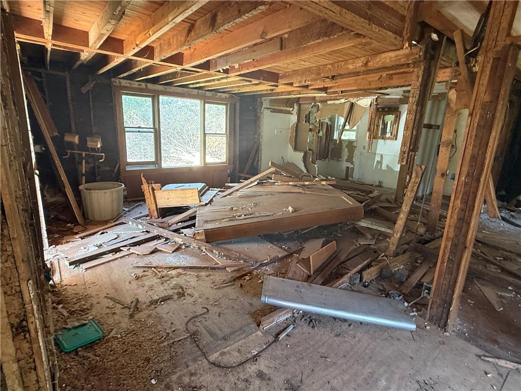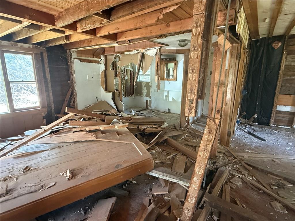 Looking for a secluded project house? This one is situated on 6.63 acres on a paved road. Detached over-sized two car garage. There had been a fire and so it is completely gutted. Some newer electrical and plumbing.