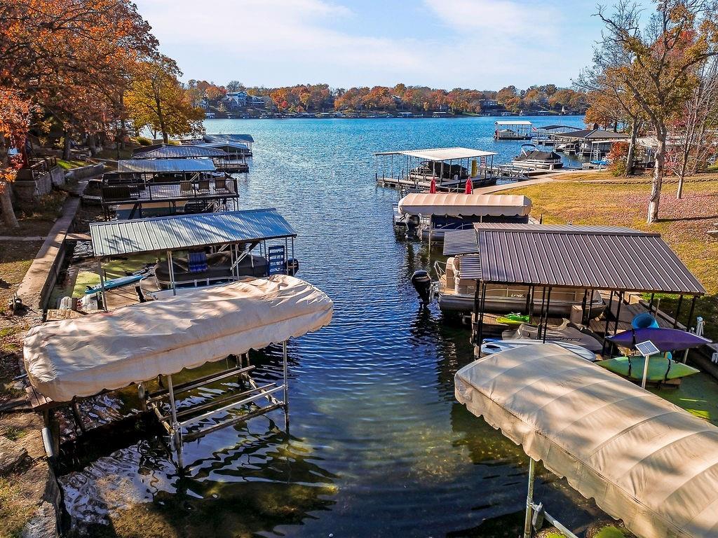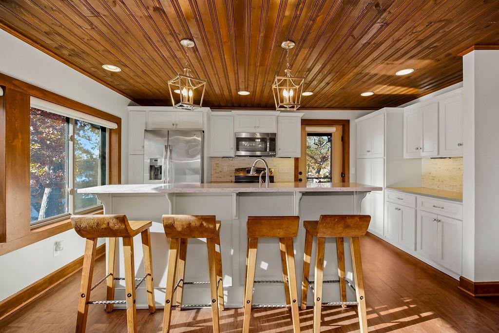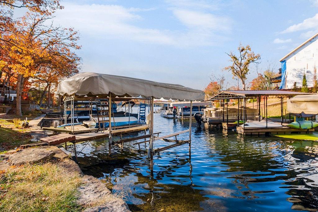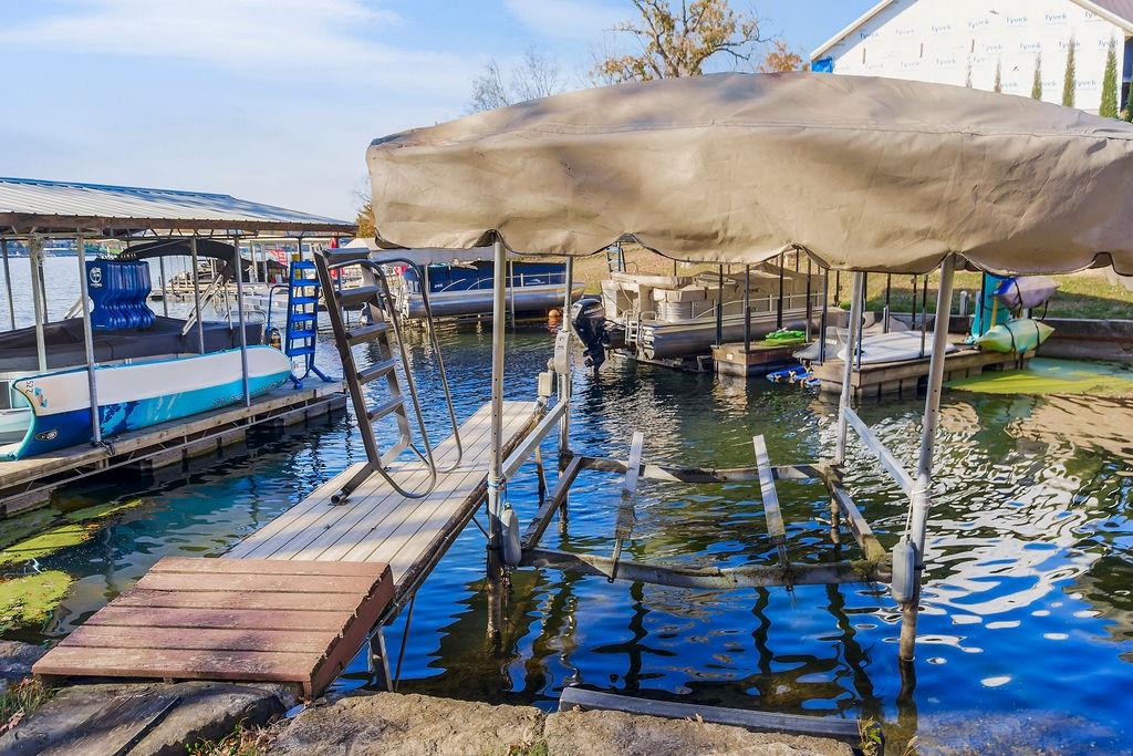 Lake Lotawana's one of a kind, coveted log cabin! Perched on three lots, nearly a 1/2 acre of gorgeous lakefront property with an expertly utilized interior space. The main level greets you with gorgeous, recently refinished 5" wide hardwood floors, a cozy living room that opens to an updated kitchen with quartz countertops and an island with seating. The open, wide staircase leads you to the lower level walk-out that has been completely remodeled in 2022. A modern gas fireplace warms the room along with a bar nook with a mini-fridge and bottle storage. Two spacious bedrooms with egress windows and a full bath are also located in the lower area. The finishes have been constructed with very high quality material and workmanship. The exterior is PERFECT for entertaining. Gorgeous sunset views from the two brand new decks, a firepit area and a private dock with an electric, covered shore station lift. A calm cove, just off the main channel, safer for playing in the water and less dock wear and tear. Improvements galore! Since 2021, HVAC, tankless water, windows, metal roof, flooring, fireplace, electric panel, sliding doors, and decks. Lifetime warrantied foundation piers installed for a strong, sturdy structure. Plenty of space to spread out and not hit elbows with your neighbors and parking for up to 7-8 vehicles, a rarity in Lake Lotawana. This sale includes three lake front lots, the possibilities are endless to build a garage or another home. Lake Lotawana is a sought-after location with Kansas City's only waterfront restaurant accessible by boat. Take your golf cart just a few miles away to the community park, tennis courts, restaurants, and coffee shop. There is always something to do in this community; fishing tournaments, ski, sailing , kayak and community events, and so much more.