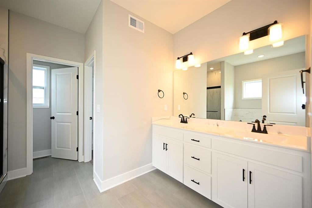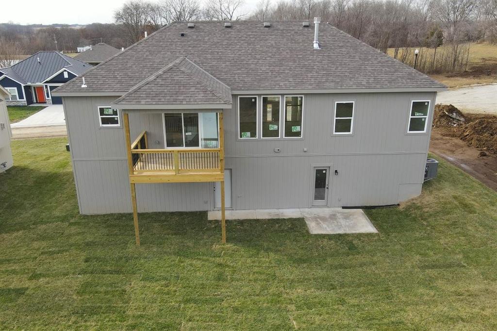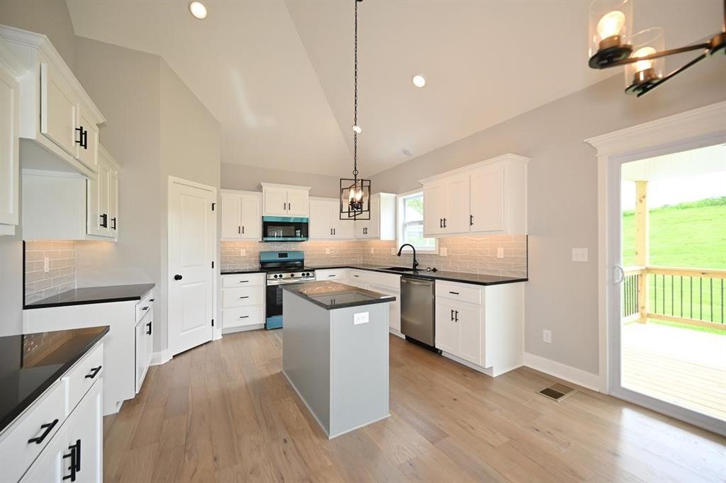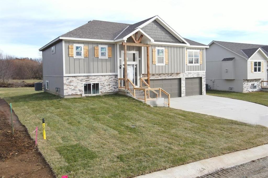 This beautiful home features a range of custom amenities that enhance both functionality and style. The heart of the home features a stunning kitchen with custom white cabinets, a spacious pantry, and an inviting island topped with gorgeous granite. Modern stainless steel appliances add both style and utility, while the covered deck, complete with a ceiling fan, provides a perfect outdoor stocked lake for fishing. The great room boasts LVP flooring throughout, complemented by a beautiful stone fireplace creating a cozy and elegant focal point. The laundry room is efficiently designed with tile flooring and custom cabinetry to keep things organized. The home includes two bedrooms with carpet, each featuring tray ceilings and ceiling fans for added comfort. The guest bathroom is stylishly designed with tile flooring and a tub, ensuring convenience for visitors. The master suite is a true retreat, featuring plush carpet and a spacious walk-in closet. The master bathroom boasts custom cabinets, a luxurious jetted tub, double vanity sinks with sleek black faucets, and a huge tile shower for a spa-like experience. The lower level includes an additional bedroom with carpet and a ceiling fan, along with a full bathroom featuring tile floors and a tub. The home is equipped with ample recessed (can) lighting throughout, showcasing its thoughtful design. Additional highlights include an oversized three-car garage and eye-catching stone accents on the front of the home, making it not only functional but also visually appealing. This property combines elegance, comfort, and practicality, making it a fantastic place to call home! PHOTOS ARE SIMULATED MORE TO COME, LAKE IS STOCKED.