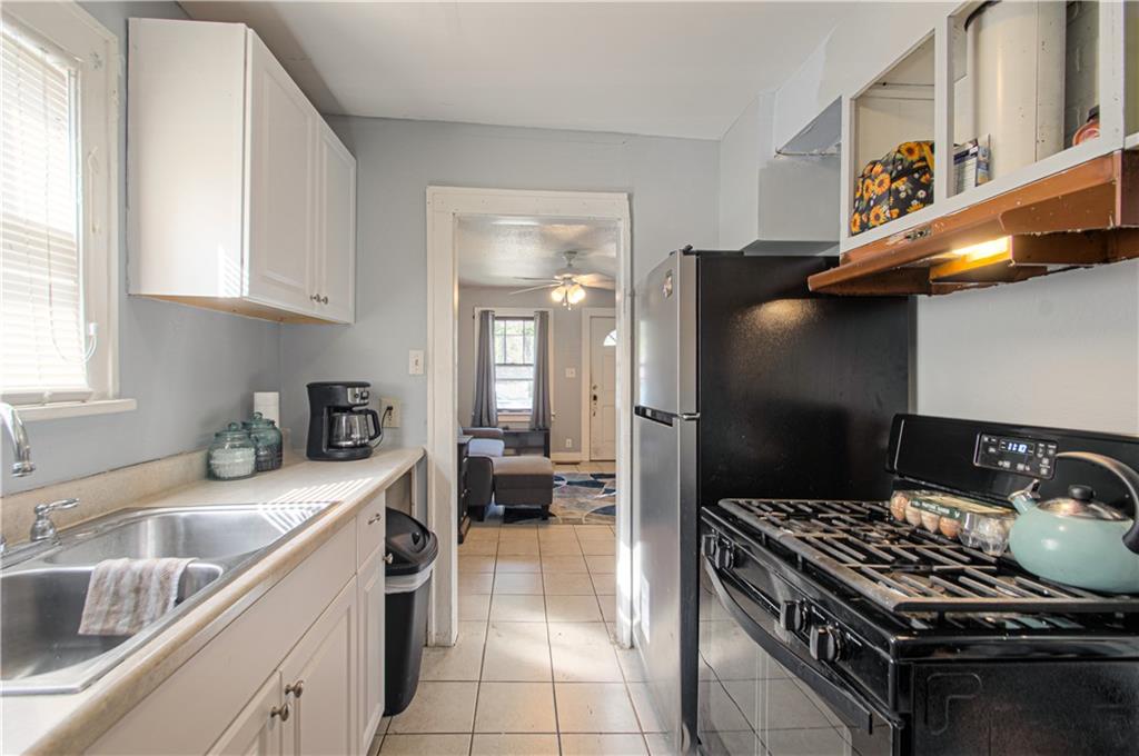 Kitchen featuring freestanding refrigerator, white cabinets, black range with gas stovetop, light countertops, and light tile patterned flooring