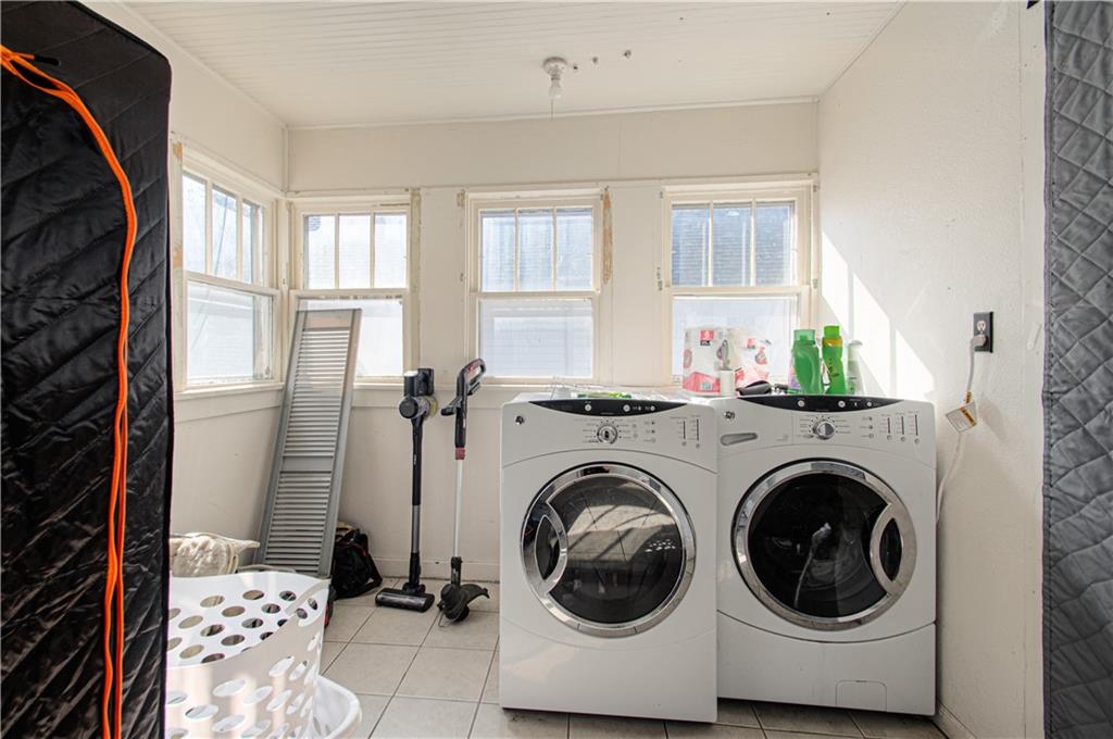 Laundry area with washer / dryer, light tile patterned flooring, and a sunroom