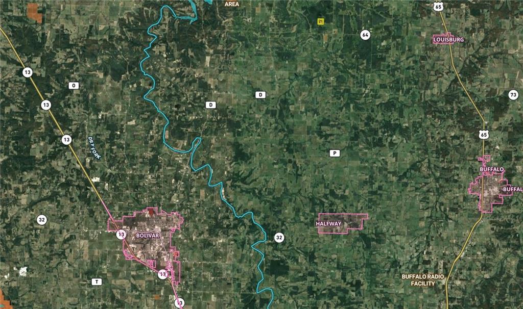 From the intersection of State Hwy 32 and D Hwy in Bolivar, head North on D Hwy for 13.7 miles to Route 64. Turn right on Route 64 and continue for 3.3 miles to SSR-HH. Turn left on to SSR-HH and continue to E 335th Rd. in .5 miles. Turn left onto 335th Rd and continue for .6 miles to Wood Drive. Turn left onto Wood Drive and continue to the property.