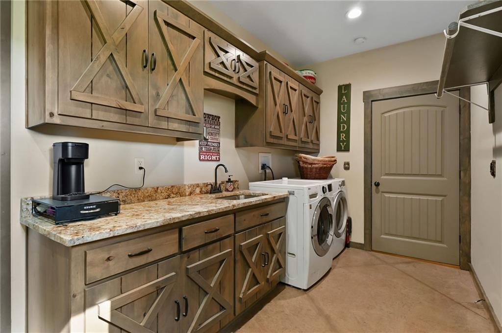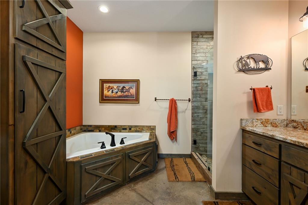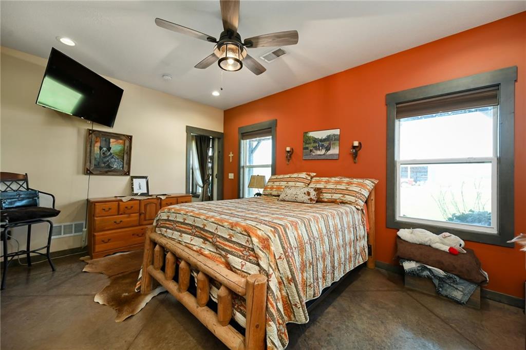 This gorgeous true ranch home on 10 acres offers the perfect blend of quiet country living and modern convenience. Only 4 years young, this home is completely move in ready. From the soaring vaulted ceilings, to the stunning concrete floors, to the impressive kitchen island and custom cabinets, there is so much to love here. Buyers will appreciate more features like walk in closets w/auto lights, the luxurious primary bath, spacious laundry/mud room w/pass through to the primary closet, a new wood burning stove for cozy winter nights, and plenty of natural light and serene views. Enjoy the tranquility and beauty this property has to offer from your covered front porch or covered back patio. Ready for your animals/livestock, the land is fully fenced and cross fenced, featuring a 30x40 metal barn (5 stalls + tack room), a 20x20 lean-to (new tin roof) and chicken coop/run. And with just a few minutes drive to 50 highway, the location is ideal for easy commutes to work or running errands in town. Make this your own little piece of countryside paradise today!