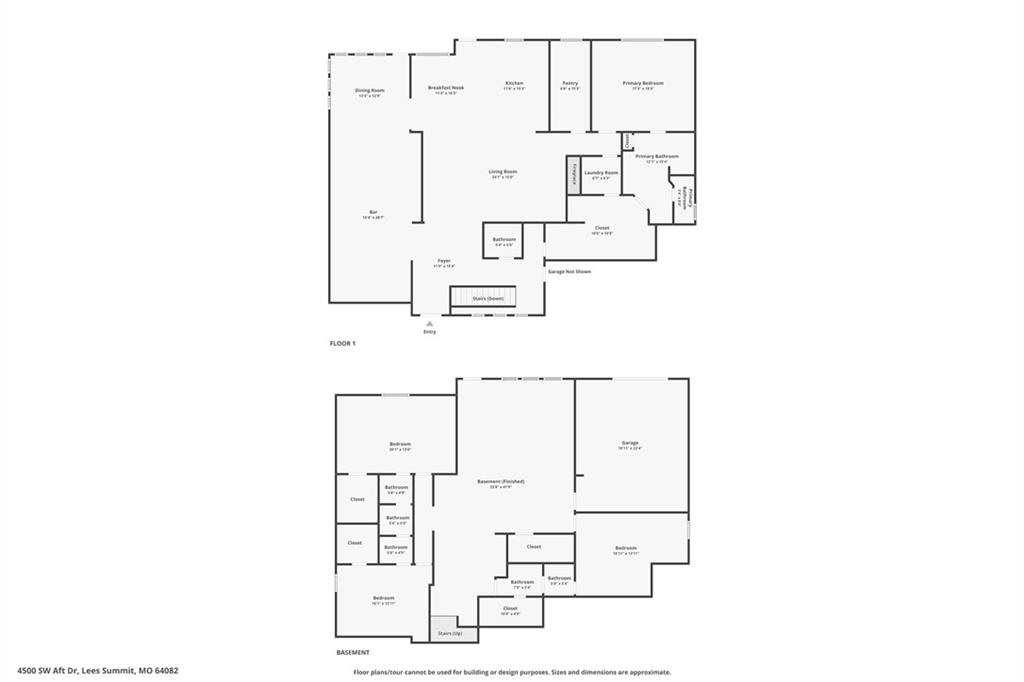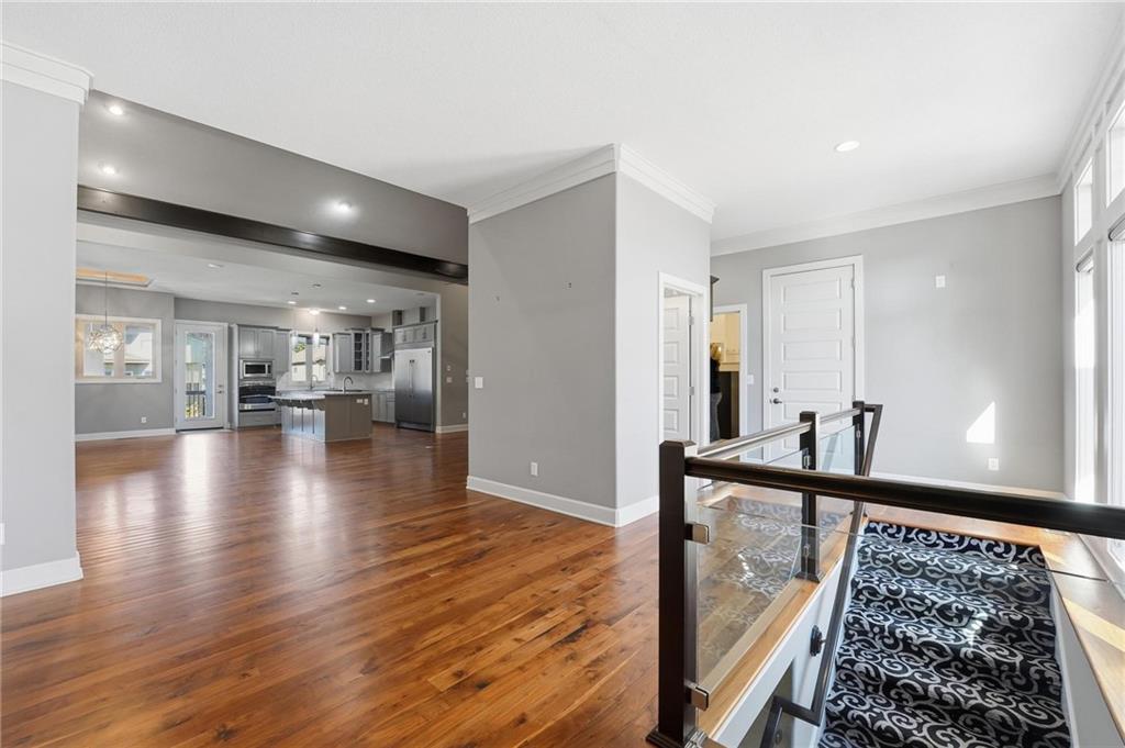Exceptional custom home designed with entertaining in mind. Stunning walnut floors from the gracious entry, through the great room, kitchen & breakfast room. Great room has vaulted ceiling, gas fireplace in stone accent wall, built-ins & floating shelves. Kitchen has large island, top of the line appliances including built-in Frigidaire Professional refrigerator/freezer, cooktop with vented hood, dbl oven, microwave & dishwasher. Pantry is 5x16 with built in desk under window, tons of shelf space. Breakfast nook is ideal for banquet, full glass door out to Lanai, vaulted ceiling, ceiling fan. Bonus main level family room has 19' bar w/custom cabinets, granite counters, stone walls behind bar, 2nd 15' long serving bar with tons of storage, granite countertop & mid century design. Family room has 15' vaulted ceiling with tongue & groove ceiling & beams. A beautiful den space, or room for baby grand piano, under the beautiful fixture plus additional dining space surrounded by windows & door out to large covered Lanai with tile floor. The primary suite is large with vaulted ceiling & luxury bath with separate vanities, very large tiled shower, dream 10x18 walk-in closet with large dresser island, walks through to laundry. Staircase to lower level with custom glass panel railing, large windows flooding the stairway with natural light. Large family room with wet bar area with tiled floor. 1 guest suite with bath & large walk-in closet, 2 additional bedrooms have walk-in closets, each with private vanity spaces, share shower. 1 bedroom has a secret passageway through built-in bookcase, to 8x9 storm area/storage under front porch! New covered patio off lower level family room is 20x13. Car lovers, a bonus 4th garage, has driveway from main level, is 22'd x 19'w. The main level 3 car garage is oversized, 31'wide, with 11' ceiling, 2 car side is 24'deep, 1 car side 29'deep with 9' wide door. North Shore is Cass County, Lee's Summit Schools.