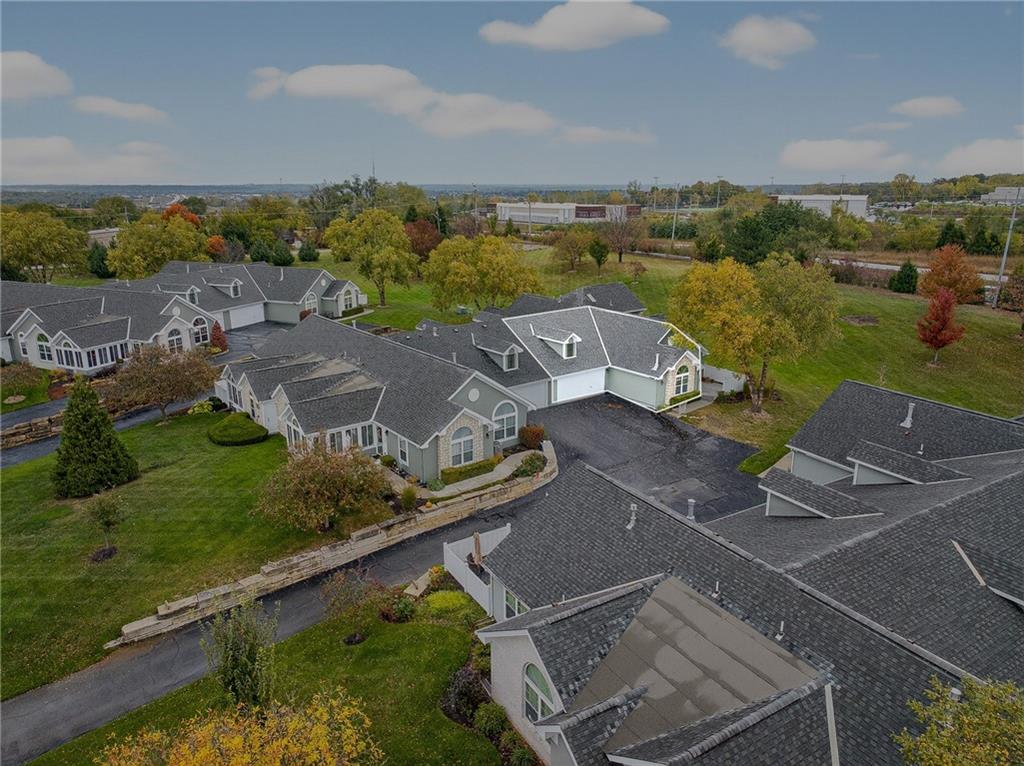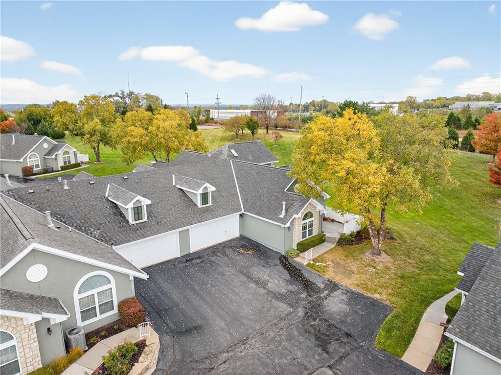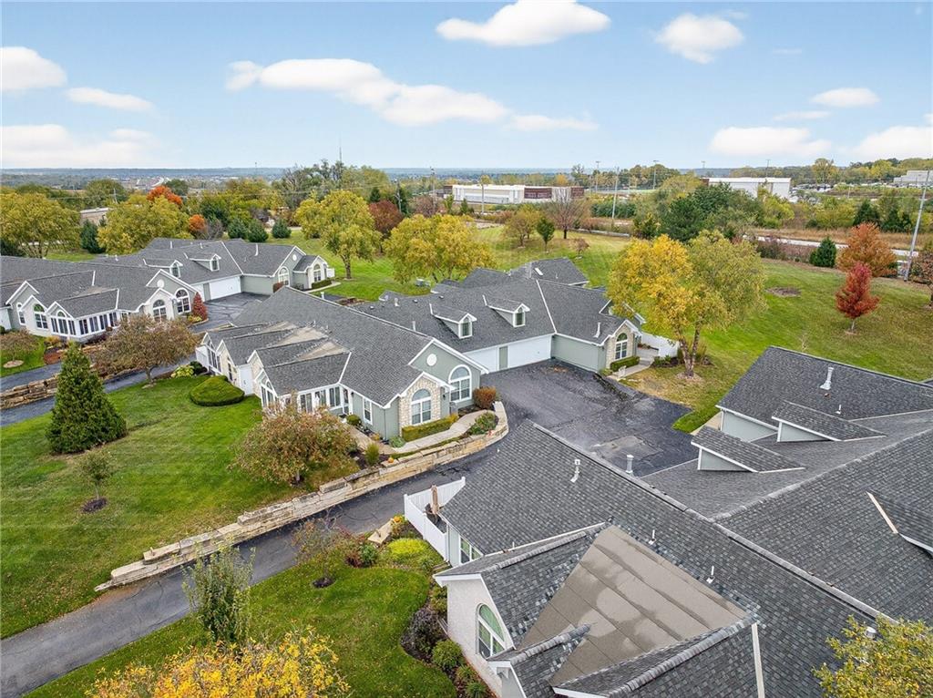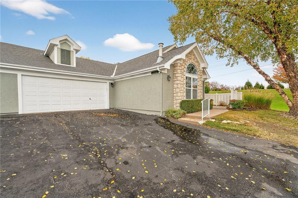 Come tour this charming, spacious Villa located in one of Shawnee’s most sought-after maintenance free communities. This 2 bedroom and 2 full bath is all on one level, and move-in ready with beautiful ceramic tile throughout. This open concept features a living room with vaulted ceilings and a cozy gas fireplace. The vaulted dining and kitchen area offers ample space for entertaining, complete with a breakfast bar for additional seating. The spacious primary suite also has vaulted ceilings, walk-in closet, large bathroom with double vanity and walk-in shower. The secondary bedroom and hall bath ensure comfort for your guests. Additional conveniences include a large two-car garage with extra storage space. The amenities are endless, with a clubhouse featuring a large rec room & bar, exercise room, conference room, game room and a variety of activities for all. Beloved by residents, the Town & Country Villas is a perfect blend of comfort, convenience and community. This is an active and vibrant, close knit community. New roofs are being installed this spring.