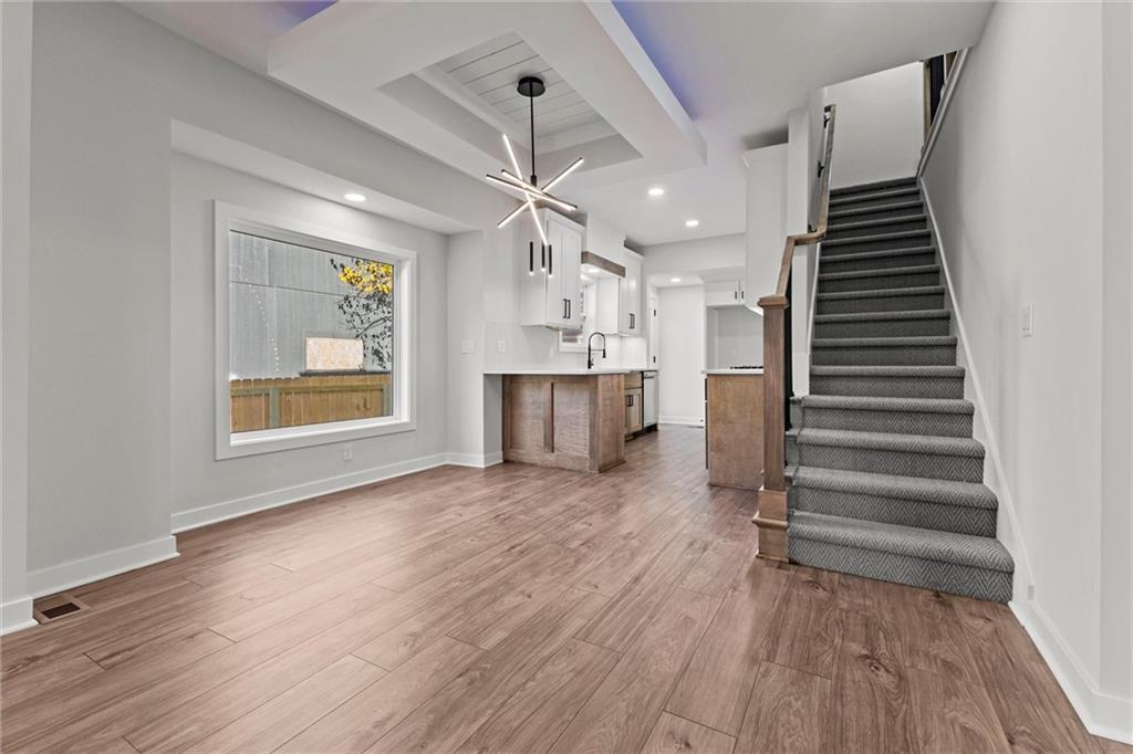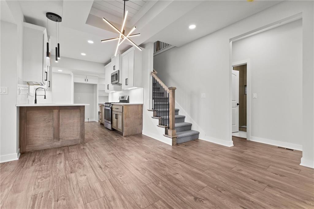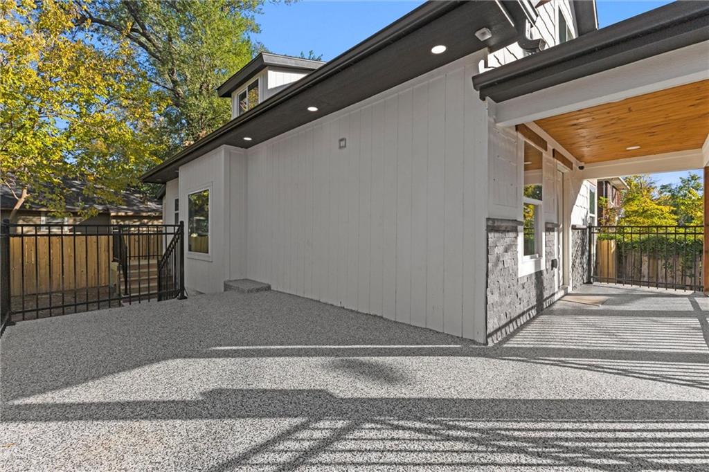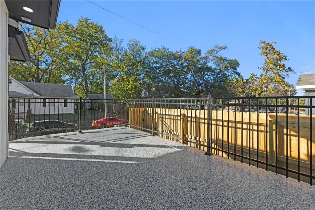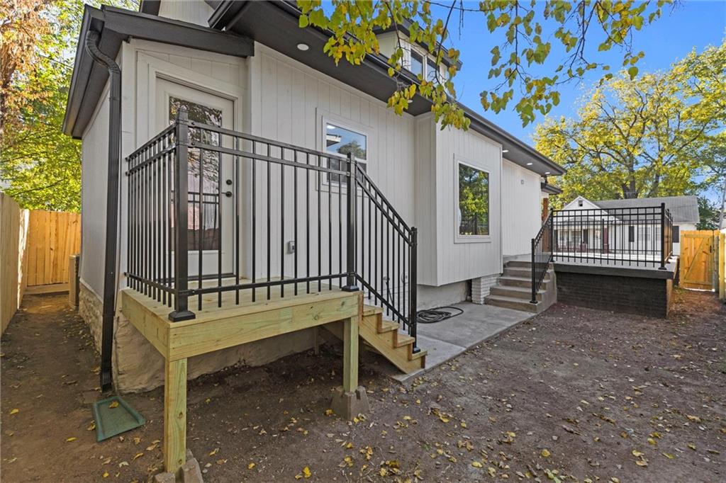 This stunning Kansas City, Kansas home has been completely remodeled from top to bottom — everything is new! Featuring a brand-new roof (6 months old), new gutters (1 month old), new siding, windows, electrical, and plumbing, no detail was overlooked. Step inside to an open and inviting layout with vaulted ceilings, beautiful LVL flooring, and custom craftsmanship throughout. The brand-new kitchen showcases custom cabinets, quartz countertops, a stylish tile backsplash, and all-new stainless steel appliances including a gas stove, dishwasher, and microwave. The bathroom has been fully updated with a sleek tiled shower and designer finishes. The living room features pine ceiling beams, floating maple shelves, a maple fireplace mantel, and shiplap accents that add warmth and character. Enjoy the outdoors with a new covered front porch featuring a metal roof, pine car siding trim on ceiling, and cedar support beams, plus an epoxy-coated front patio with new metal handrails. Upstairs has a spacious bedroom with walk-in closet. The new deck and 6-foot wood privacy fence make the backyard perfect for relaxing or entertaining. Additional upgrades include new sheetrock and insulation throughout, new carpet in the bedrooms, new maple stair handrails with iron spindles, new concrete flooring in the basement, and a new water heater. Located in Kansas City, Kansas, just minutes from Central Ave’s popular restaurants, highway access, and a short drive to downtown Kansas City — this home offers the perfect blend of modern comfort and convenience.