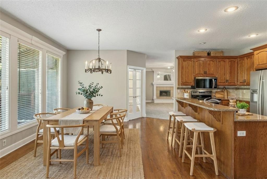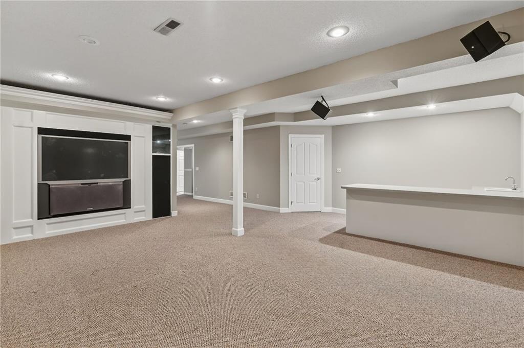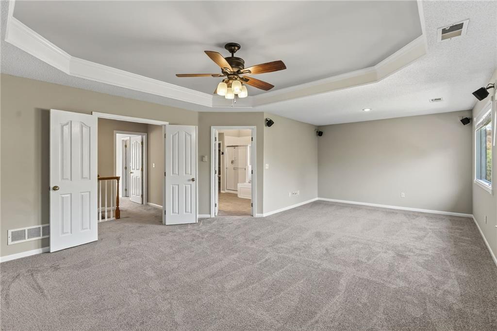 Welcome to a beautifully updated, luxury 4 (5) bedroom, 4.1 bath home tucked in a quiet cul-de-sac on nearly a half-acre lot! Step inside this light-filled residence showcasing elegant architectural details including a grand two-story entry with catwalk, formal dining room with custom wainscoting & bay window, & a spacious home office or bonus room. The expansive living room, anchored by a refined fireplace, flows effortlessly into the enormous sunroom—a stunning space ideal for large gatherings, a tranquil greenhouse, or year-round entertaining. The kitchen and hearth room serve as the heart of the home, featuring a granite island, generous pantry, & brand-new range & microwave—all appliances included. Enjoy the warmth of the second fireplace in the hearth area and a sunlit breakfast nook. Upstairs, the primary suite is a true retreat, complete with a sitting area, spa-inspired bath with jetted tub, abundant cabinetry, and one of the largest walk-in closets you’ll find. A private guest suite features its own full bath and walk-in closet, while two additional bedrooms share a convenient Jack-and-Jill layout with separate vanities. The finished lower level offers impressive versatility & space, including a recreation area with wet bar & theater setup, a game or bonus room ideal for entertainment or a private library, and a non-conforming 5th bedroom with full bath—perfect as a guest suite, fitness room, or additional office. Outdoors, enjoy a resort-style backyard designed for both relaxation and entertainment with a beautiful paver patio and private fenced yard surrounded by mature landscaping. The large basketball hoop, grilling area off the garage, and extra storage beneath the sunroom add both function and practicality. Zoned HVAC with 2 units! This home truly embodies luxury living with everyday comfort—offering space, style, and an unbeatable Overland Park location. Virtually staged to illustrate the home's potential. No physical furniture present.