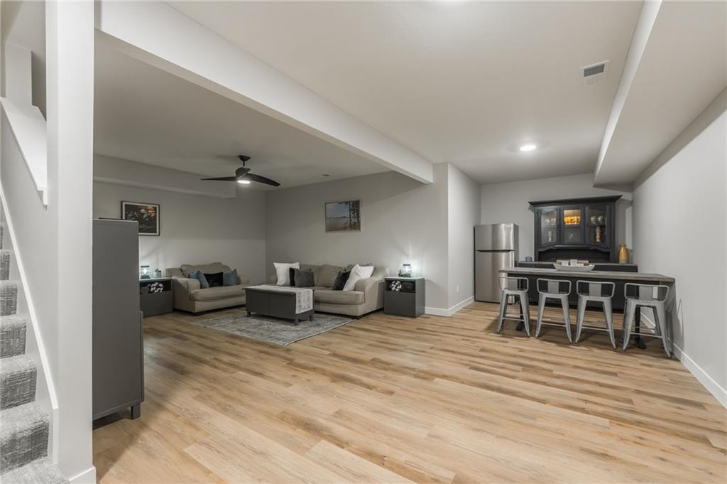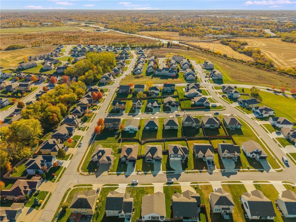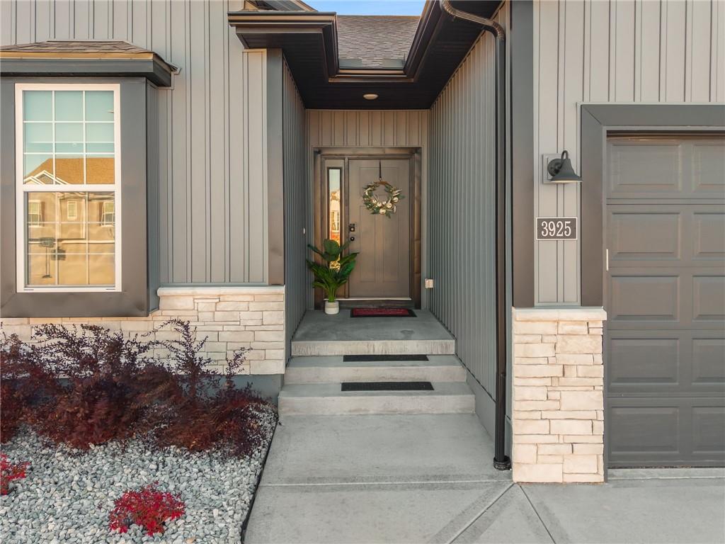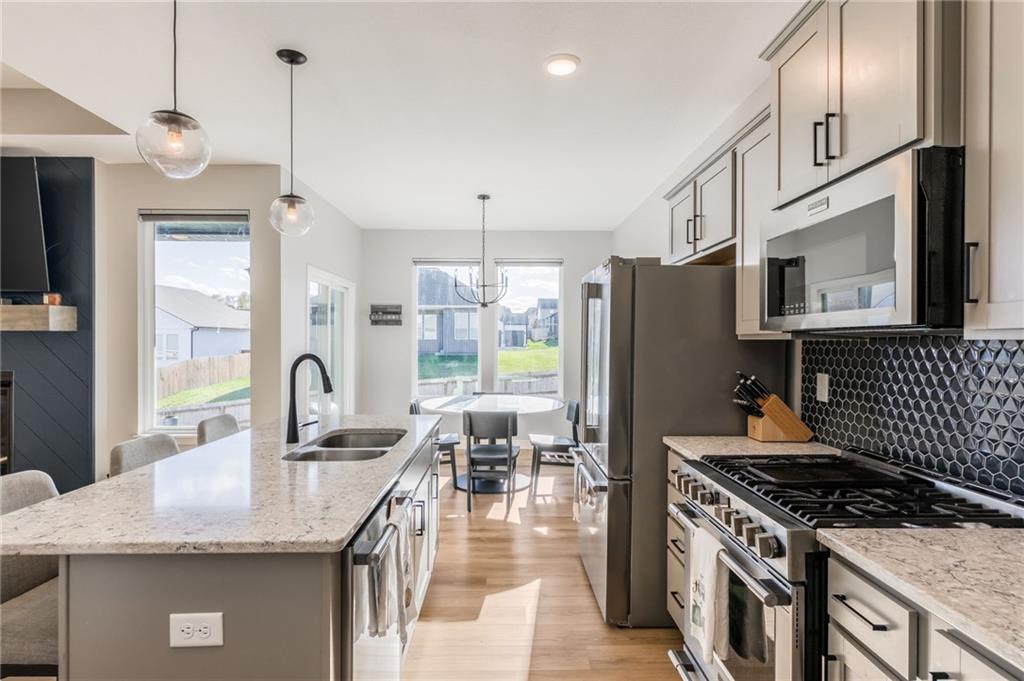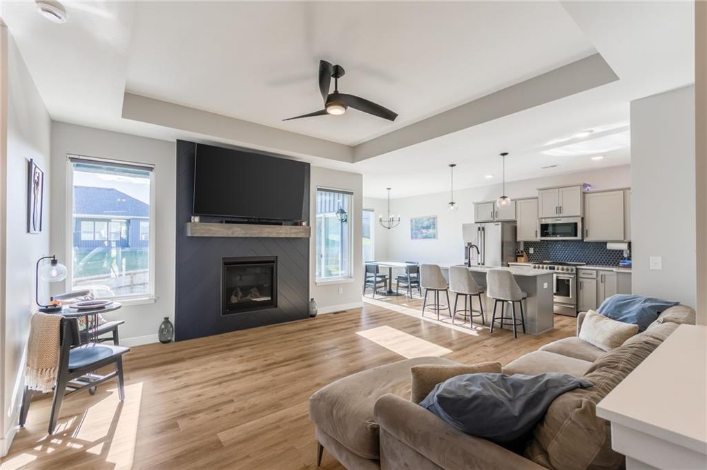 Three bedrooms upstairs in this new ranch, a 4th bed and bathroom downstairs. All high end LVP flooring on both levels. Smart finish upgrades. The walls have the smooth, pure look of fresh flat paint but it's a very high-end wipeable matte. Other choices that set this nearly new house apart are the extended rear porch slab, the high grade of appliances (gas range included, air fryer option in both microwave and oven), the door slab accent color, the wainscot and tile accent wall in the mudroom/laundry room, and two charging receptacles in the garage for EVs. Backyard is fully fenced. Come see a rare 'bedrooms up' ranch with a near zero maintenance exterior and an upgraded kitchen. Quiet neighborhood connects to the Line Creek trail system. Quick access to hwys between I-29 and 169 make this house ideal for errands or commuters. Other upgrades: Smart blinds in master and common areas, all installed blinds match style. Natural gas quick connect line for the covered porch, sturdier panty shelving, higher grade quartz selection on counter tops throughout, tile bathrooms. And of course, the finished rec-room, bathroom and day-lit bedroom in basement. Walk in pantry, walk in closets upstairs and down.