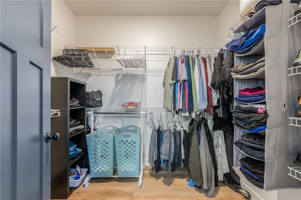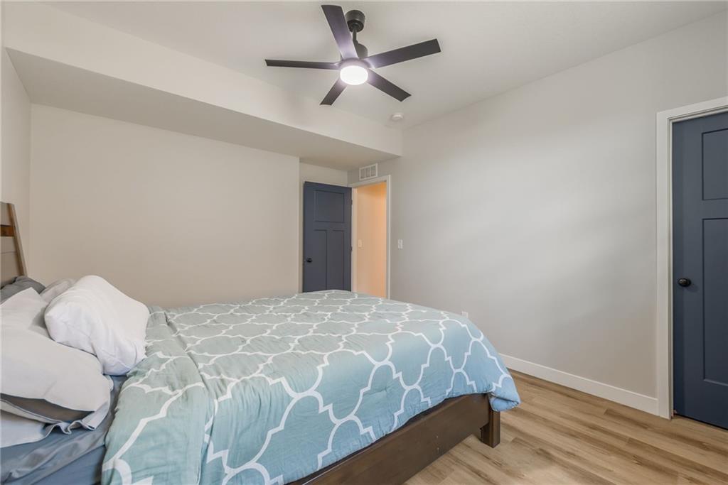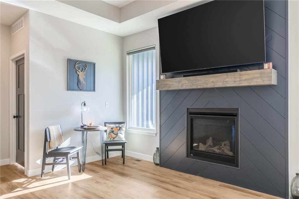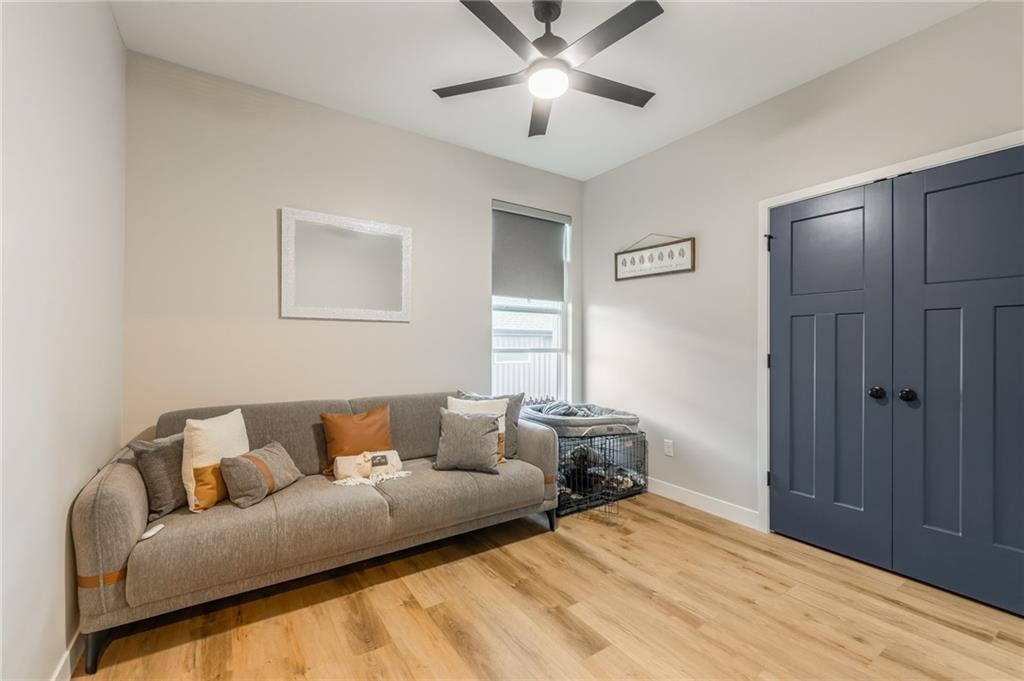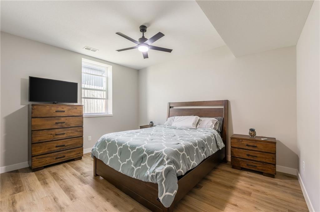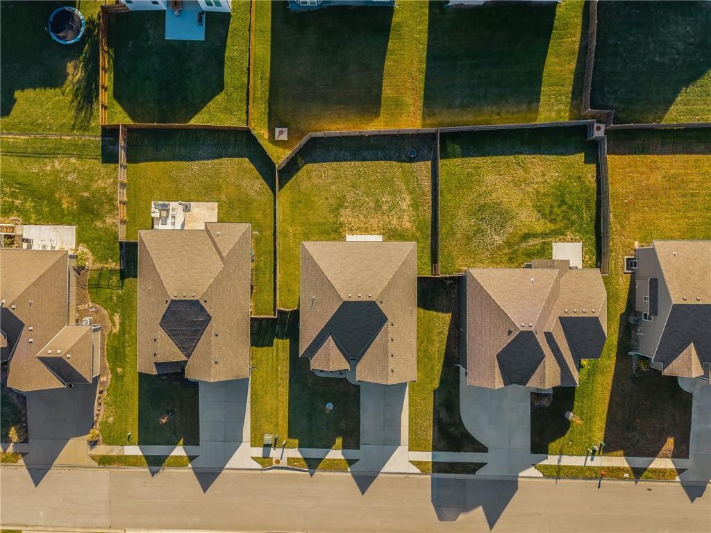Three bedrooms upstairs in this new ranch, a 4th bed and bathroom downstairs. All high end LVP flooring on both levels. Smart finish upgrades. The walls have the smooth, pure look of fresh flat paint but it's a very high-end wipeable matte. Other choices that set this nearly new house apart are the extended rear porch slab, the high grade of appliances (gas range included, air fryer option in both microwave and oven), the door slab accent color, the wainscot and tile accent wall in the mudroom/laundry room, and two charging receptacles in the garage for EVs. Backyard is fully fenced. Come see a rare 'bedrooms up' ranch with a near zero maintenance exterior and an upgraded kitchen. Quiet neighborhood connects to the Line Creek trail system. Quick access to hwys between I-29 and 169 make this house ideal for errands or commuters. Other upgrades: Smart blinds in master and common areas, all installed blinds match style. Natural gas quick connect line for the covered porch, sturdier panty shelving, higher grade quartz selection on counter tops throughout, tile bathrooms. And of course, the finished rec-room, bathroom and day-lit bedroom in basement. Walk in pantry, walk in closets upstairs and down.