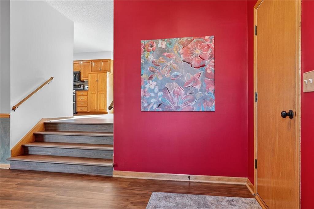 Peaceful Setting in Windmill Springs on an extra-large level (just over an acre!) Lot outside city limits w/no HOA, this 3 Bedroom, 2.5 Bath home offers flexible space for daily living. Entry features a vaulted ceiling, coat closet, & all-new LVP on the main level. The Great Room centers on a masonry brick Fireplace w/oak mantle & brick hearth, 17' Vaulted Ceiling, custom-blind Windows on two sides, library panel to chair rail, Ceiling Fan, & LVP. The Eat-In Kitchen includes black granite Countertops, ceramic tile Backsplash, oak raised-panel Cabinets, under-cabinet lighting, a corner composite farmhouse Sink framed by dual Windows, & a Pantry w/adjustable shelves. Stainless Appliances: Electric Range, Dishwasher & Refrigerator; black Built-In Microwave. Dining opens to a Composite Deck w/aluminum railing that steps to the Backyard. Main-level Laundry offers cabinets & extra storage. A Half Bath is conveniently located on the main level. Upstairs, the Primary Bedroom connects to a Flex Space/Office. The Primary Bathroom features two vanities, an upgraded cultured marble Shower w/glass doors & built-ins, and generous linen storage. Two additional Bedrooms are connected by a Full Bath. A T-shaped Hallway overlooks the Great Room & includes a built-in linen cabinet. The Front-Entry Garage is extra deep for vehicles(3 cars fit), gear, or workshop use, offering insulated Doors w/openers, finished walls & ceiling, over-nine-foot Ceiling height, built-in shelving, work bench, a side Window, & walkout access to the Backyard. Lower Level provides daylight Windows, tall ceilings, storage, & future finish potential. Systems include a Lennox heat pump & a Rheem water heater. Outdoor living adds a fenced garden area, mature trees, a fire-pit, a long concrete Driveway, & a quiet Cul-de-Sac setting. Served by Blue Valley School District. Everyday needs are close by across south Johnson County w/ quick connections to US-69 & 179th Street for commuting, parks, & community amenities.